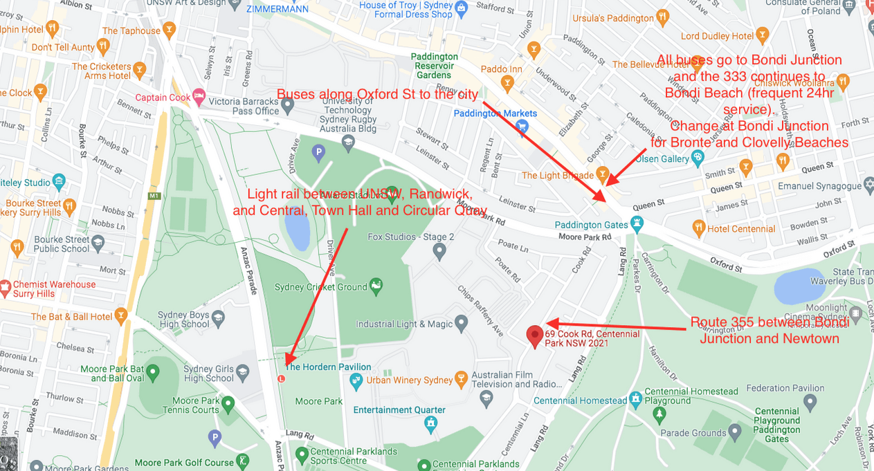 It's well located between the city and eastern beaches. Oxford St Paddington is 7 mins walk, with its Saturday market, pubs, buzz and 24hr bus transport. The magnificent Centennial Park is around the corner. The Entertainment Quarter and the sporting precinct of the Sydney Cricket Ground and Sydney Football Stadium are also within walking distance.