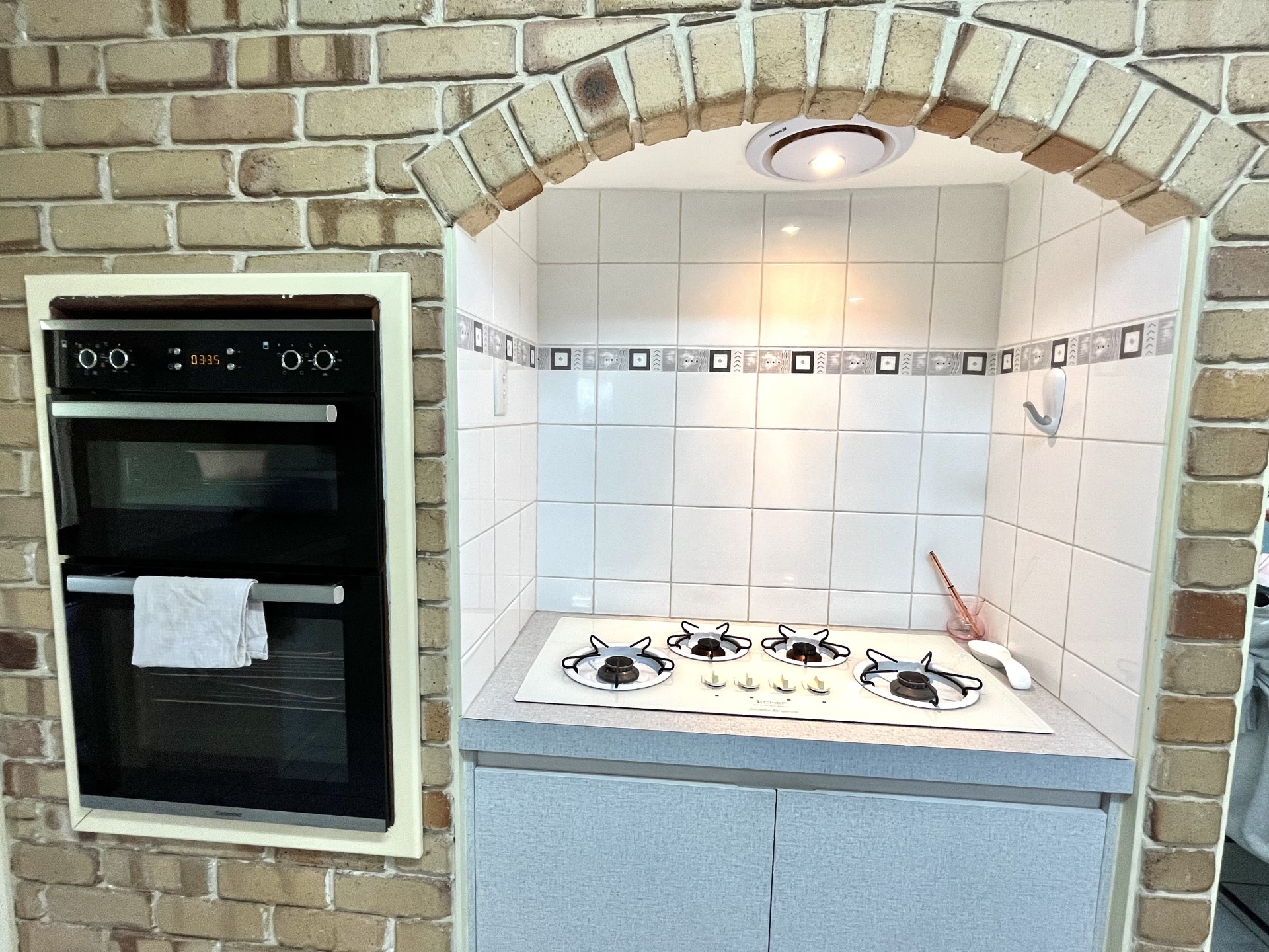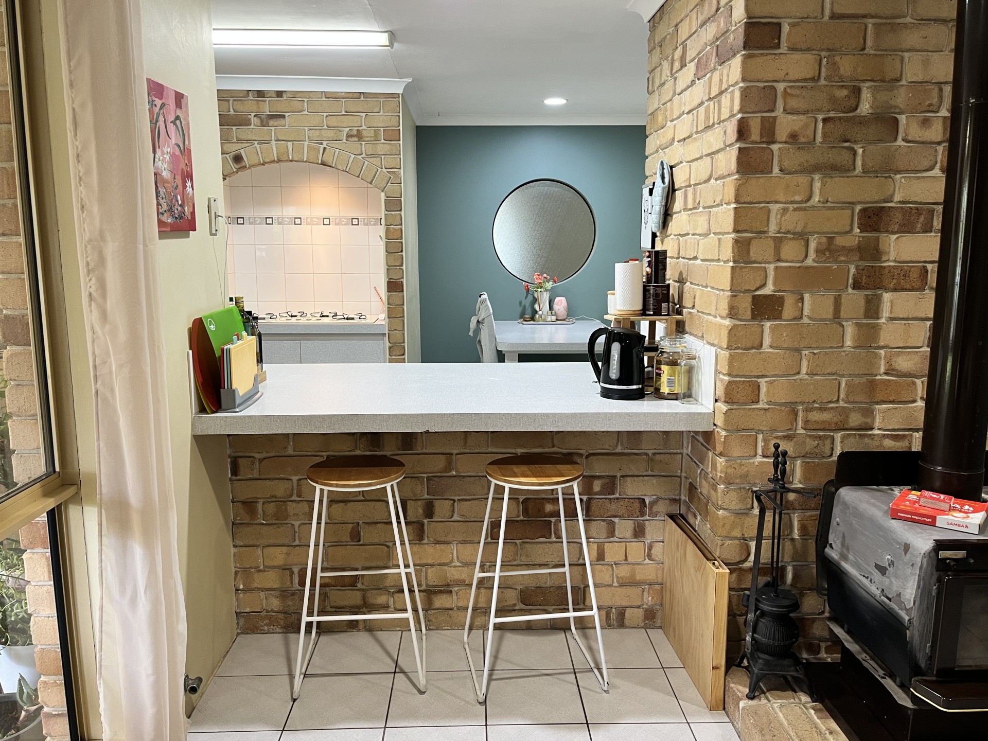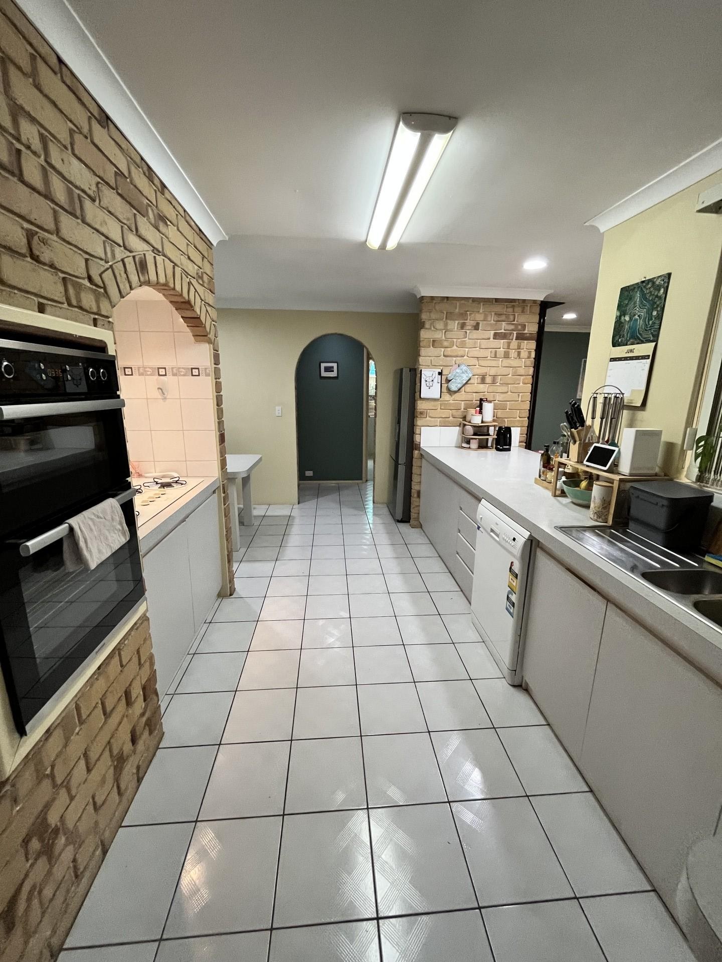 The large kitchen space houses a breakfast bar, built in dining table, gas cook top stove, modern oven and an abundance of cupboards.