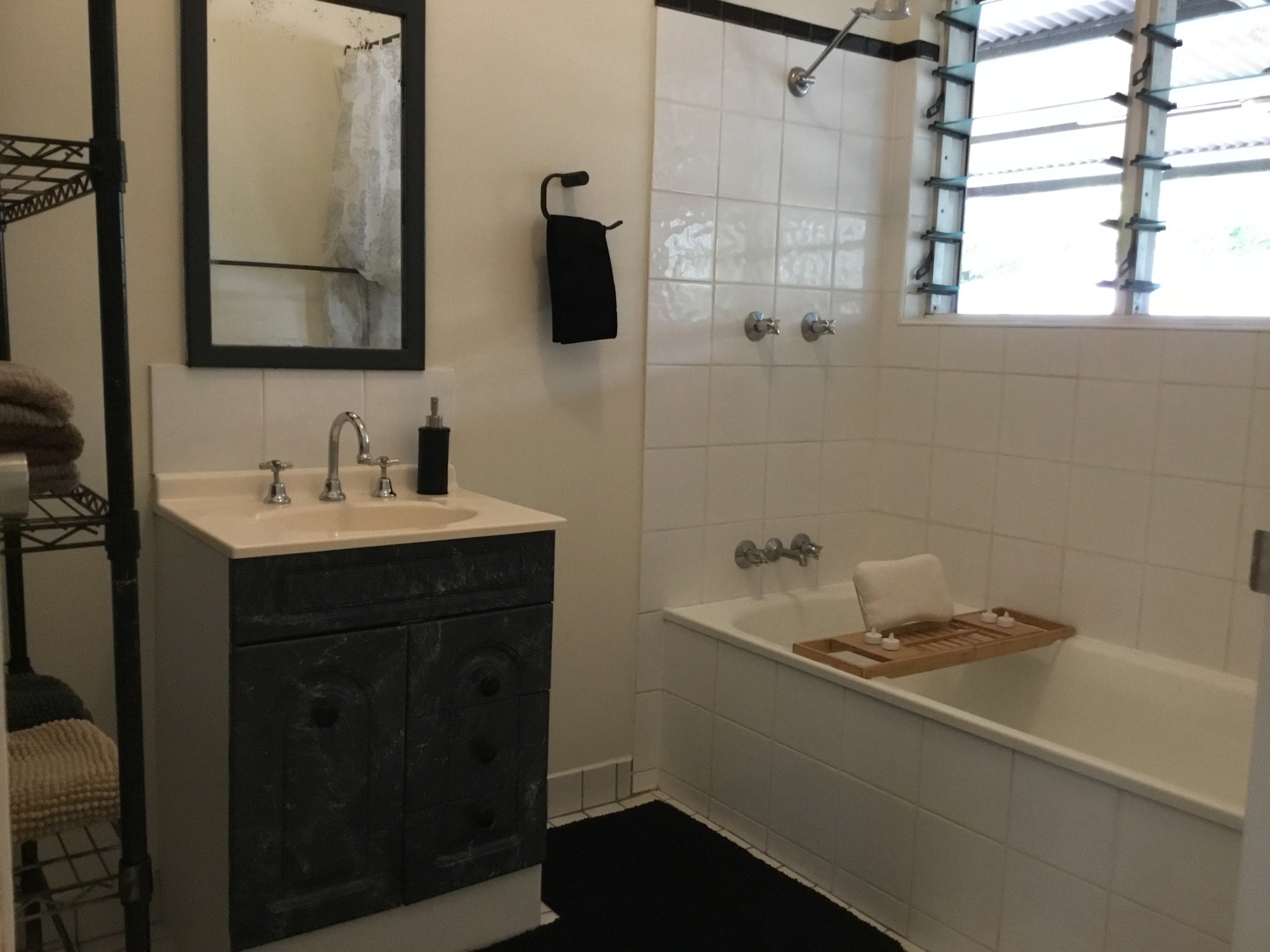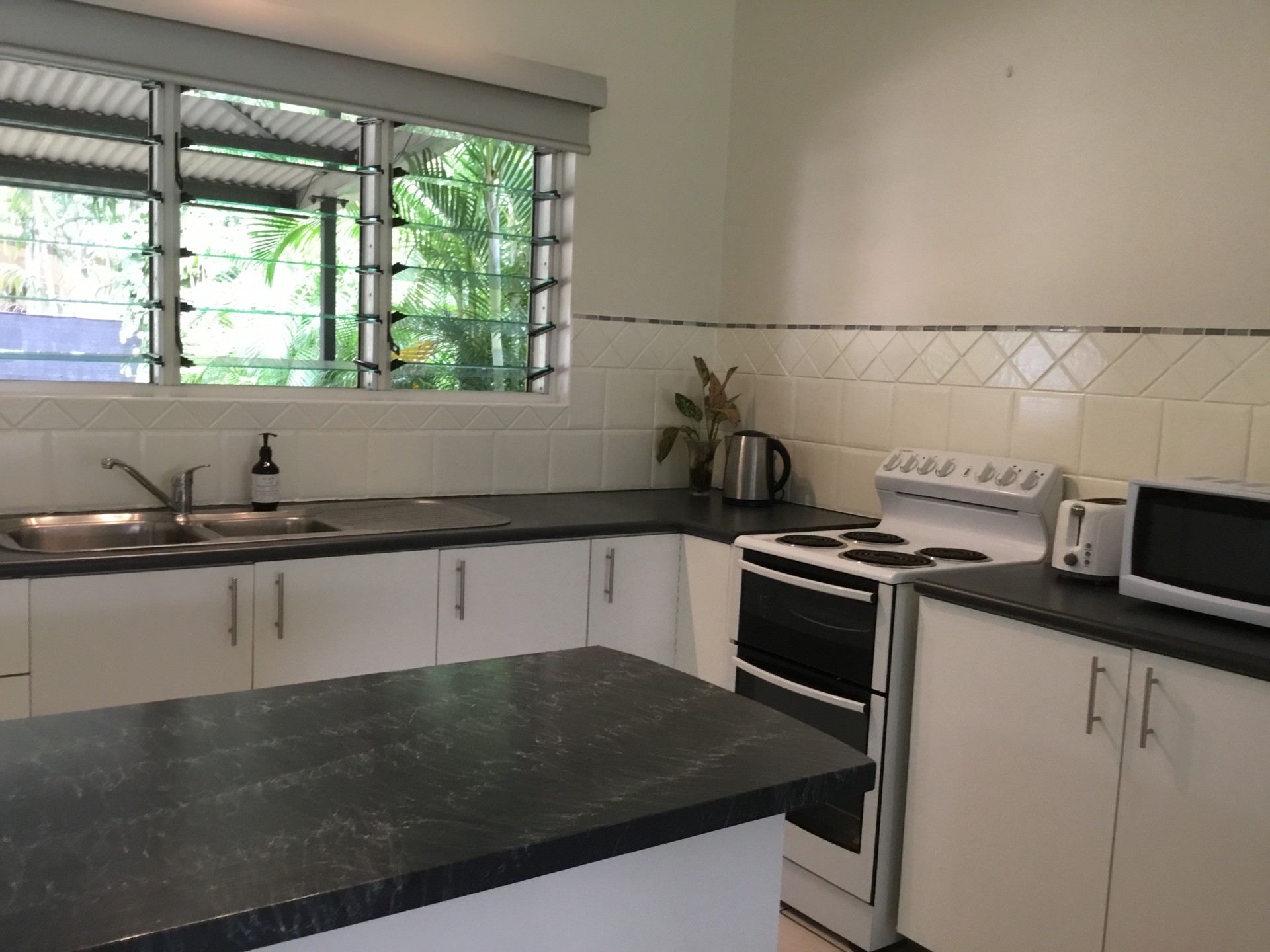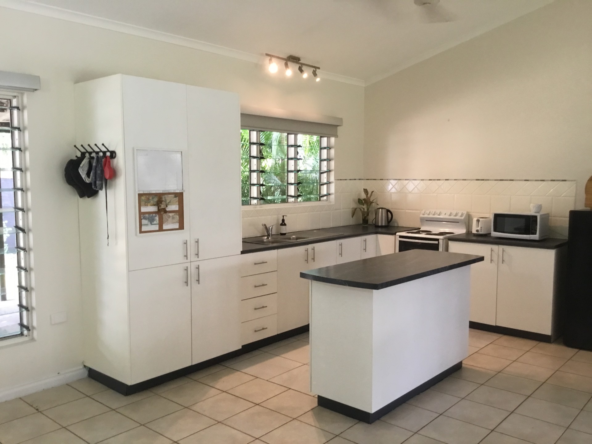 Tropical, spacious open plan home with high cathedral ceilings and louvred windows throughout with lots of storage.