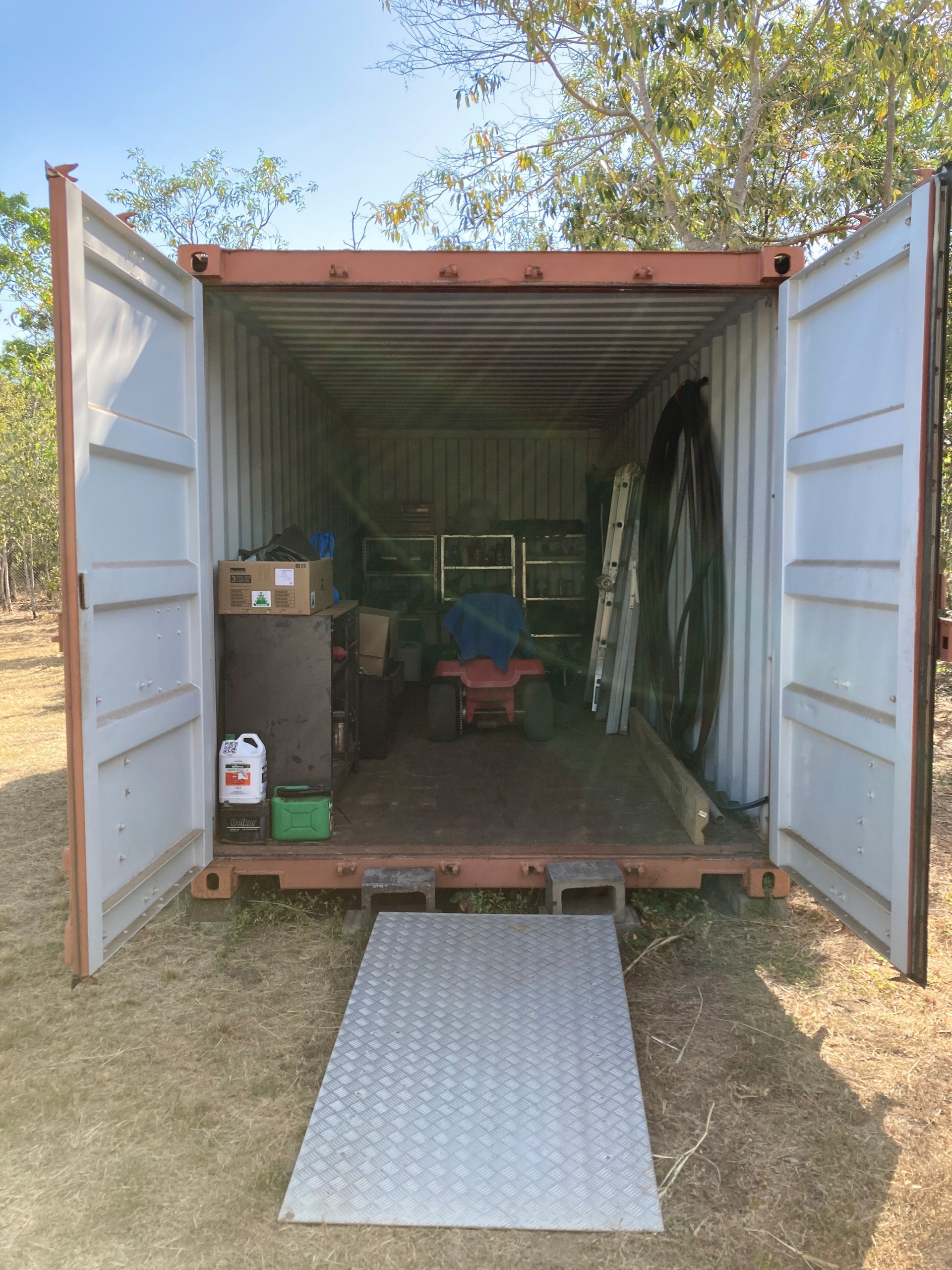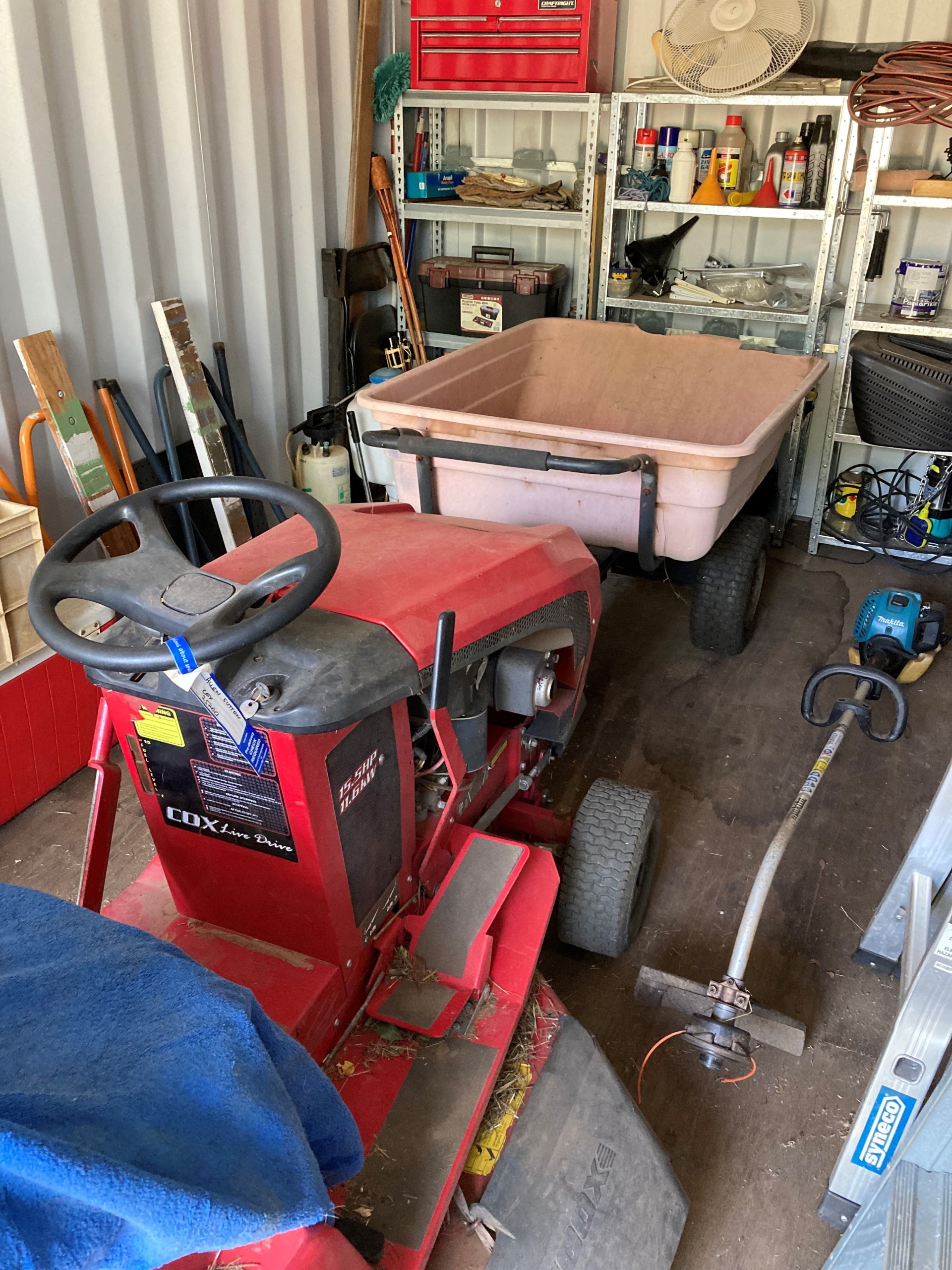 * 20' storage container in excellent condition (no leaks) with ride on cox mower (runs perfectly) and tools etc.