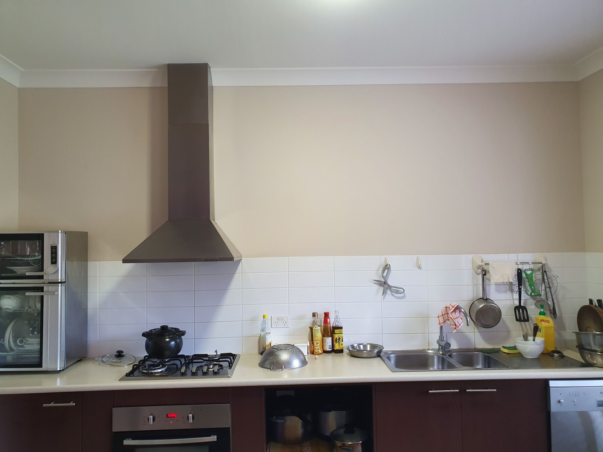- Kitchen with gas cooking, stainless steel appliances, benchtops, a range hood, breakfast bar plus a large built-in pantry.