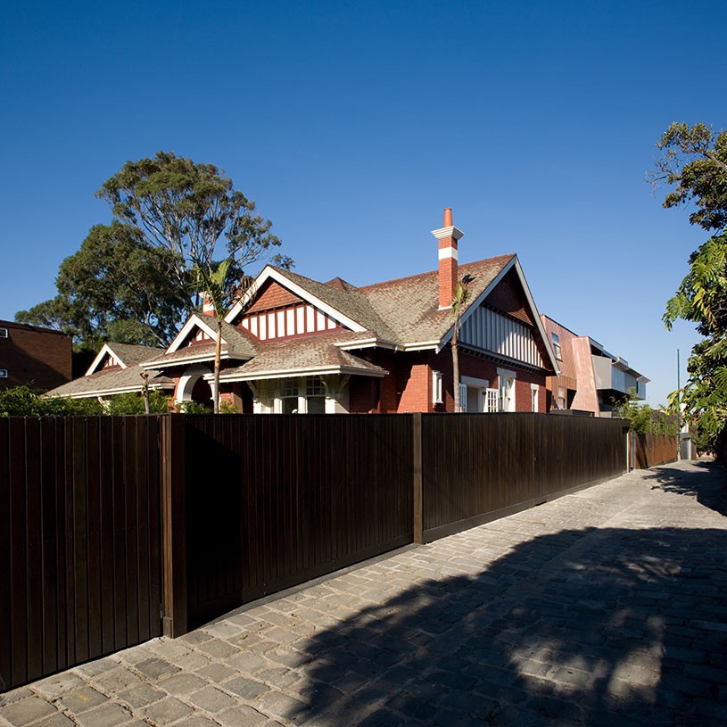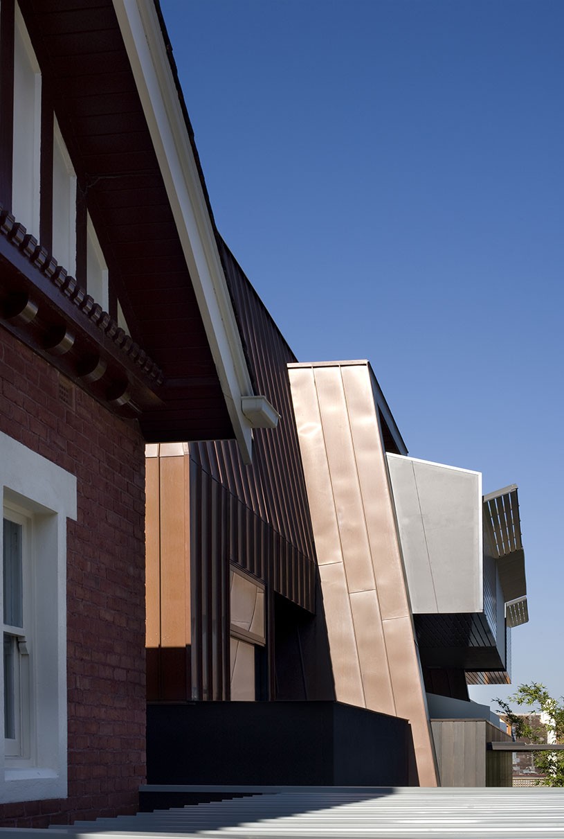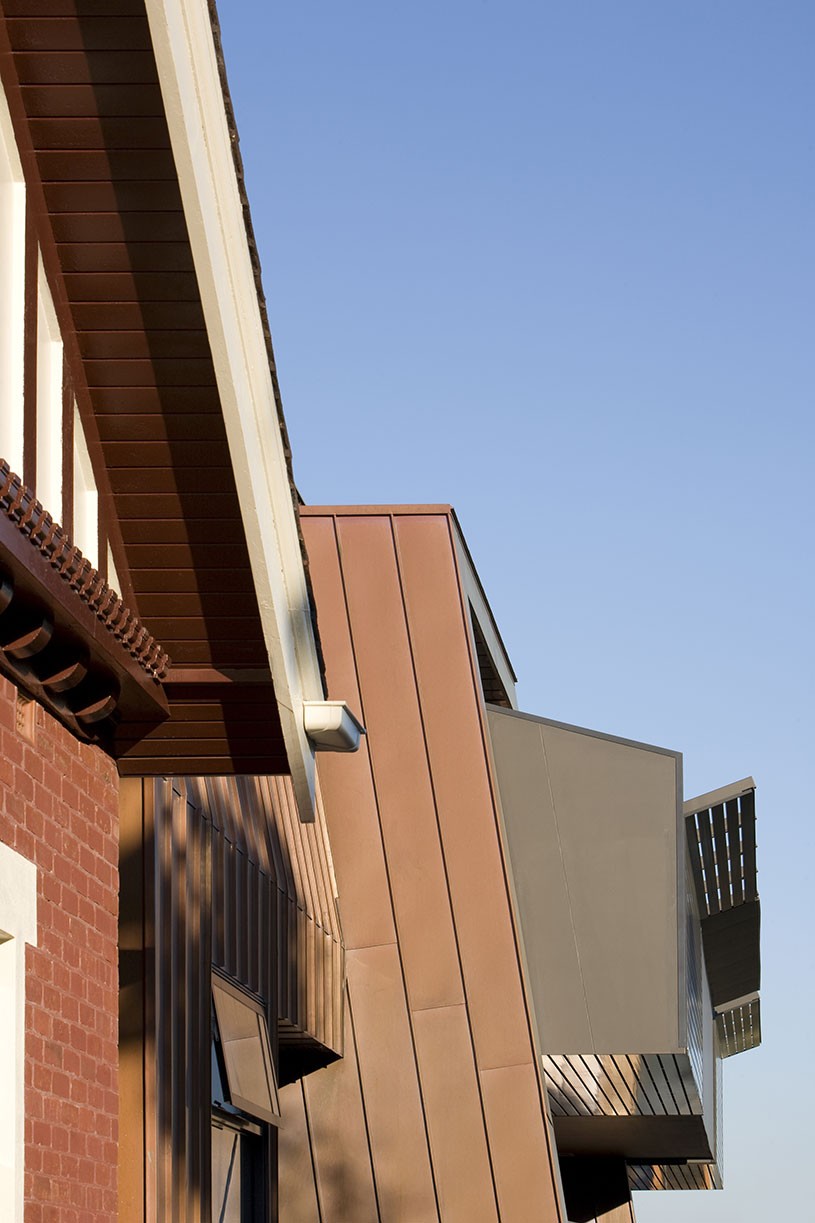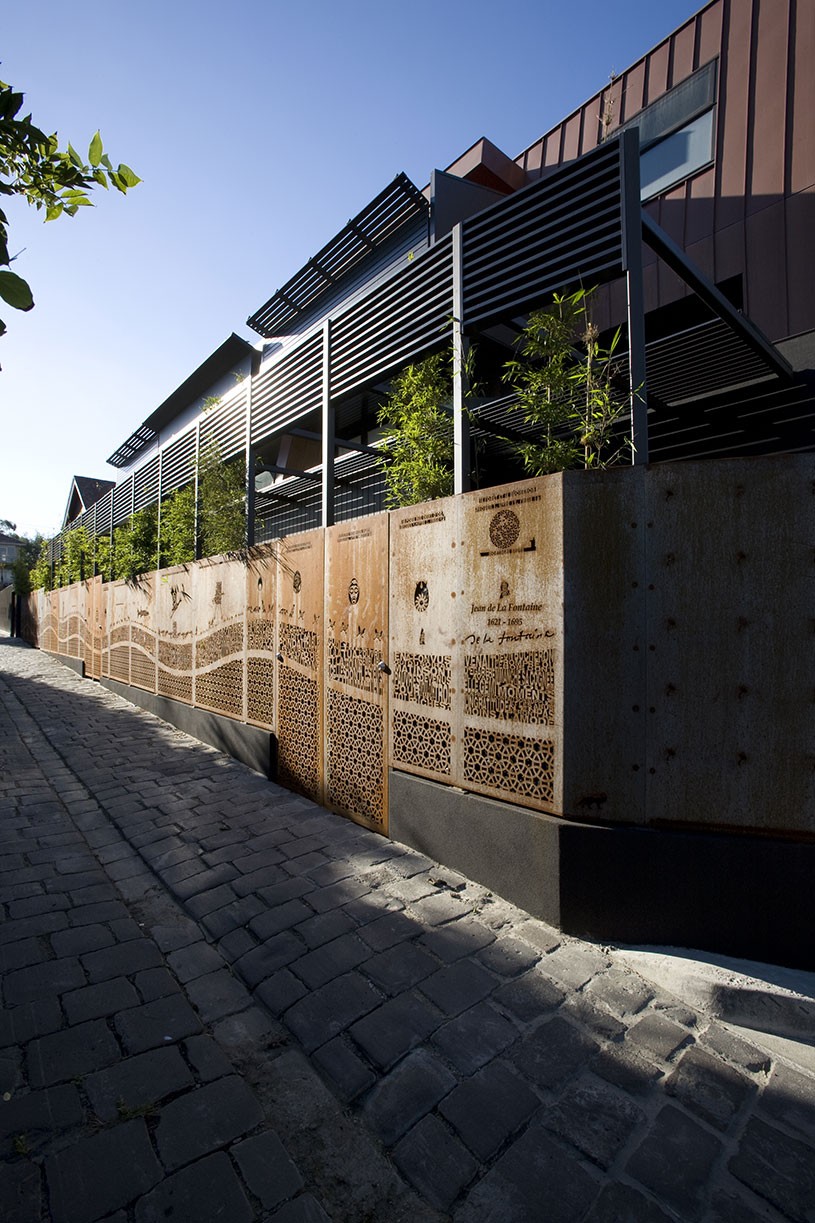 A heritage mansion formerly occupied by Alliance Francaise School was retained, restored and converted into two townhouses and the car park at the rear was developed with a new three-level apartment building. The entry to the new building is through the original arched heritage entryway via a panelled 'ante room', which then breaks into the new building at the rear, creating a rich contrast of heritage and modern design. Copper and timber cladding and angled wall planes compliment the colour and texture of the original brick and terracotta-roofed home featuring an uncompromising contrast of styles and form. A laser-cut art installation along the fence to the laneway designed by Martin Hodge provides screening as well as activating with the public.