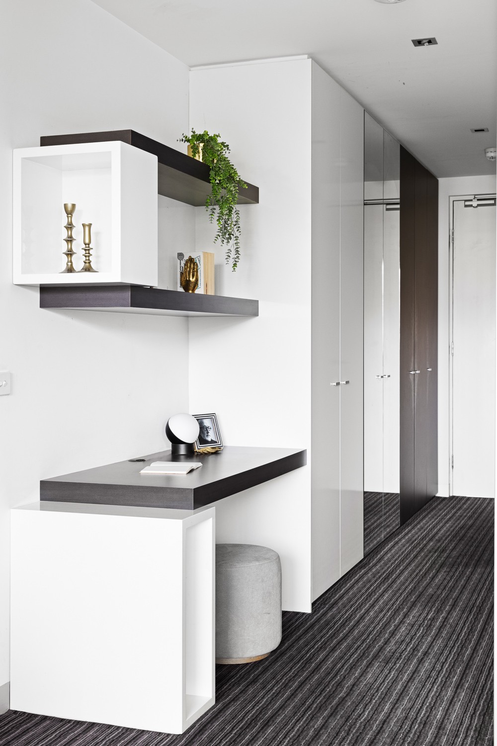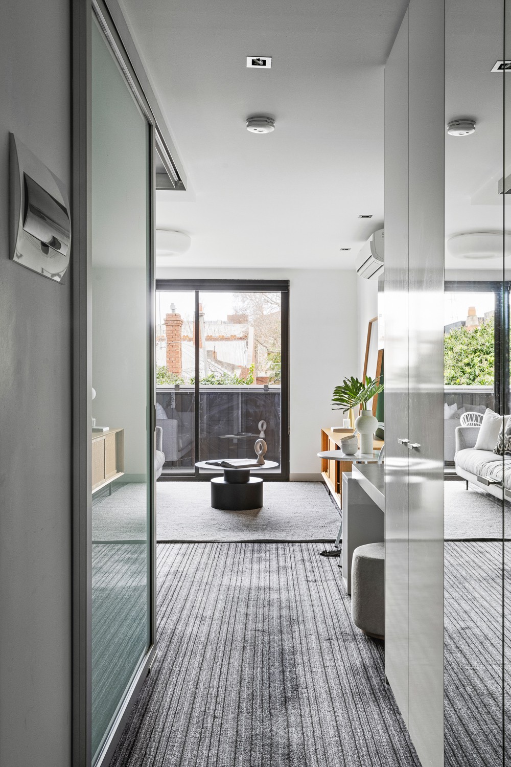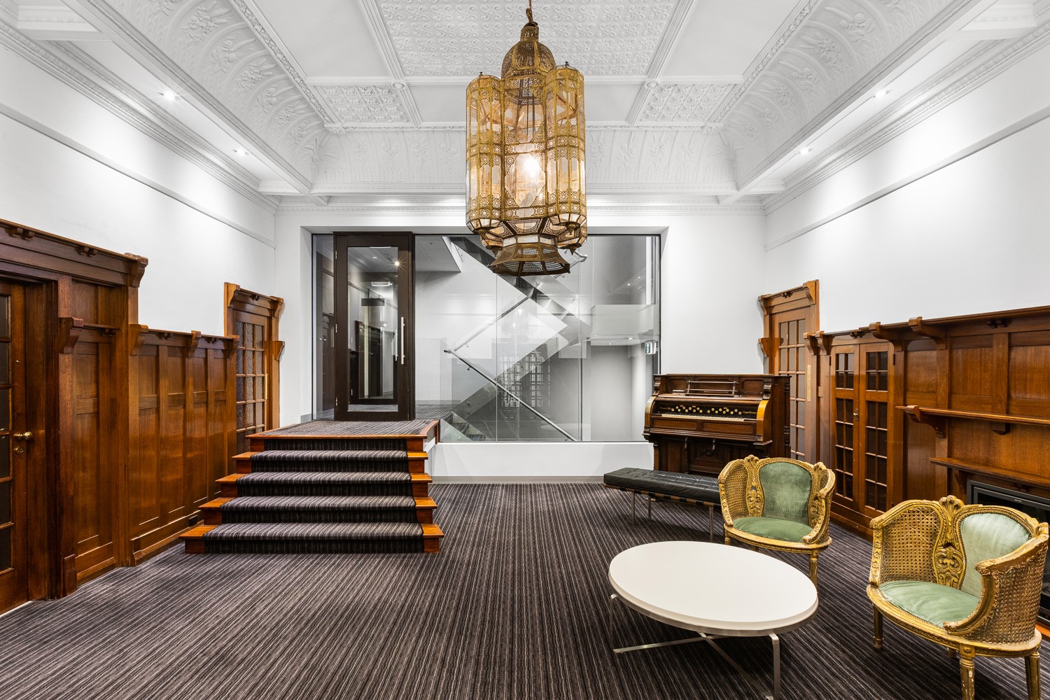 A heritage mansion formerly occupied by Alliance Francaise School was retained, restored and converted into two townhouses and the car park at the rear was developed with a new three-level apartment building. The entry to the new building is through the original arched heritage entryway via a panelled 'ante room', which then breaks into the new building at the rear, creating a rich contrast of heritage and modern design. Copper and timber cladding and angled wall planes compliment the colour and texture of the original brick and terracotta-roofed home featuring an uncompromising contrast of styles and form. A laser-cut art installation along the fence to the laneway designed by Martin Hodge provides screening as well as activating with the public.