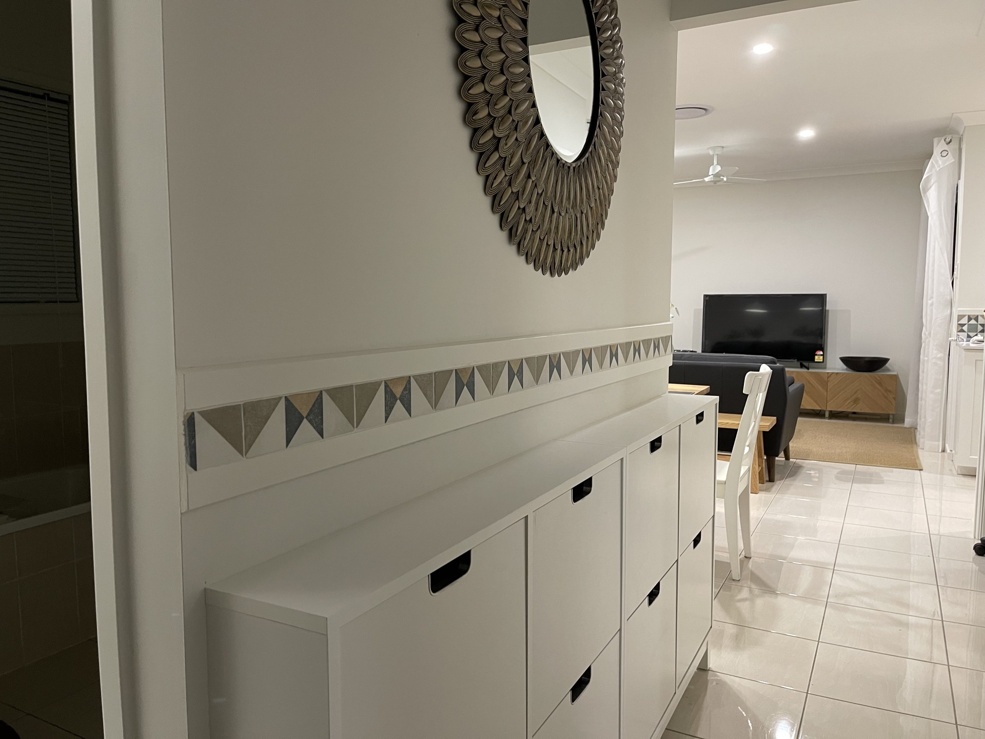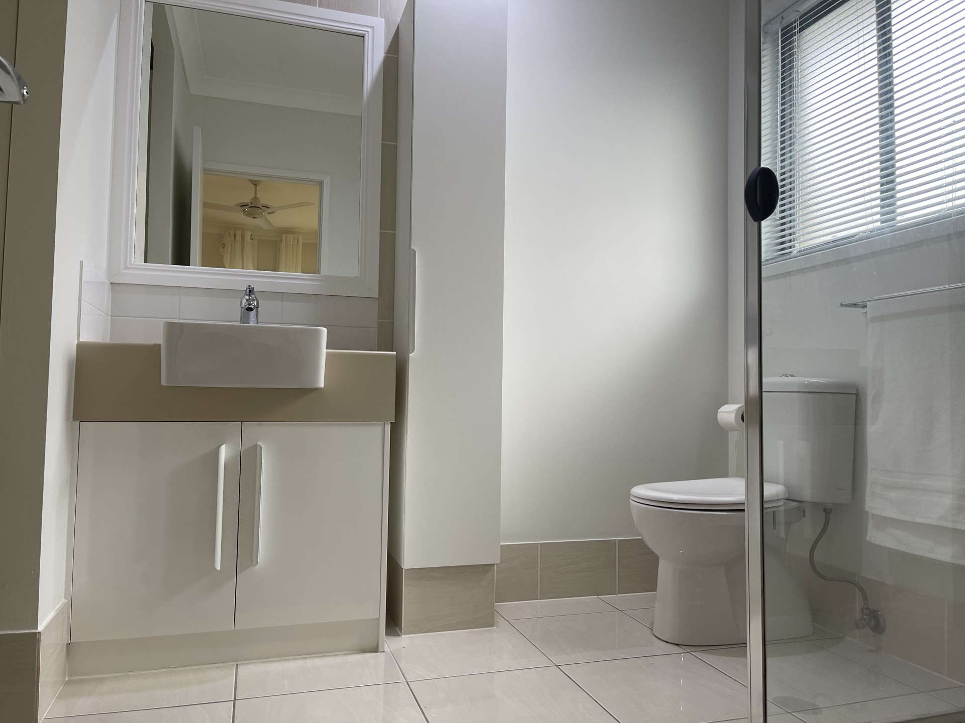 • A large ENSUITE with an ADDITIONAL tall, slim cabinet so that all toiletries can be on hand and stored away.