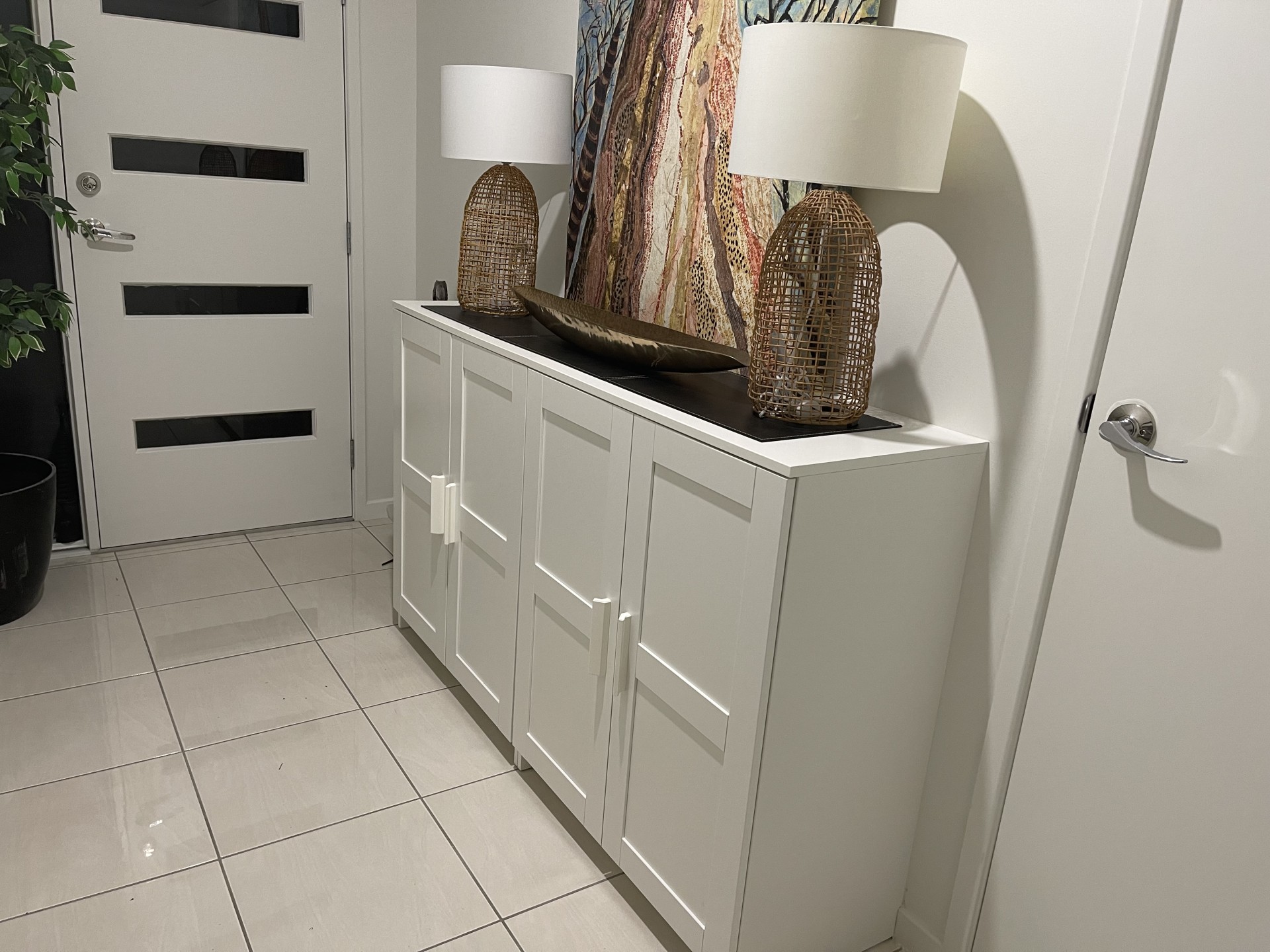 • A large entry hall with two classic white CABINETS which provide extra space for linen storage.