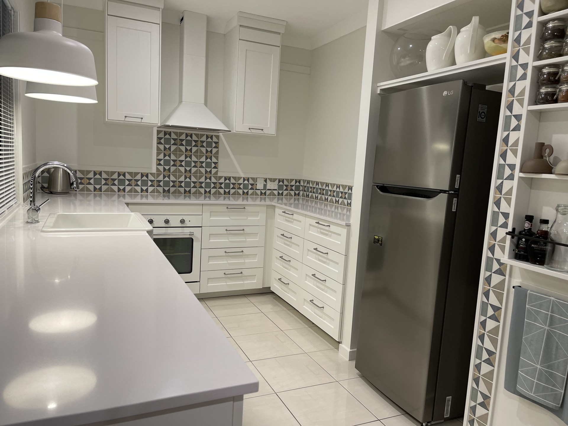 • A NEW KITCHEN with state-of-the-art built-in appliances, PANTRY DRAWERS and a cute SPICE RACK. An extra LARGE FRIDGE RECESS, BUILT IN MICROWAVE, INDUCTION HOB, a FABULOUS DISHWASHER, and a lovely BUTLER'S SINK that adds that trendy cottage feel. PENDANT LIGHTS, a WHITE RANGE HOOD, and STONE BENCH TOPS complete the look, while FEDERATION WALL TILES add a traditional touch.