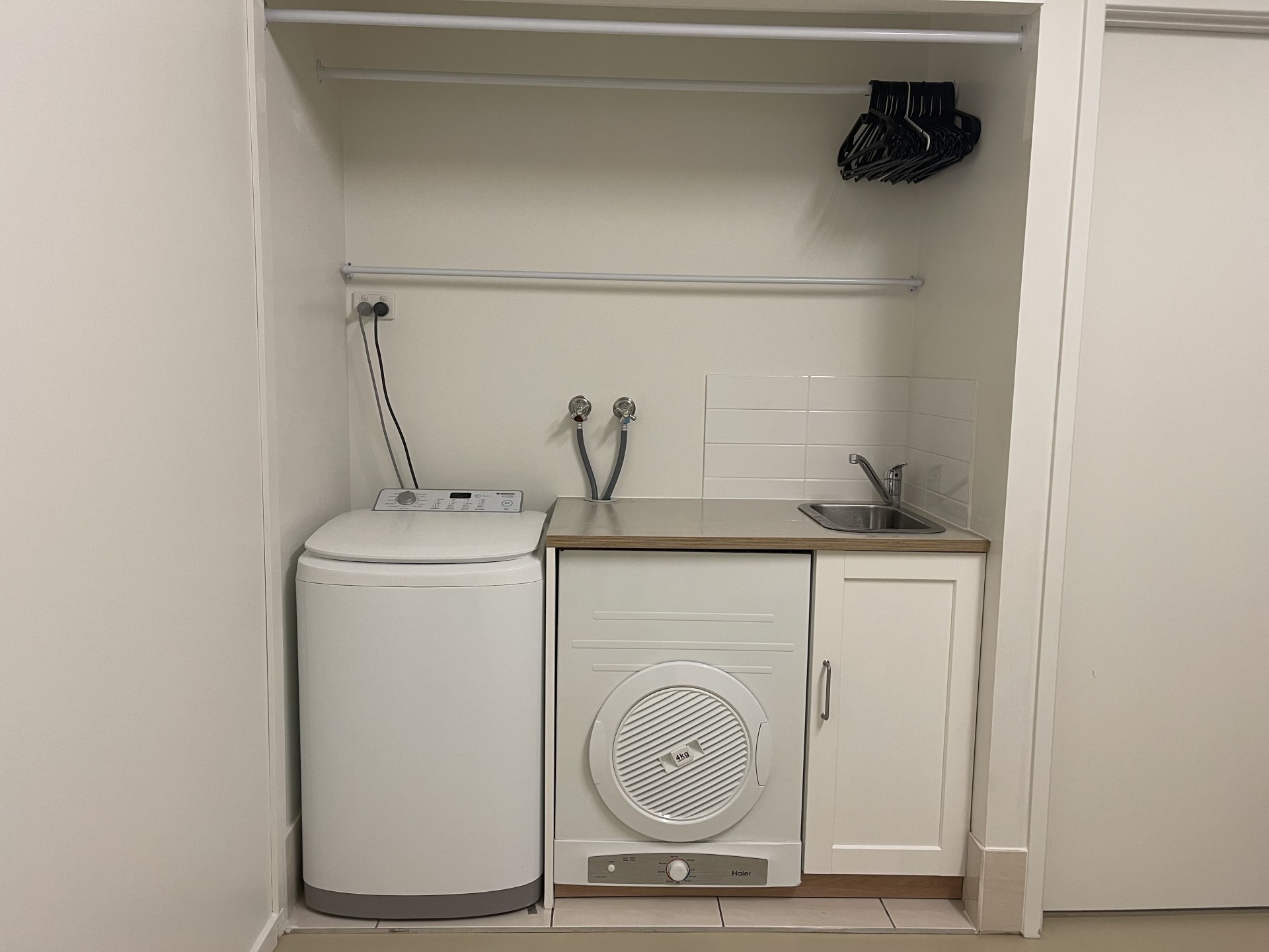 • The laundry space has been upgraded to accommodate a drier, sink and washing machine. Overhead lines in the laundry make indoor hanging easy in inclement weather, while a large outdoor line is available for sunny days.