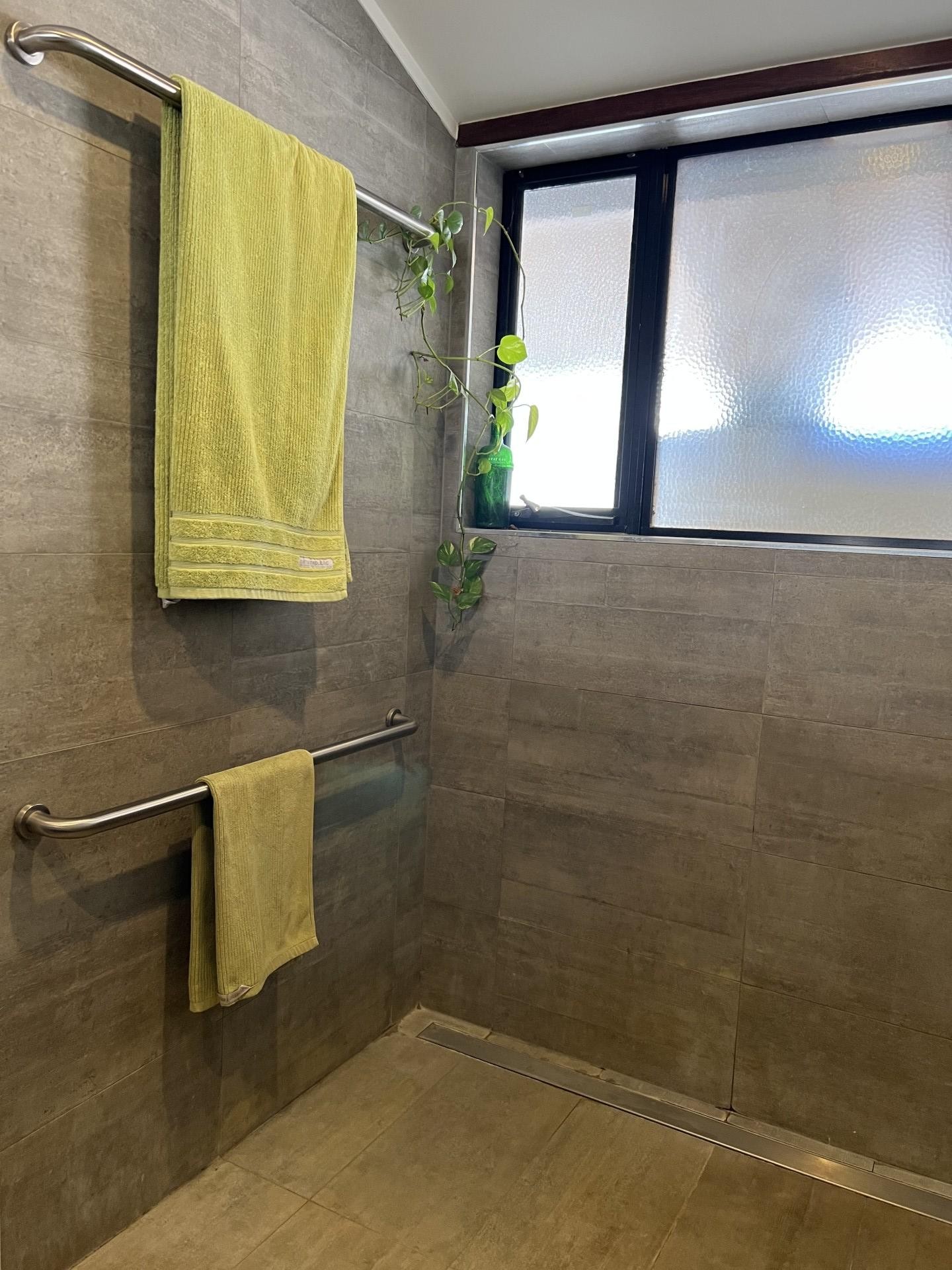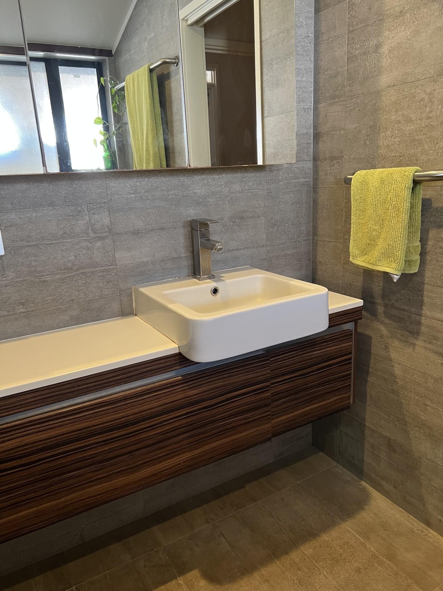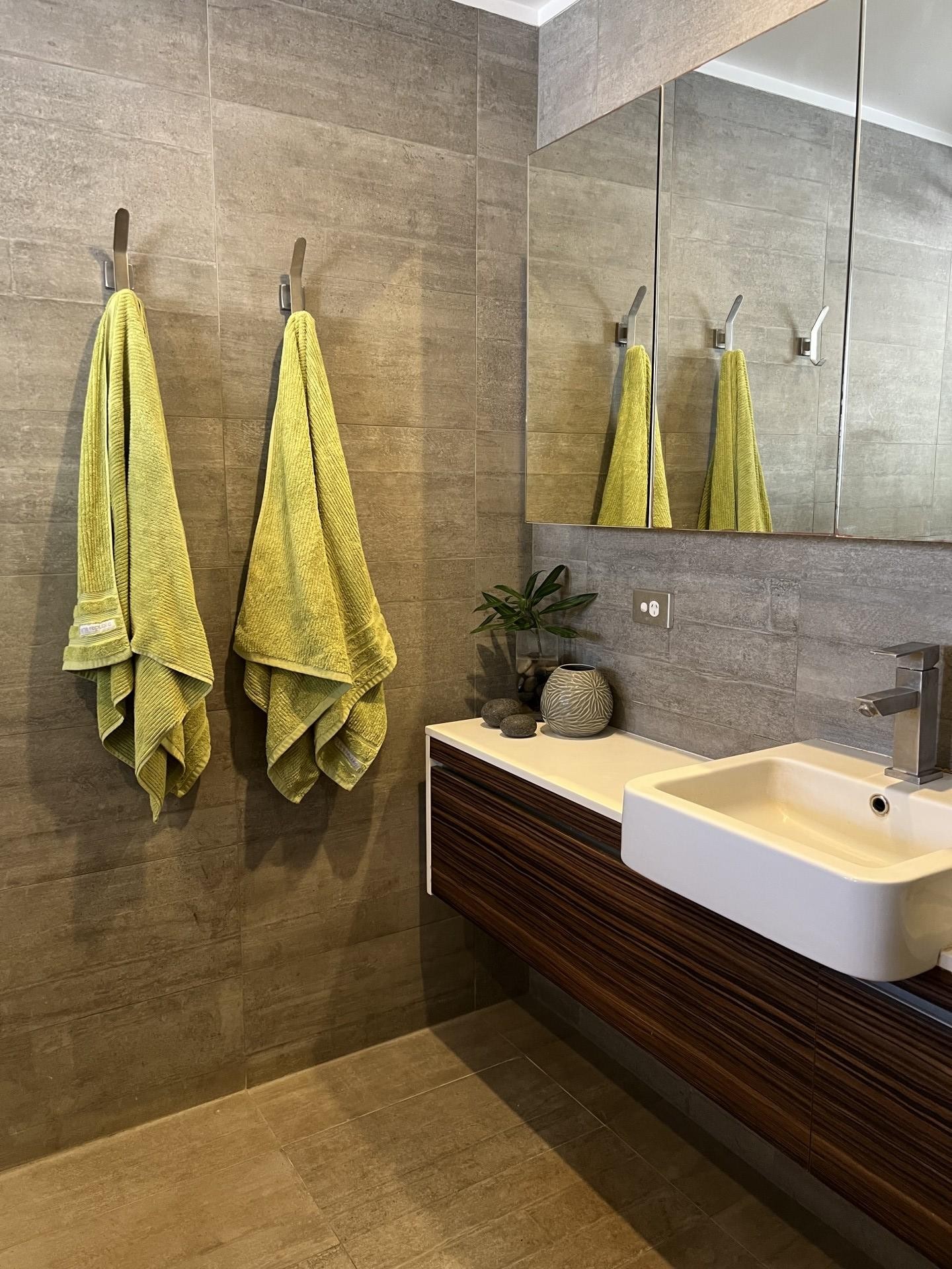 The beautifully appointed shower room features a stainless-steel rain shower, ceiling-to-floor tiling, a large three-door mirror cabinet and quality tapware and vanity.