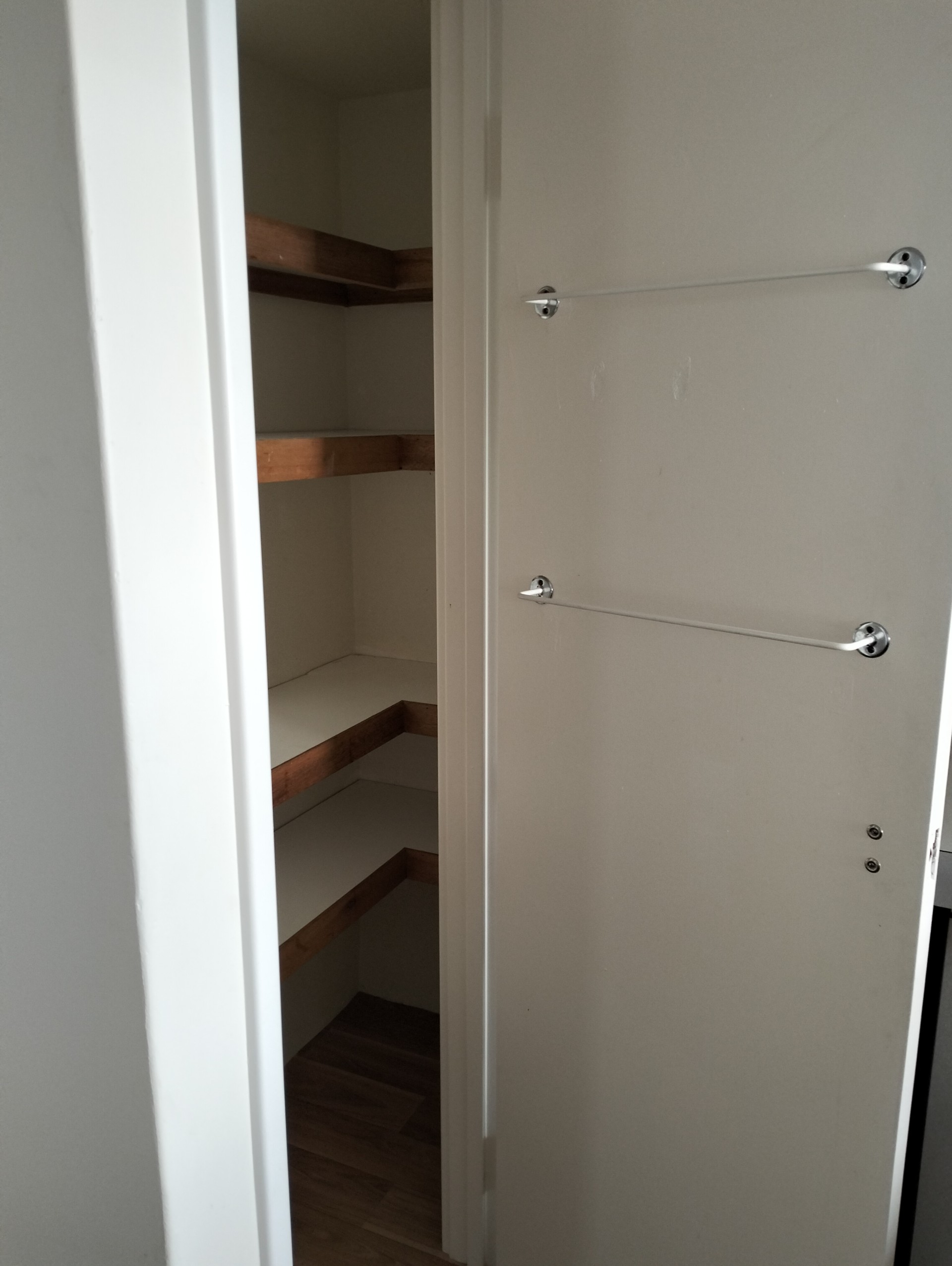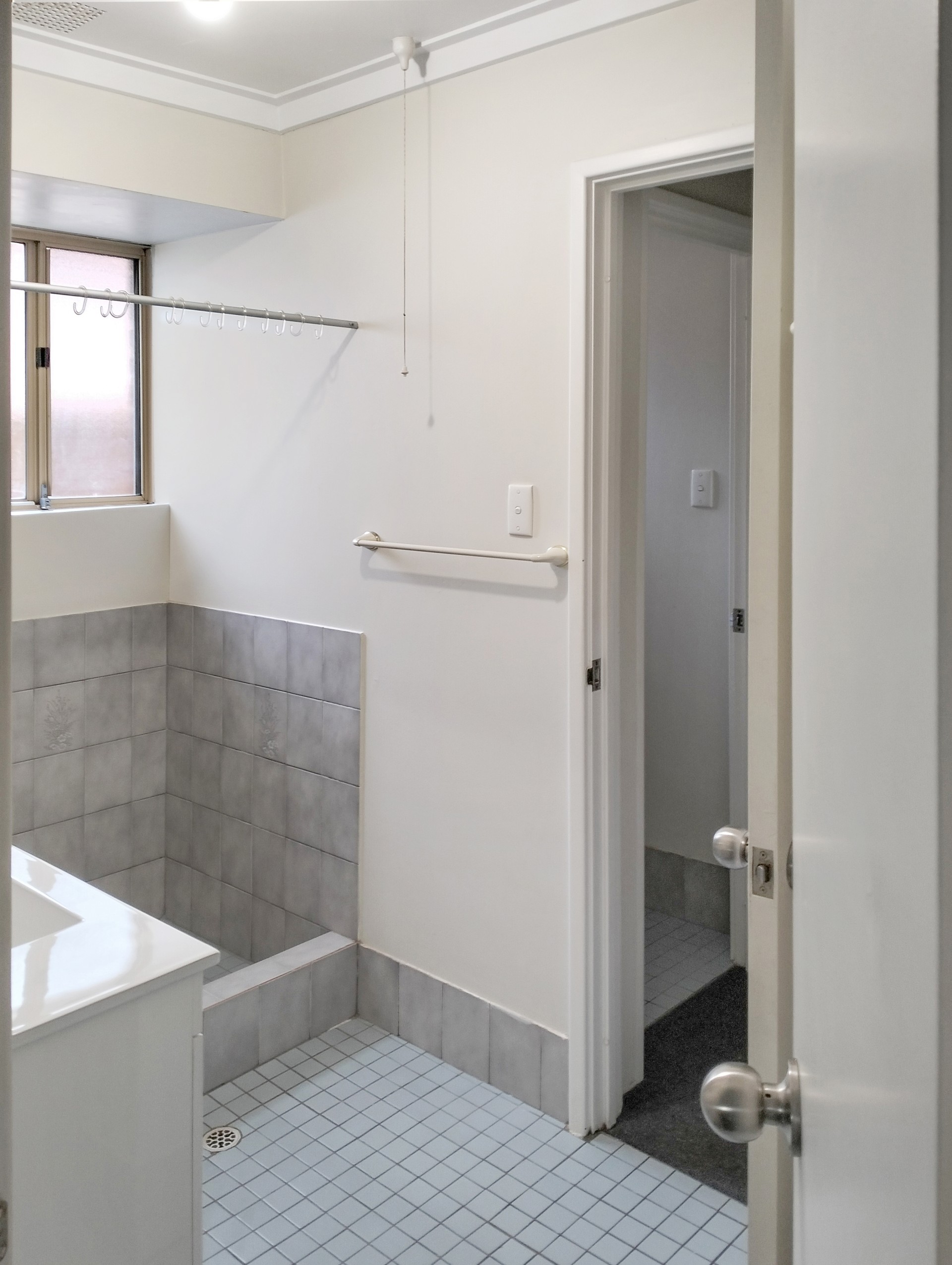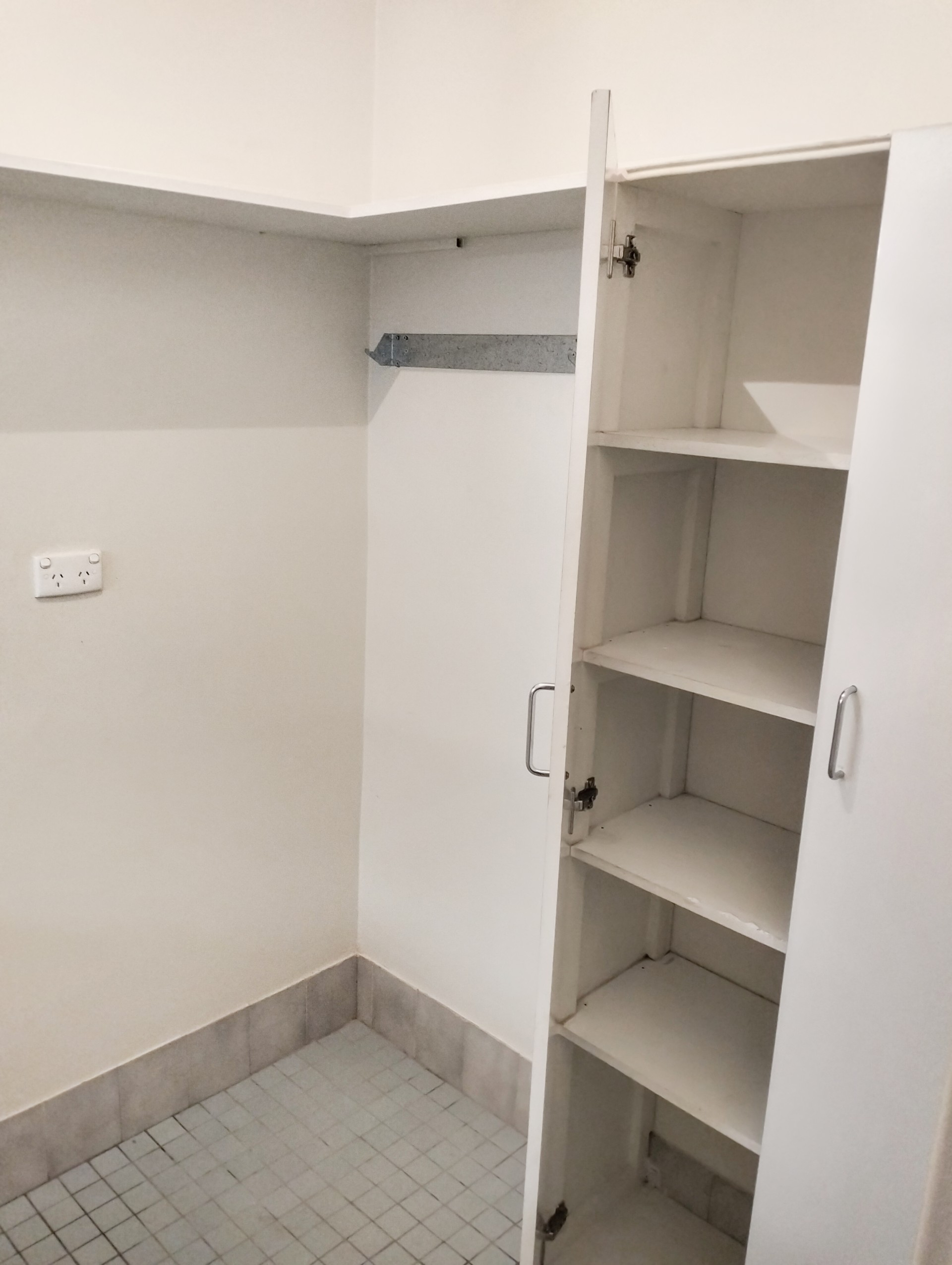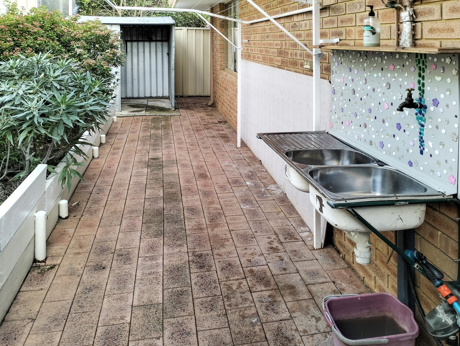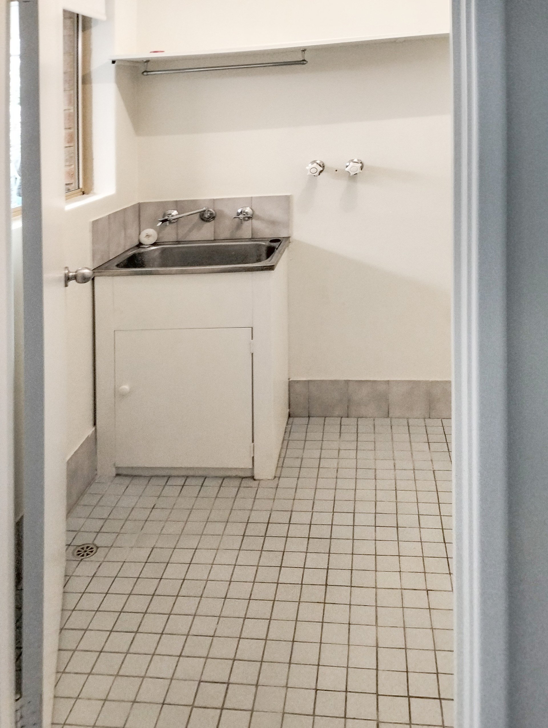 * Laundry with a SS trough, shelved cupboard and a shelf.