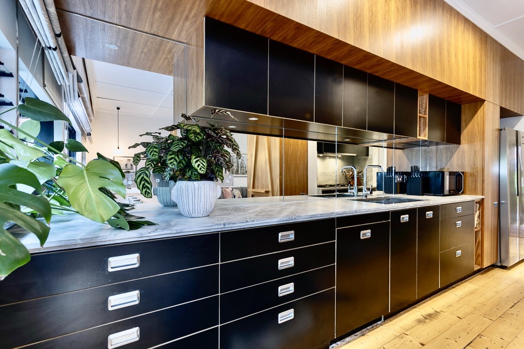 Honed Elba marble bench-tops and kitchen splashbacks (by Arte Domus), original timber floorboards, extended gourmet kitchen with custom joinery, Euro appliances, 900mm cooktop, integrated dishwasher, soaring ceilings in every room, period features, bespoke wardrobes, separate laundry, built-in plumbed stainless steel BBQ, abundant storage plus roof storage, new Daikin ducted heating/airconditioning throughout with mobile remote app; 5.1 wired surround sound to living and dining (optional*), study nook, wireless security camera (optional*), fully automated watering system for the low maintenance & lush designer gardens.
