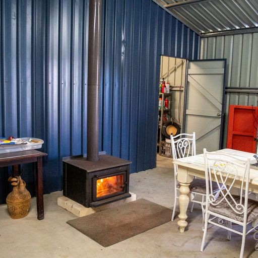 Blue colour- bond shed with two roller doors and a side entry door. Spacious 9 m x 7 m with a wood fire inside. Complete with an internal wall creating two spacious sheds to store and work in.