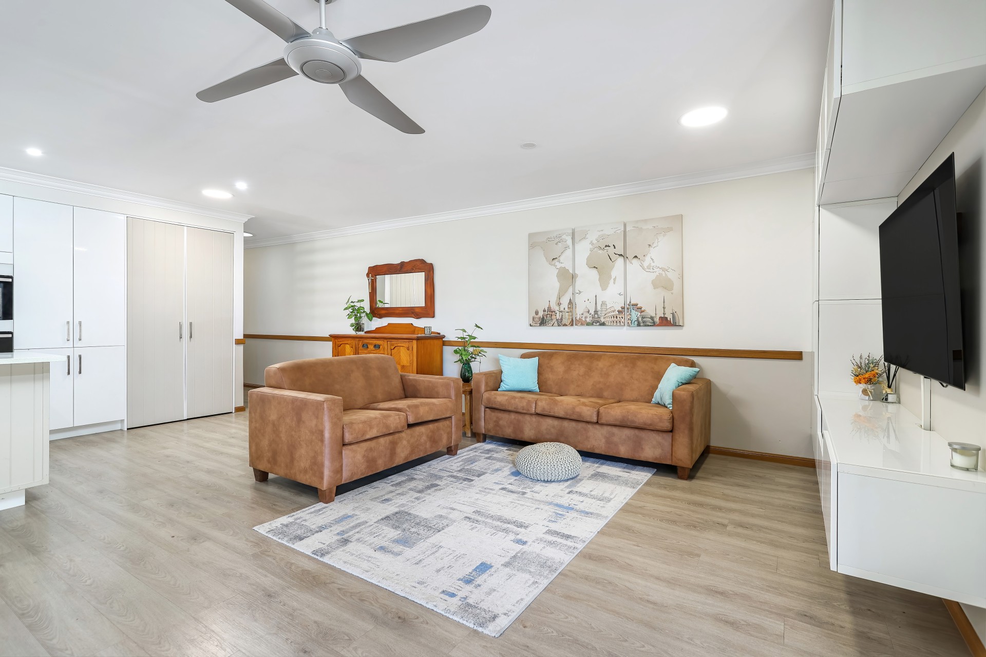 3 large bedrooms with two bathrooms. The main bathroom includes a bathtub and separate shower. Features a beautiful laundry, modern kitchen with dishwasher, solar hot water, air conditioning, beautiful flooring and solar lighting throughout unit. Open plan dining / living areas are very spacious.