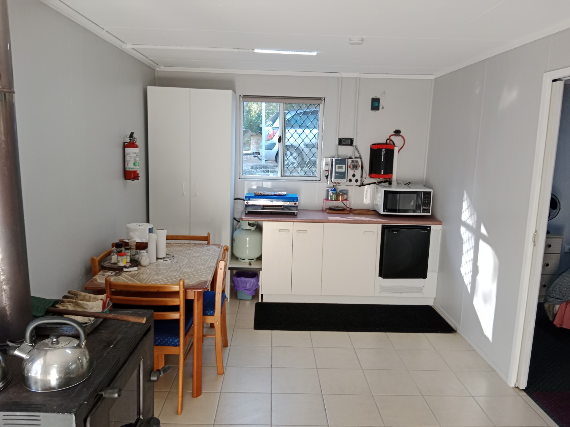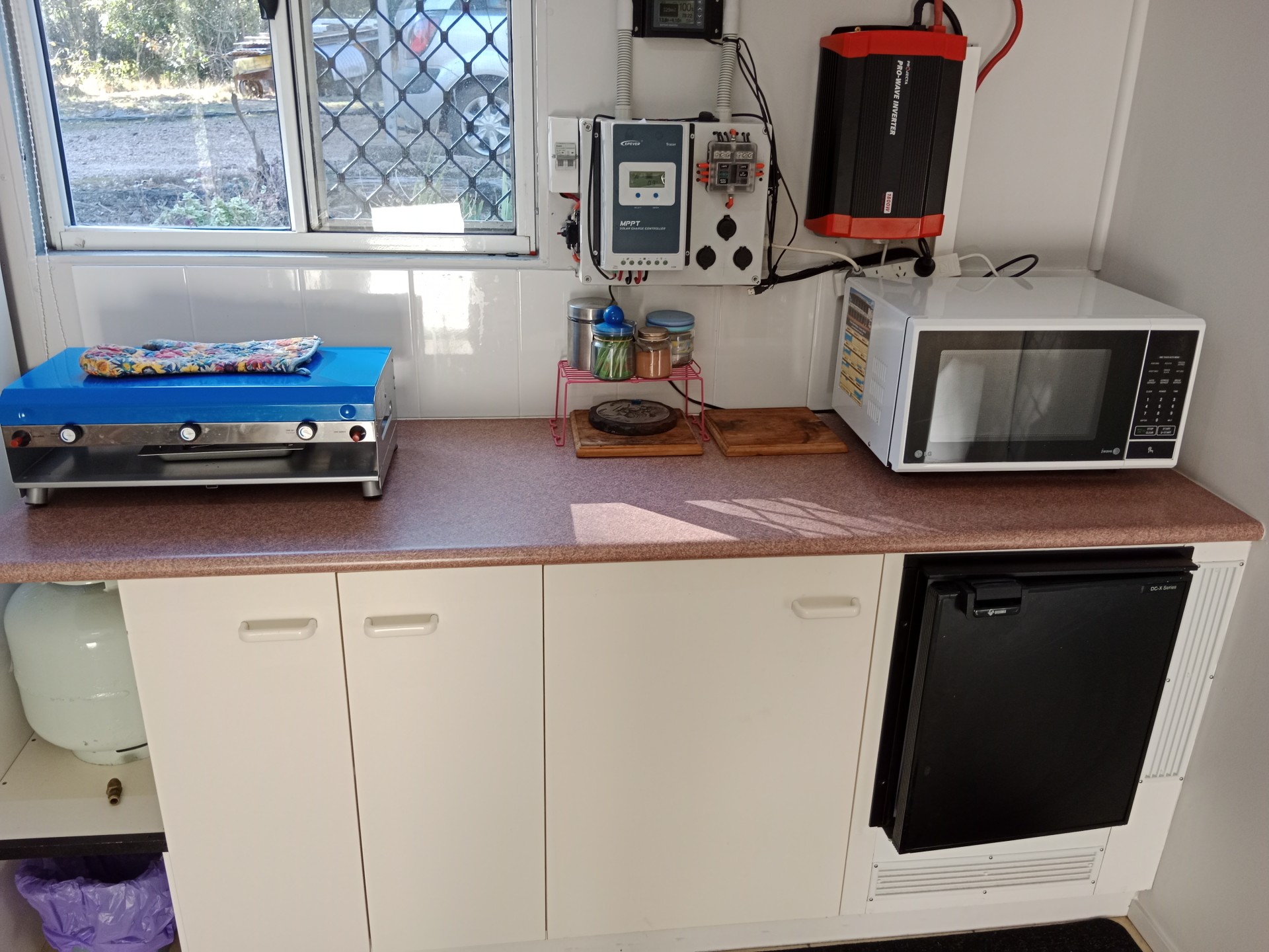 Power is available via solar panels and deep cycle batteries, with 12volt supplying all led lights, fridge, boosted TV and phone signals. 240-volt is available through an inverter to power microwave, fans, TV and power tools.