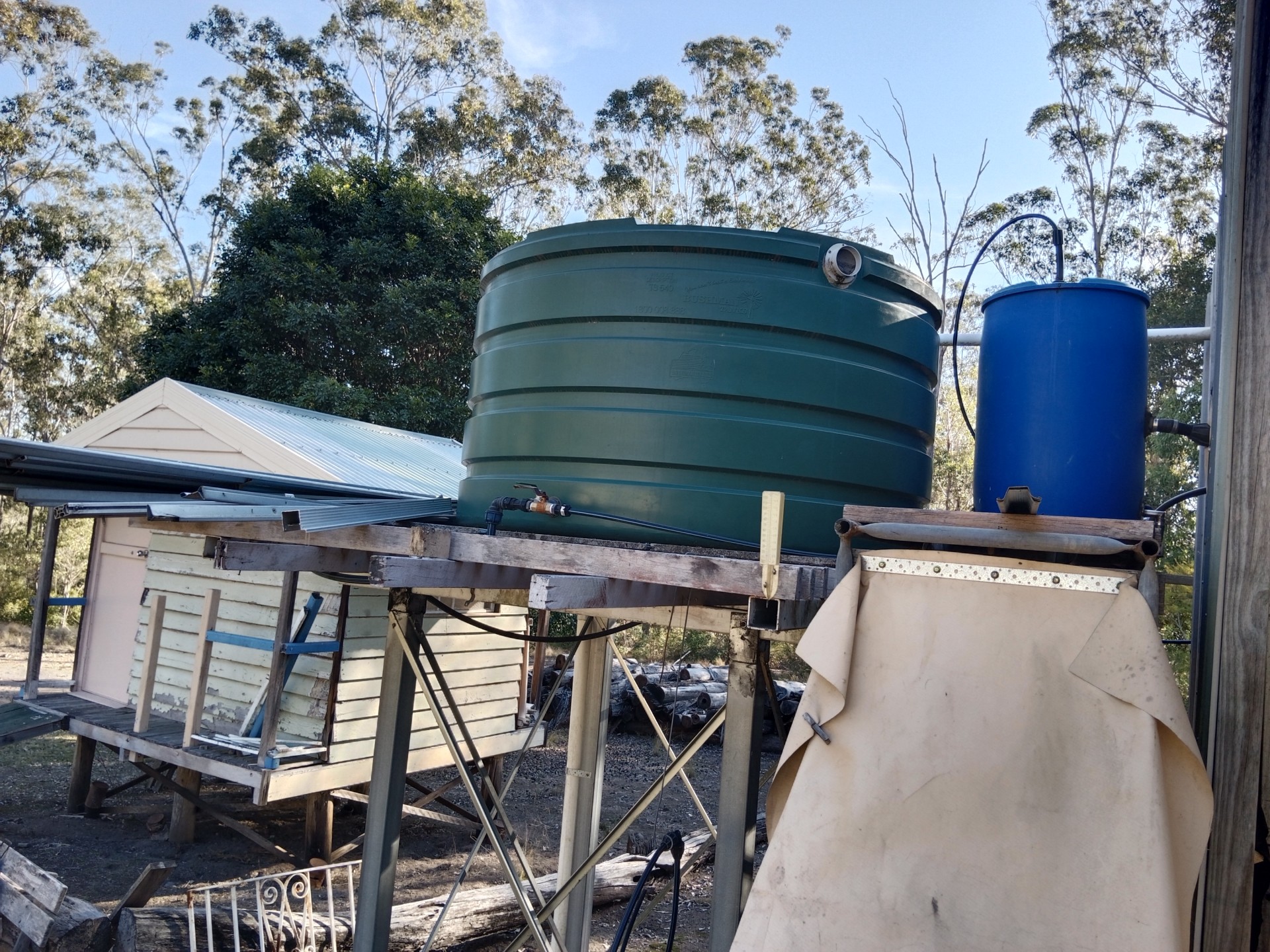 The water storage is 2500l to the bathroom, 2000l to the toilet, and 5000l to the kitchen. Hot water is fed to the bathroom and heated by gas or the wood-fired box.