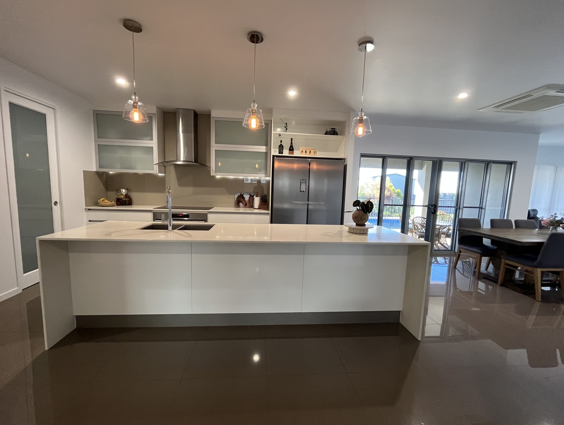 The kitchen is entertainers delight with a large 3.2m island stone bench, walk-in pantry with sliding door, 900mm hot plate and 900mm oven, huge Miele Side by Side-by-Side Fridge/Freezer, Sinkerator food scrap disposer, plenty of storage drawers and cupboards
