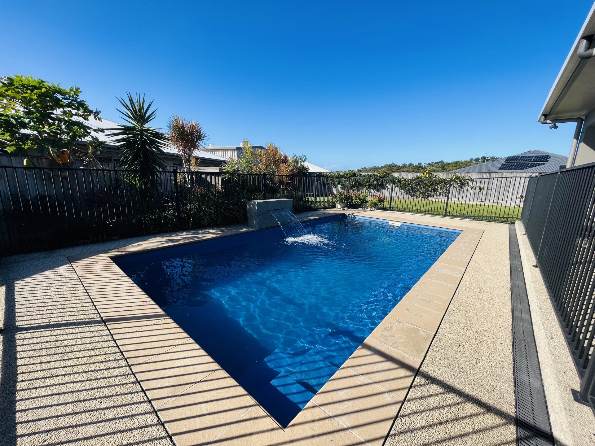 The patio overlooks the pool which makes supervision of children in the pool easier for parents. The Pool has a waterfall feature and built-in safety ledges along the inside walls of the pool. The large backyard is grassed and shaded by the house in the afternoons making for a cool place for entertaining or for kids to play after school.