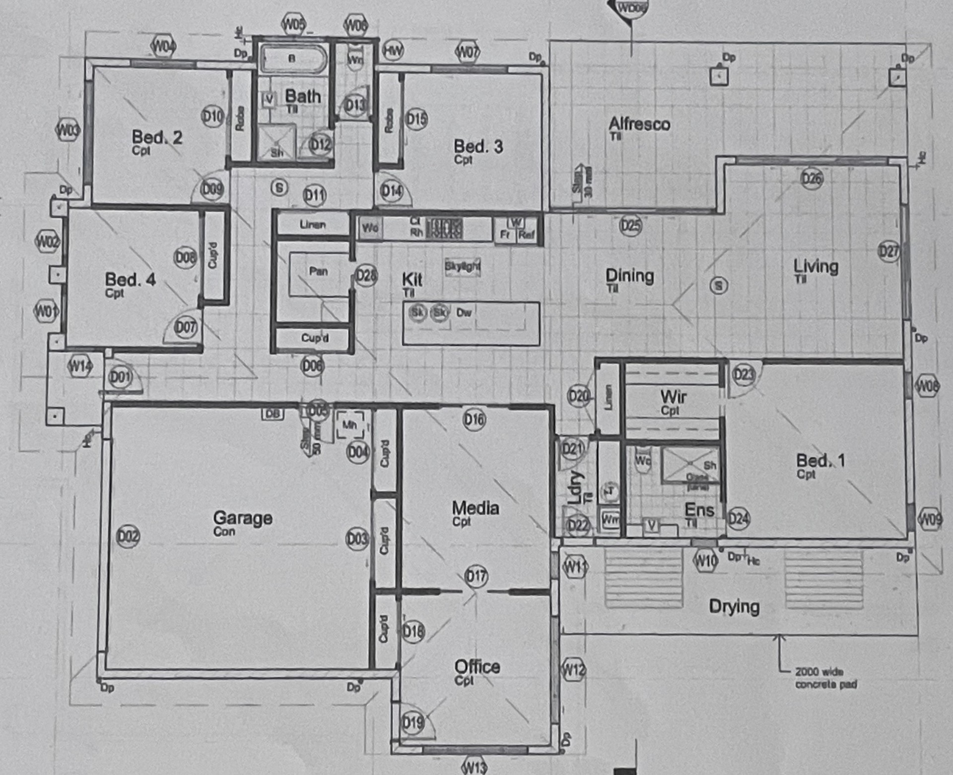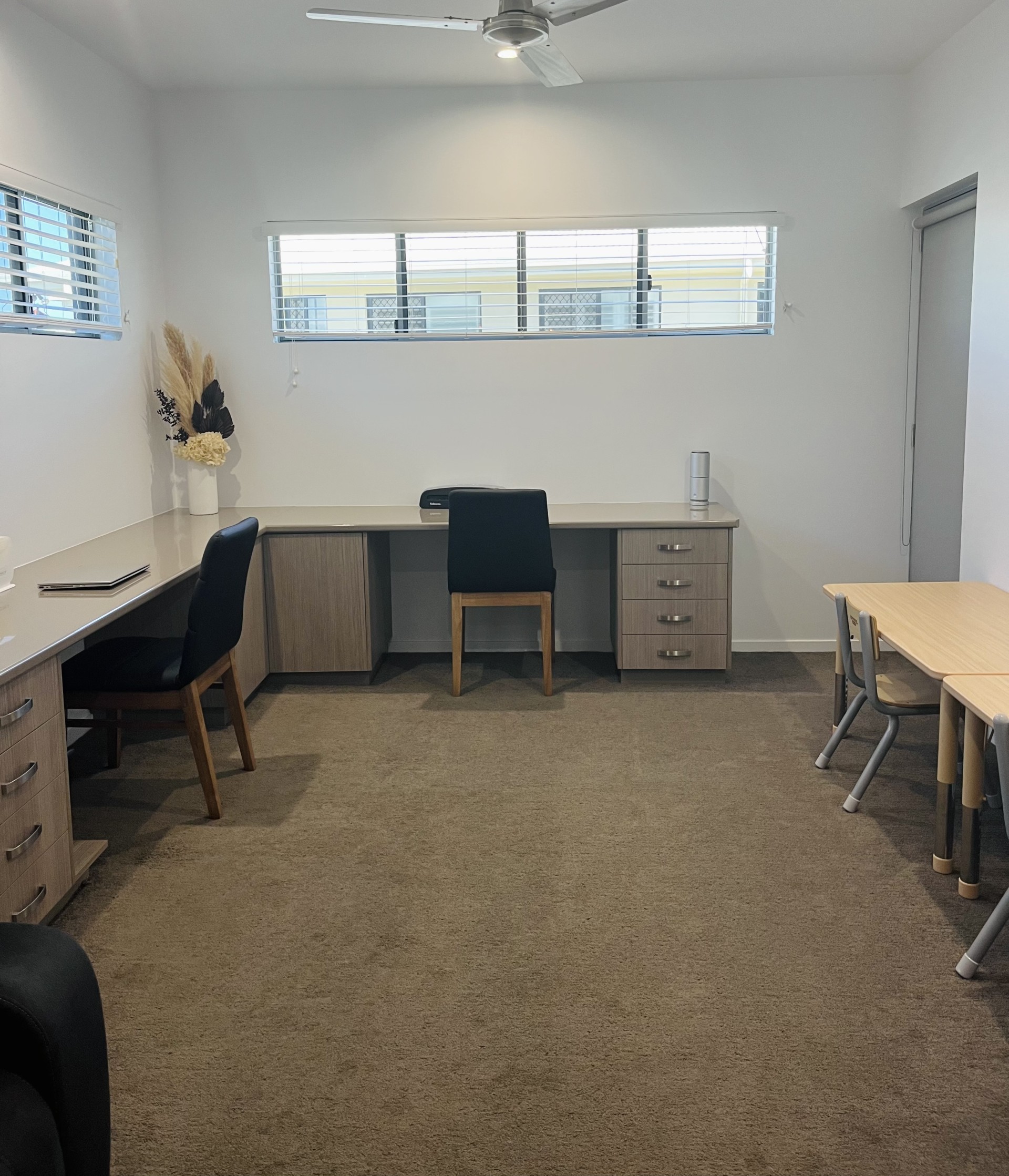 The Media/Lounge Room adjoins the Office. The Office has a three-drawer built-in Filing Cabinet, built-in L-shaped work desks, drawers and a corner cupboard. There is an external door that allows this area to be accessed from outside without going through the house. If a formal Work Office is not required this room could easily be used as a Homework room, Toy Room or Craft Room.