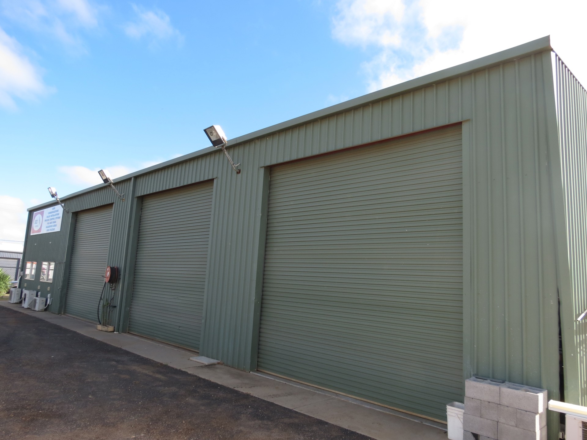 Hi Bay ColourBond Warehouse with 3Phase Power plus 5.6kWSolar, 4 Hi Clear (2x electric) Roller Doors, plus