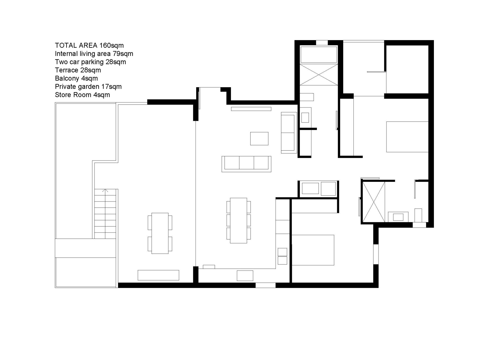 Terrace apartment with large balcony (28 sqm), small front garden in a new secure block. The main bedroom has an ensuite with BIR and an internal balcony.
