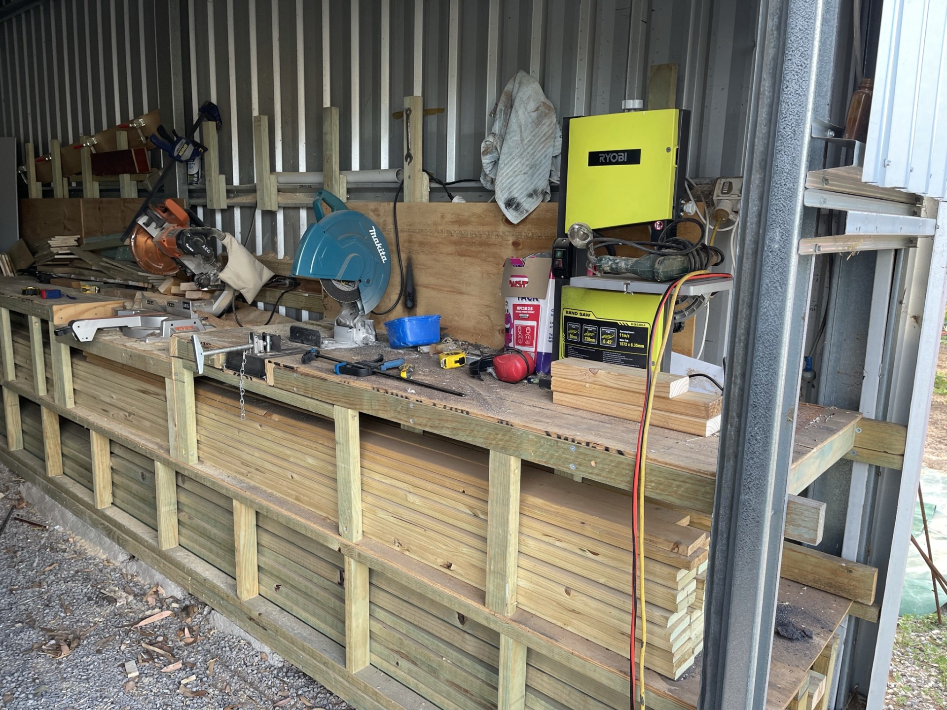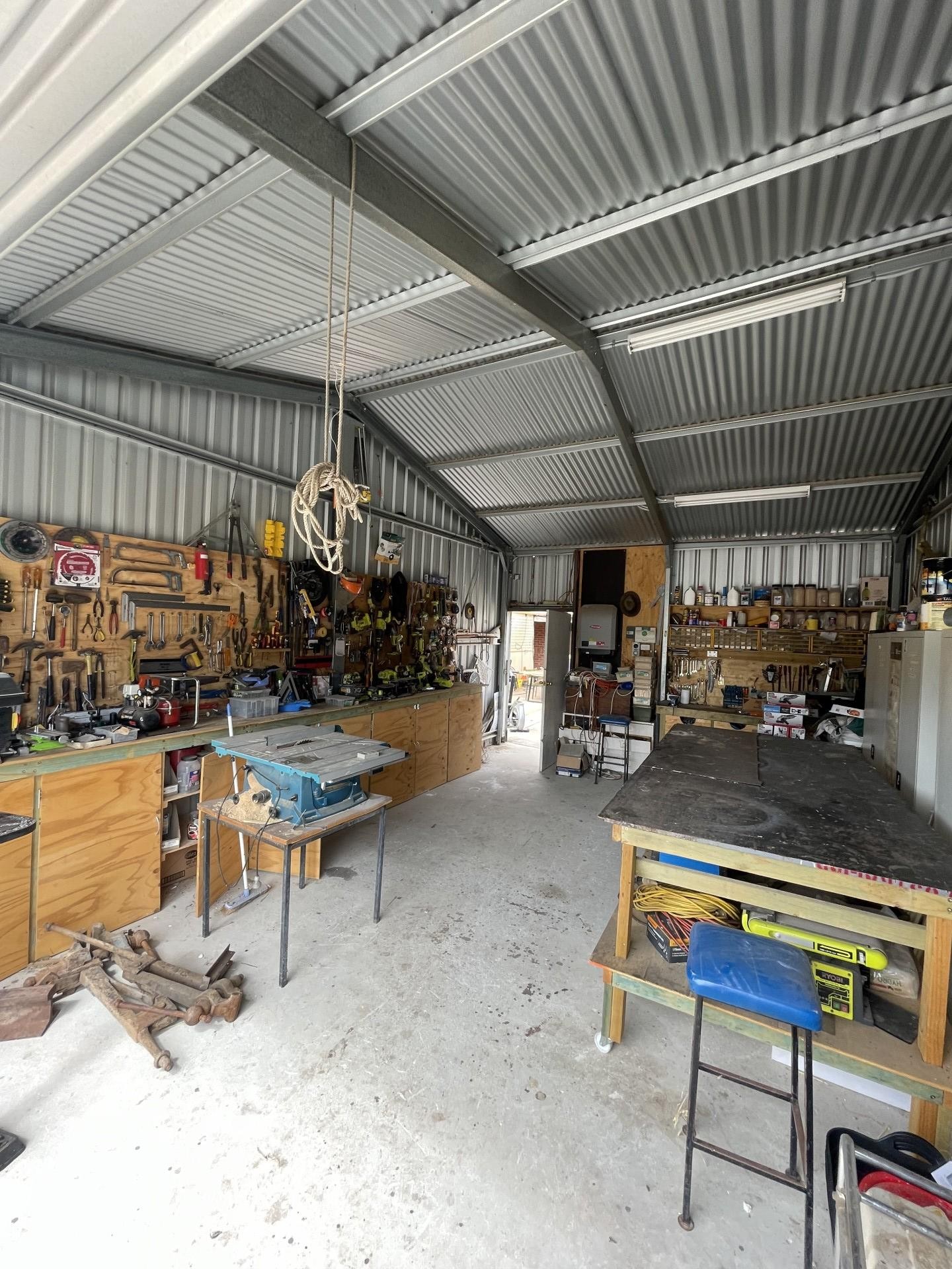 Versatile Workshop: A fully secure 3-bay work shed, complete with 3 Phase power, 15 amp outlets, and ample PowerPoints, provides boundless opportunities for hobbies and projects. Organized workbenches and cabinets enhance the workshop's efficiency.