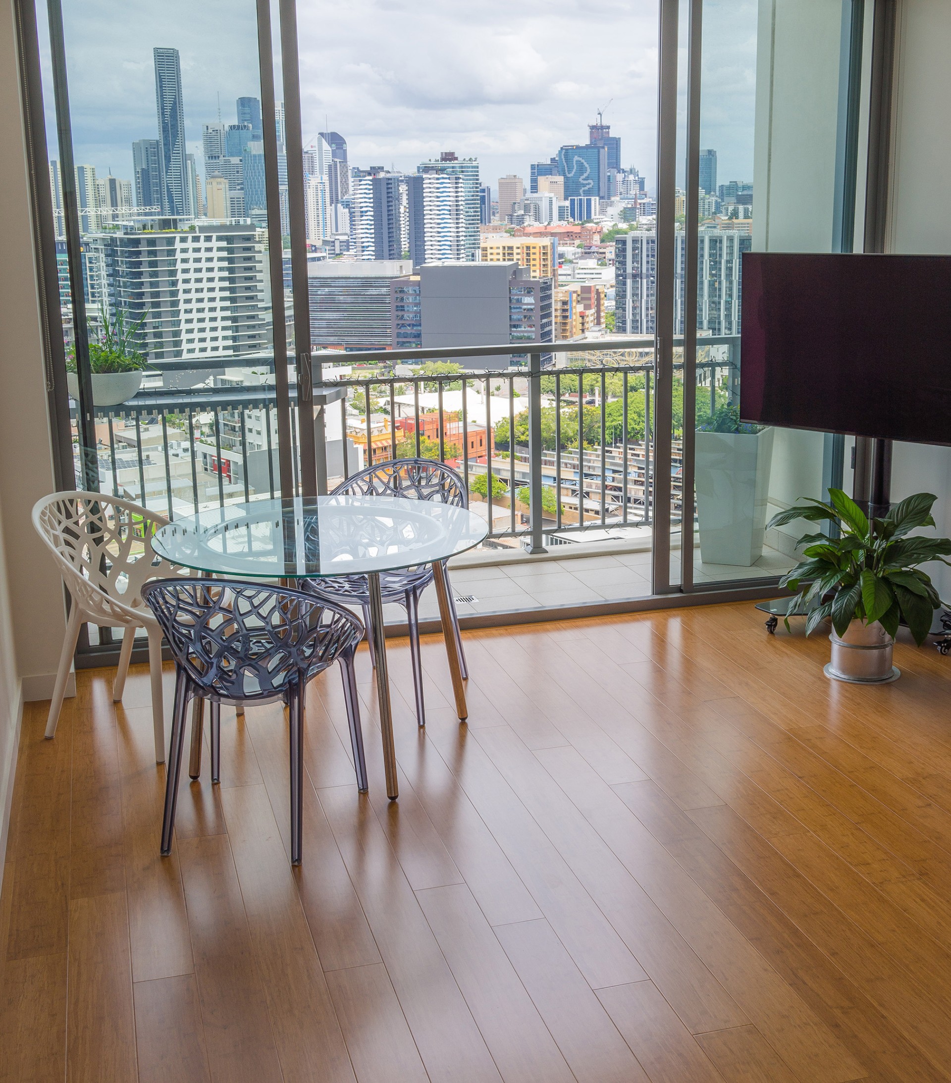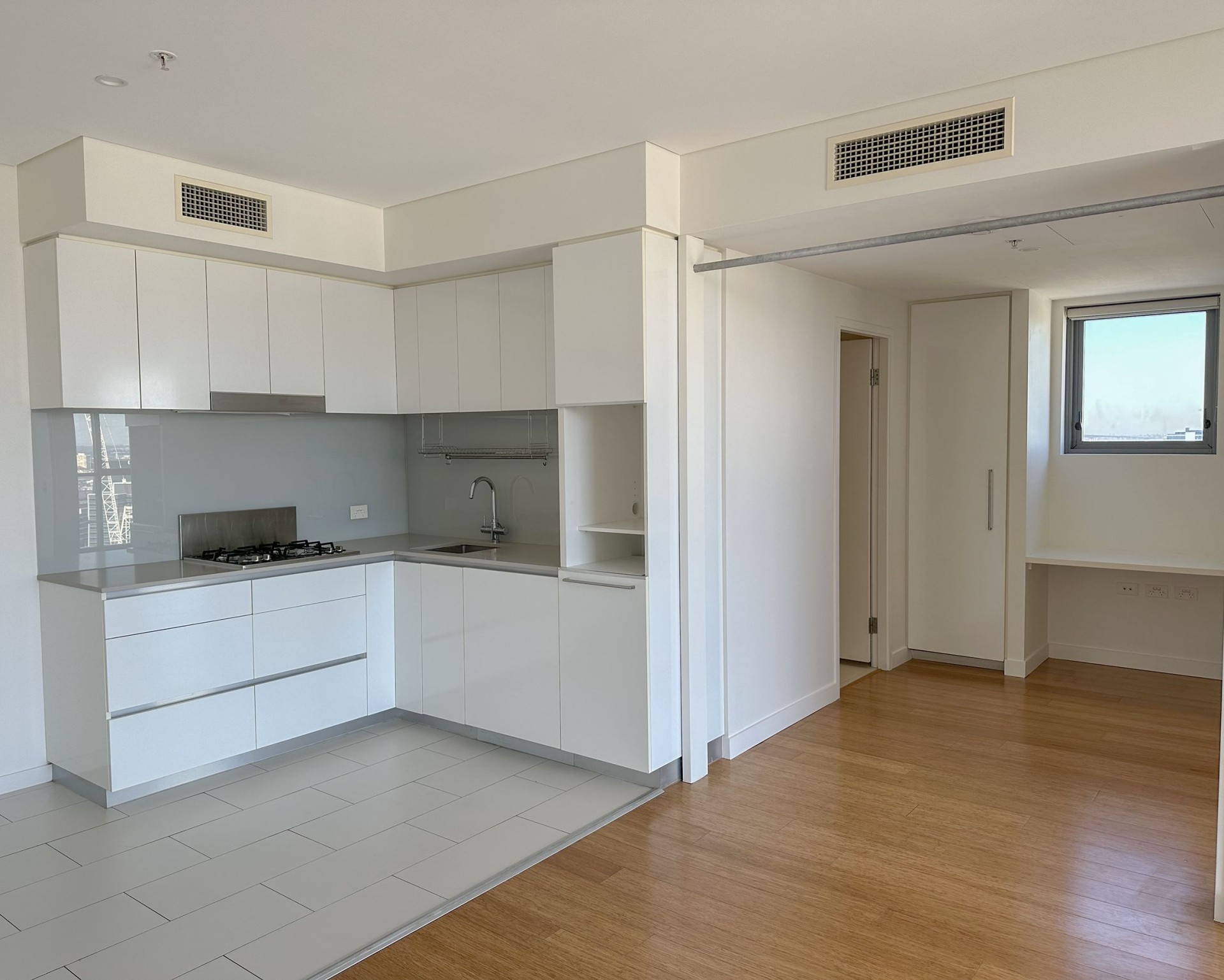 • Composite bamboo flooring in the living/dining room and bedroom.