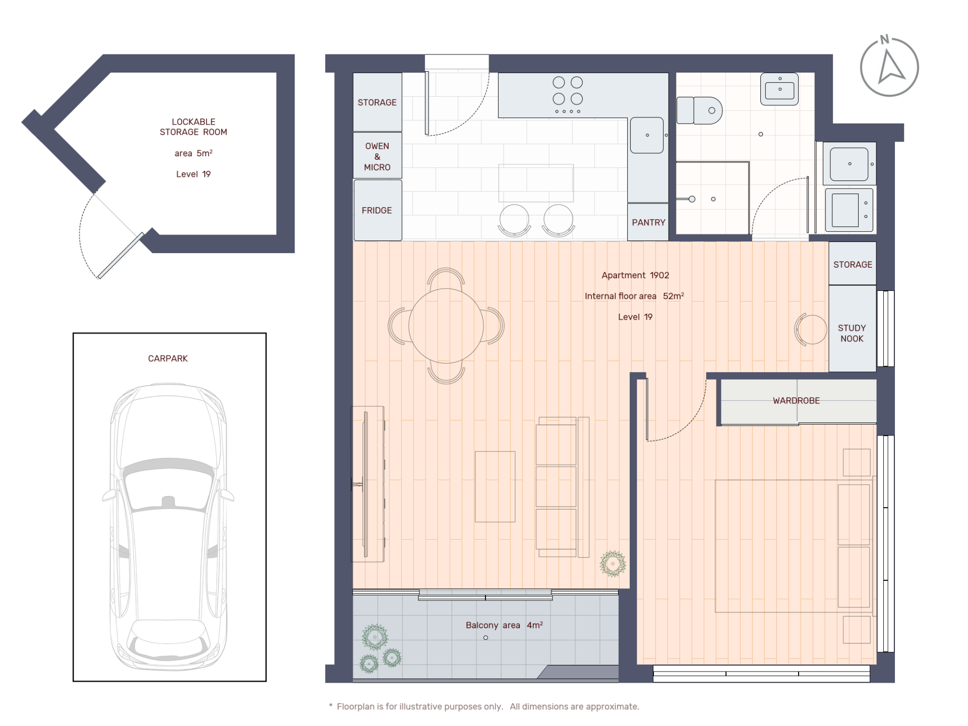 Internal floor area - 52m2 + 4m2 balcony + 5m2 storage room (only a limited number of apartments in the building have the lockable storage room on the same level as the apartment).