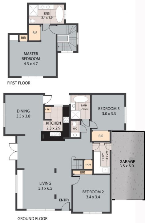 The entryway leads you to an exceptionally large living room which leads to a private outdoor space with a low-maintenance garden. The living room takes you to the generous dining room which adjoins a well-spaced kitchen area with stainless steel appliances and a gas cooktop, dishwasher and Caesarstone benchtops and splashbacks. There is ample storage and a pantry. Also on the ground floor are 2 well-sized bedrooms with built-in robes, a modern large bathroom with a bathtub and a separate toilet and vanity, and a large laundry providing safety with direct access into the single lock up single car and covenant storage under the stairs.