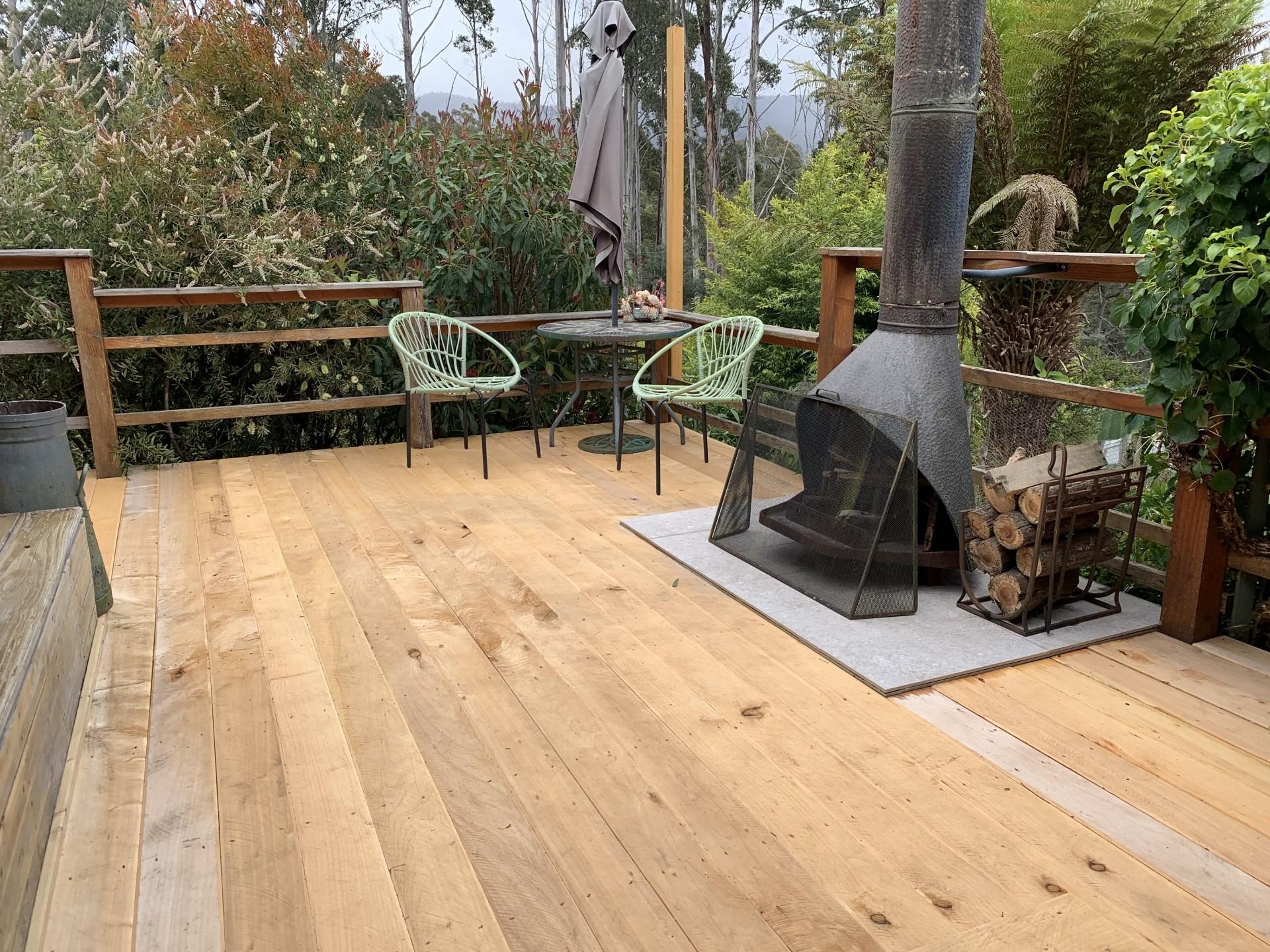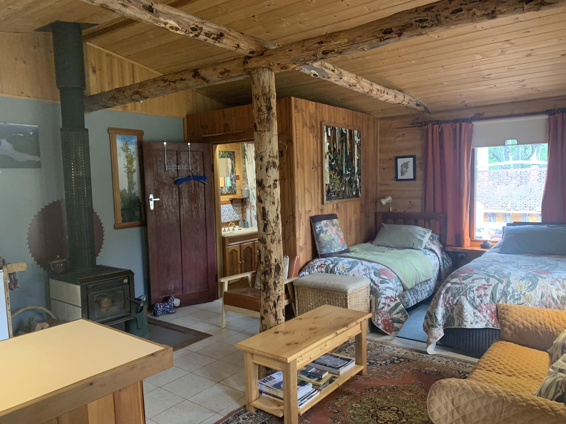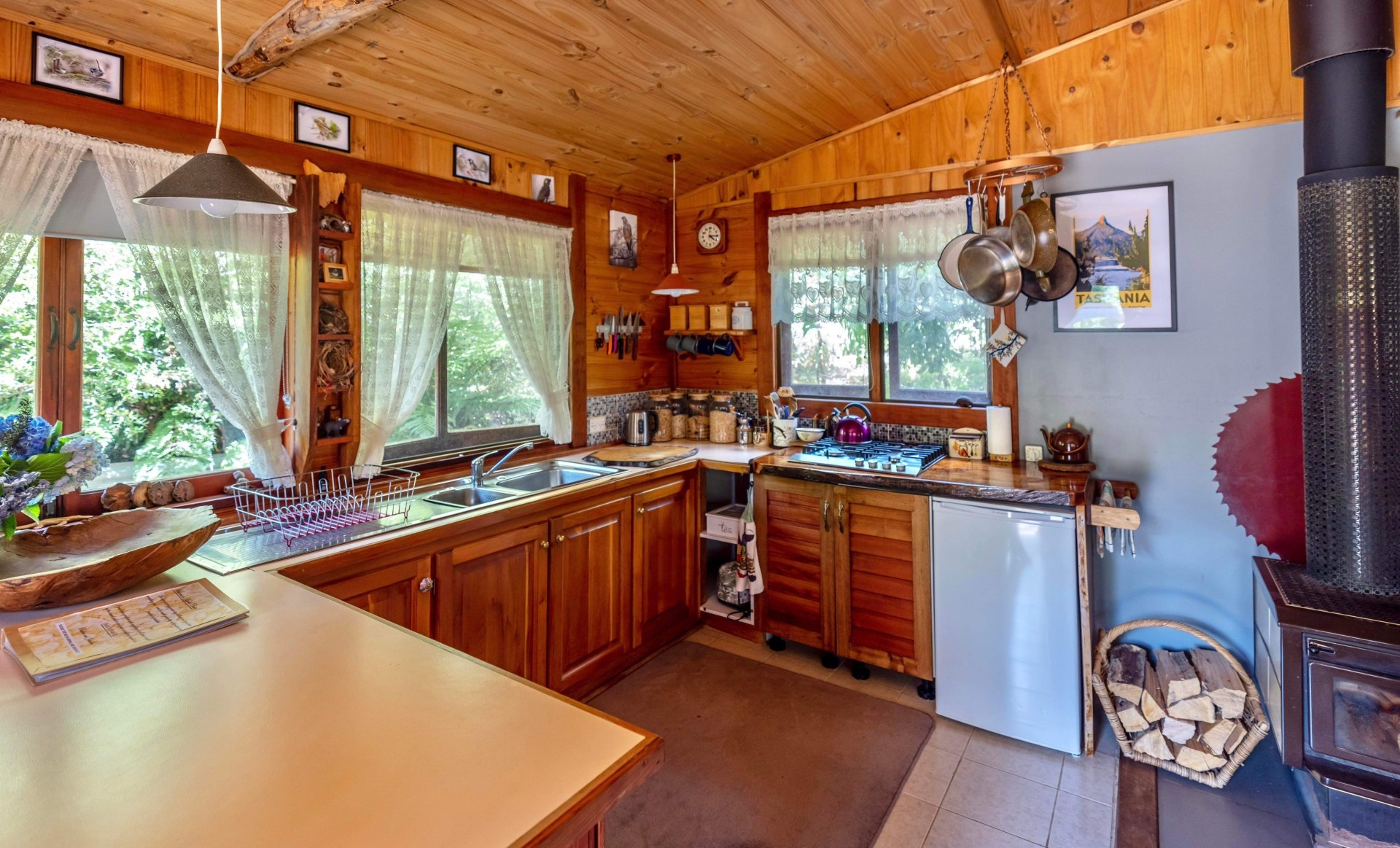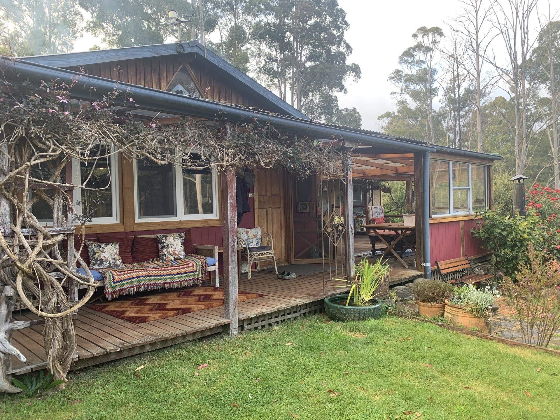 The main house has an Old World charm with all your modern ammenities. The open plan kitchen / dining room has both a wood fired stove for cooking and hot water and a gas top with a beautiful Tasmanian Blackwood bench top , there is also an under bench dishwasher.