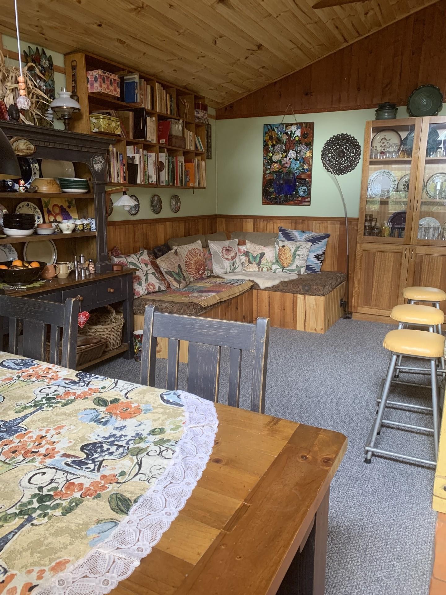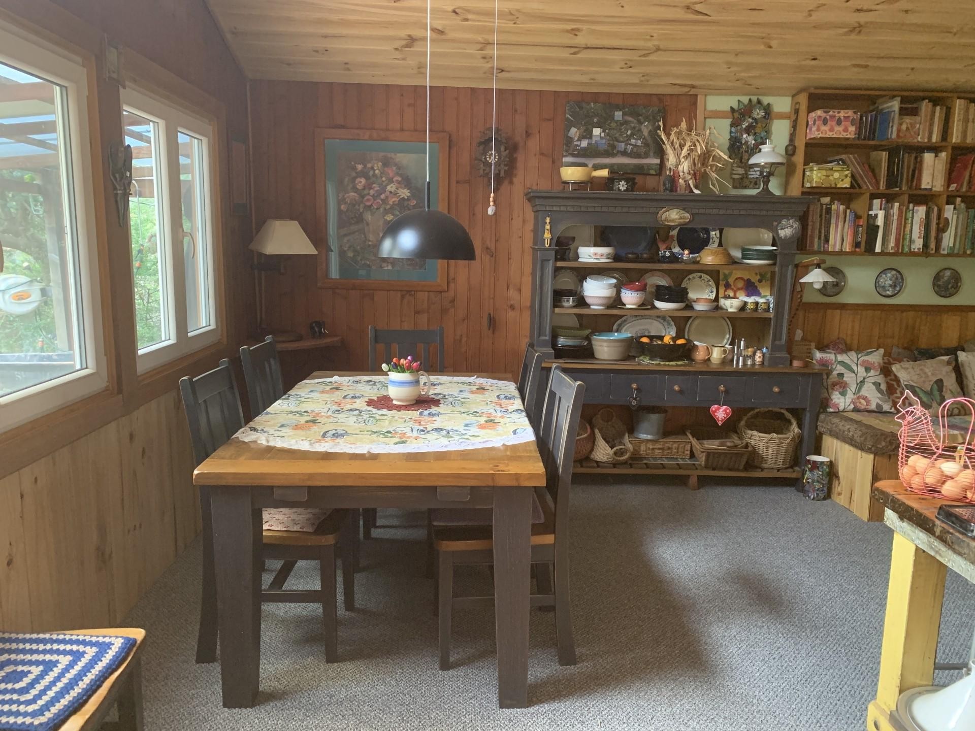 The cabin is also connected to the generous solar power system that this property has in place. Like the main residence it has a flush toilet that goes into an effective worm composting system .