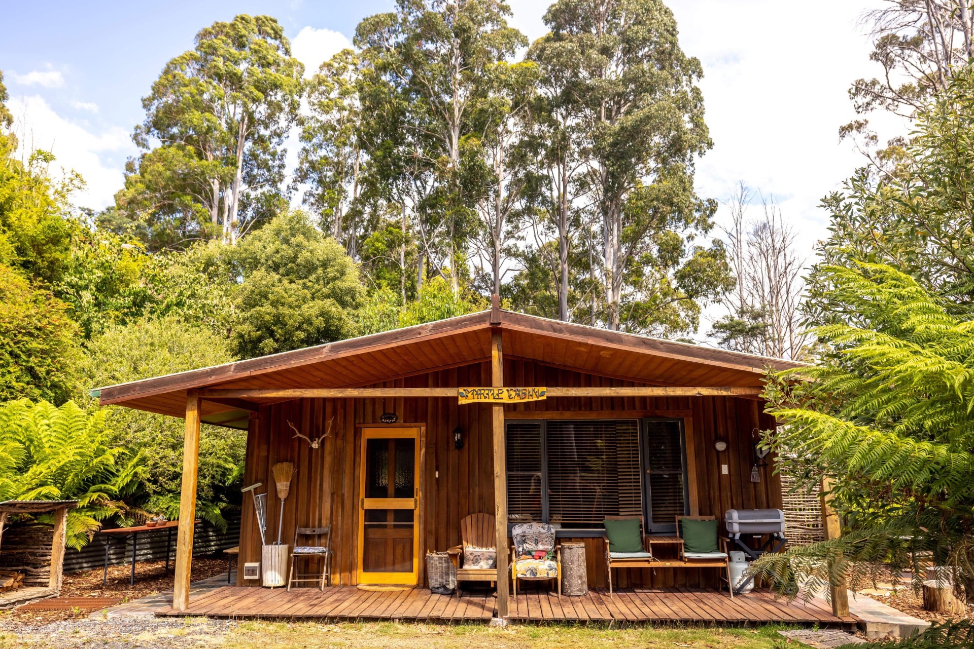 The cabin is connected to the main house with a board walk meandering through landscaped gardens. It is the perfect lucrative business opportunity as an Airbnb and set up as a perfect getaway for short and long term stays.