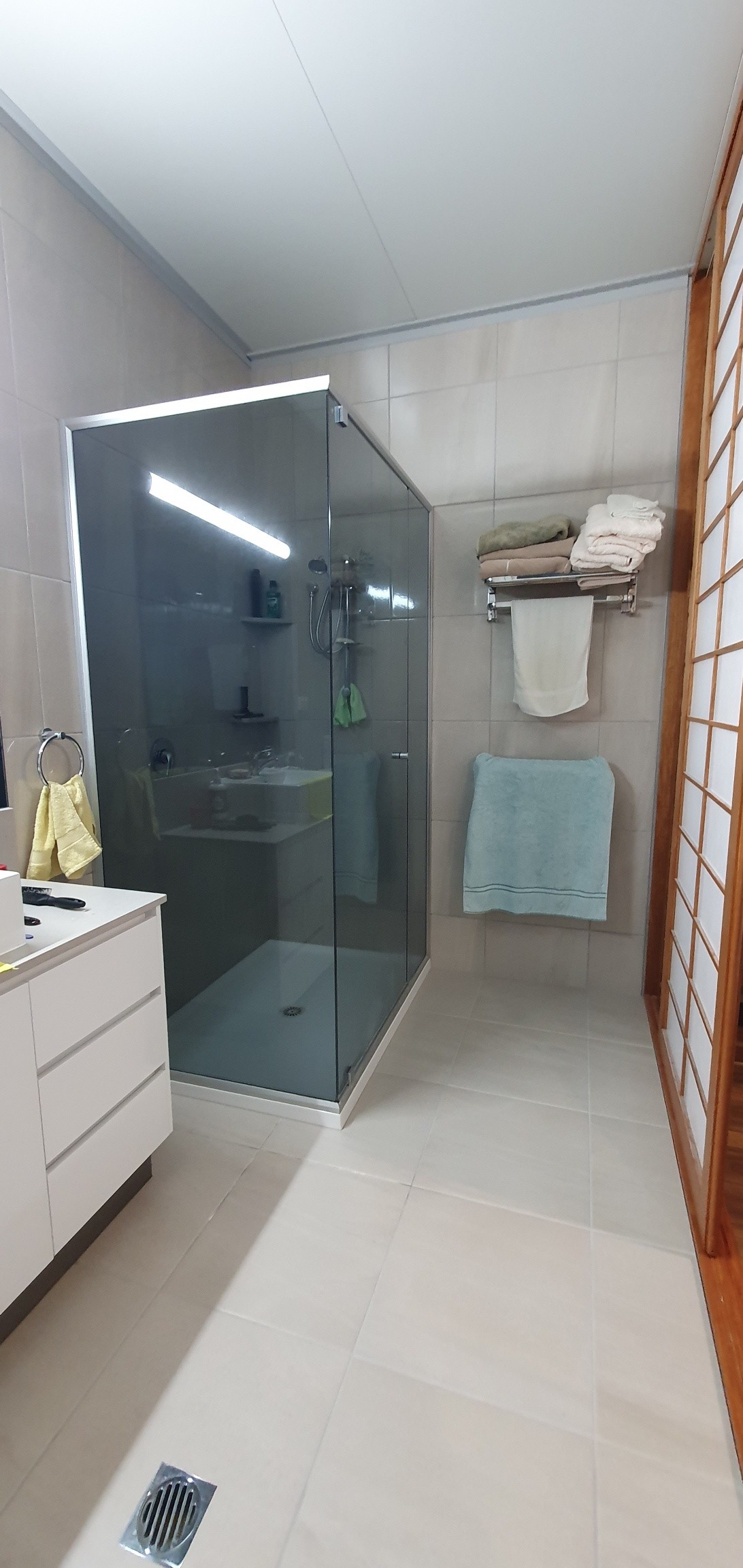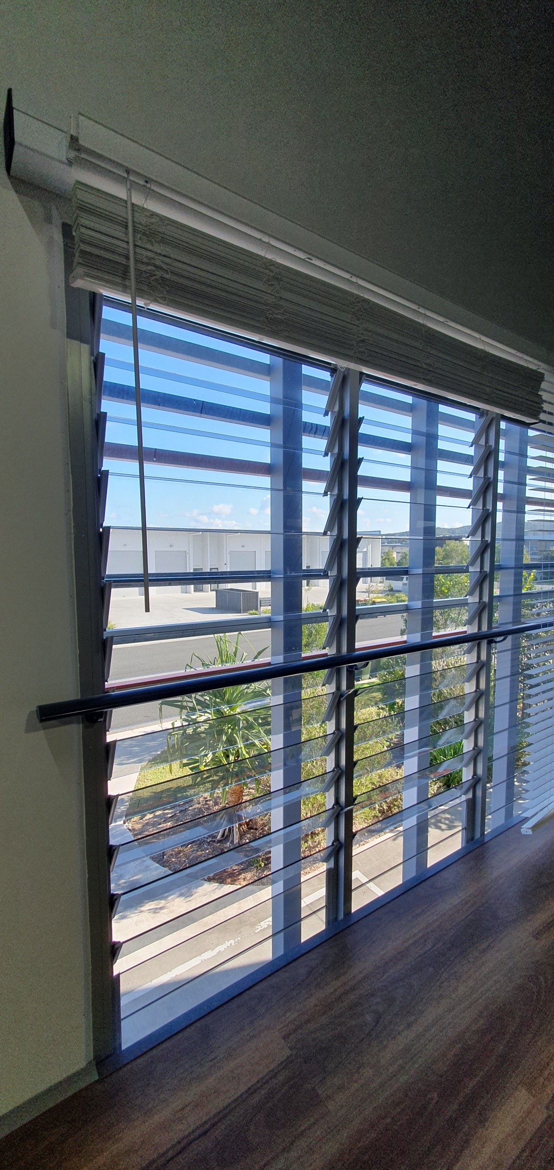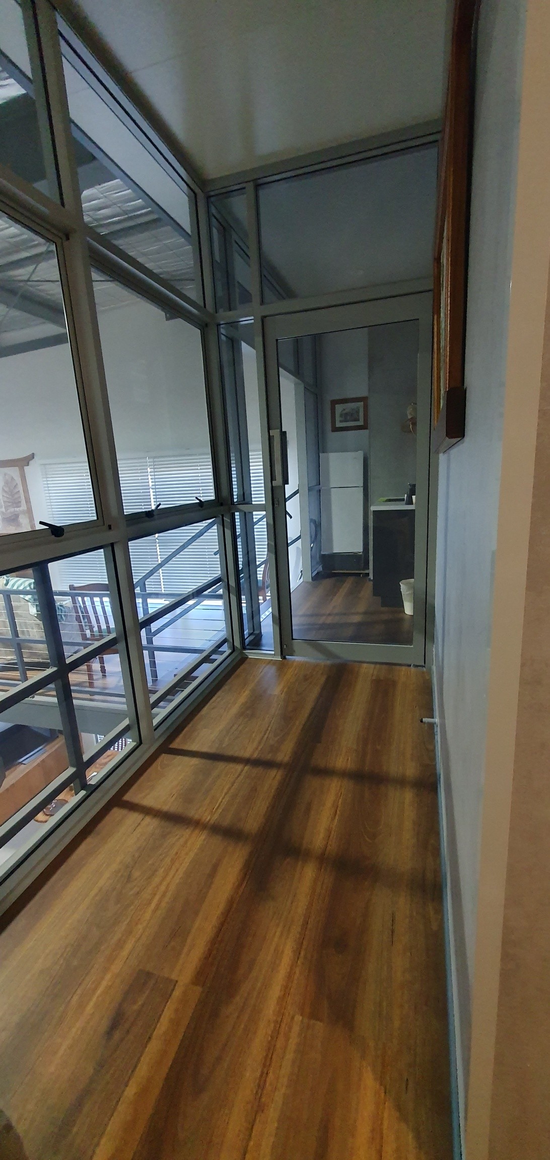 - Enclosed balcony which can double as lounge and/or rumpus, with louvre windows and white timber blinds,