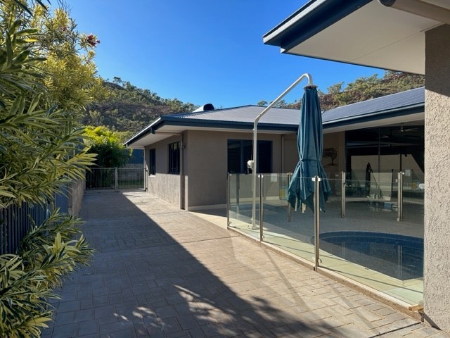 In the centre of the house, there is a unique glass wall that not only lets the light in but gives you the feel of being outside. There is access through the sliding door to the small pool and tiled entertainment area.