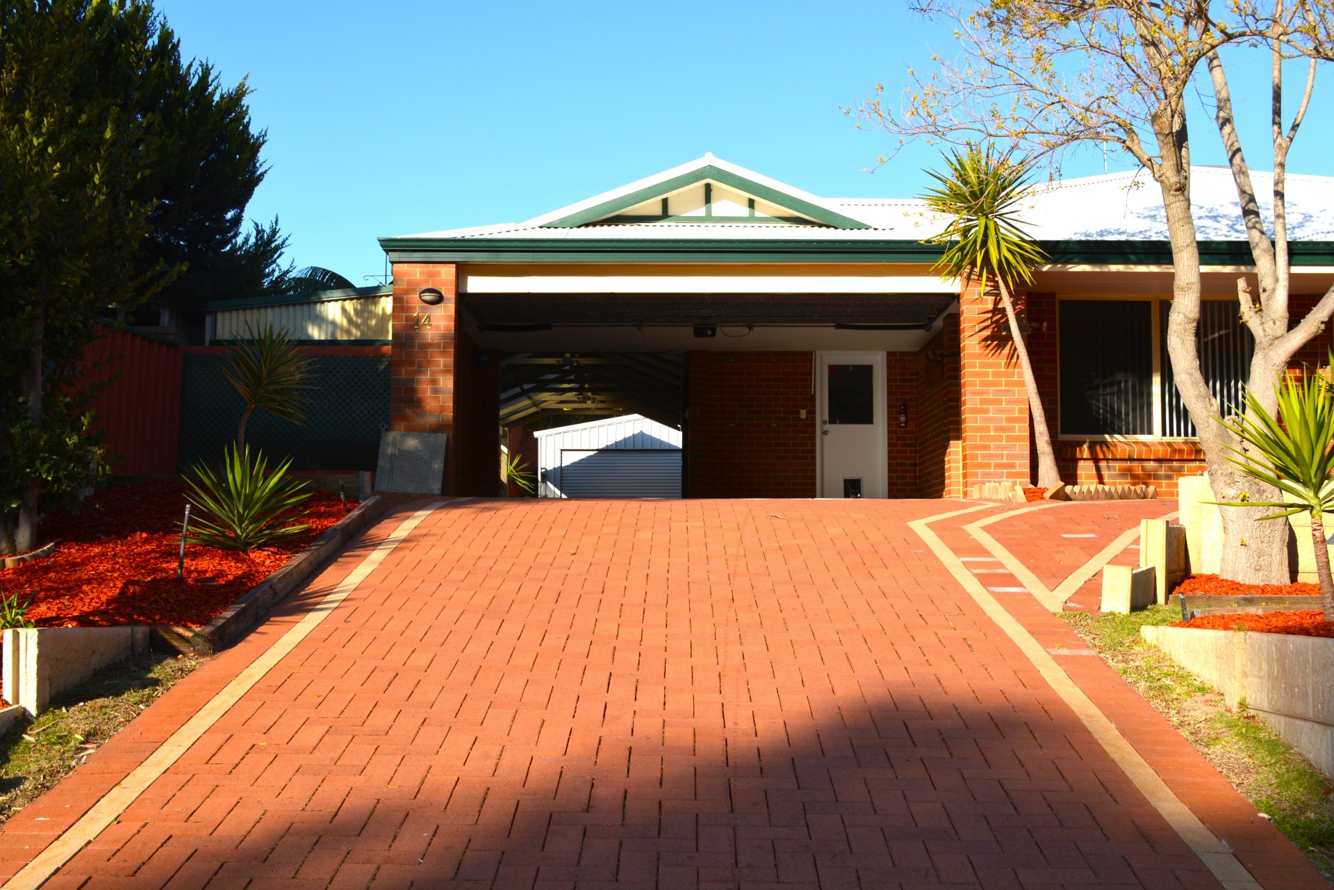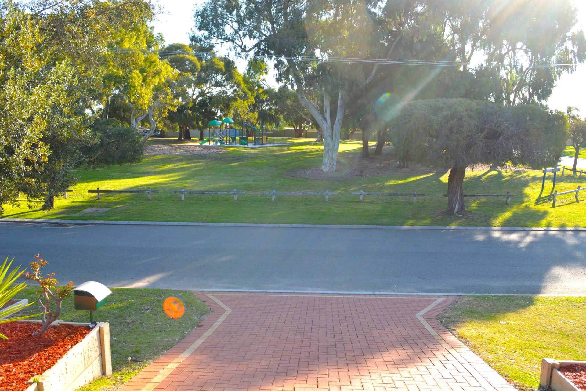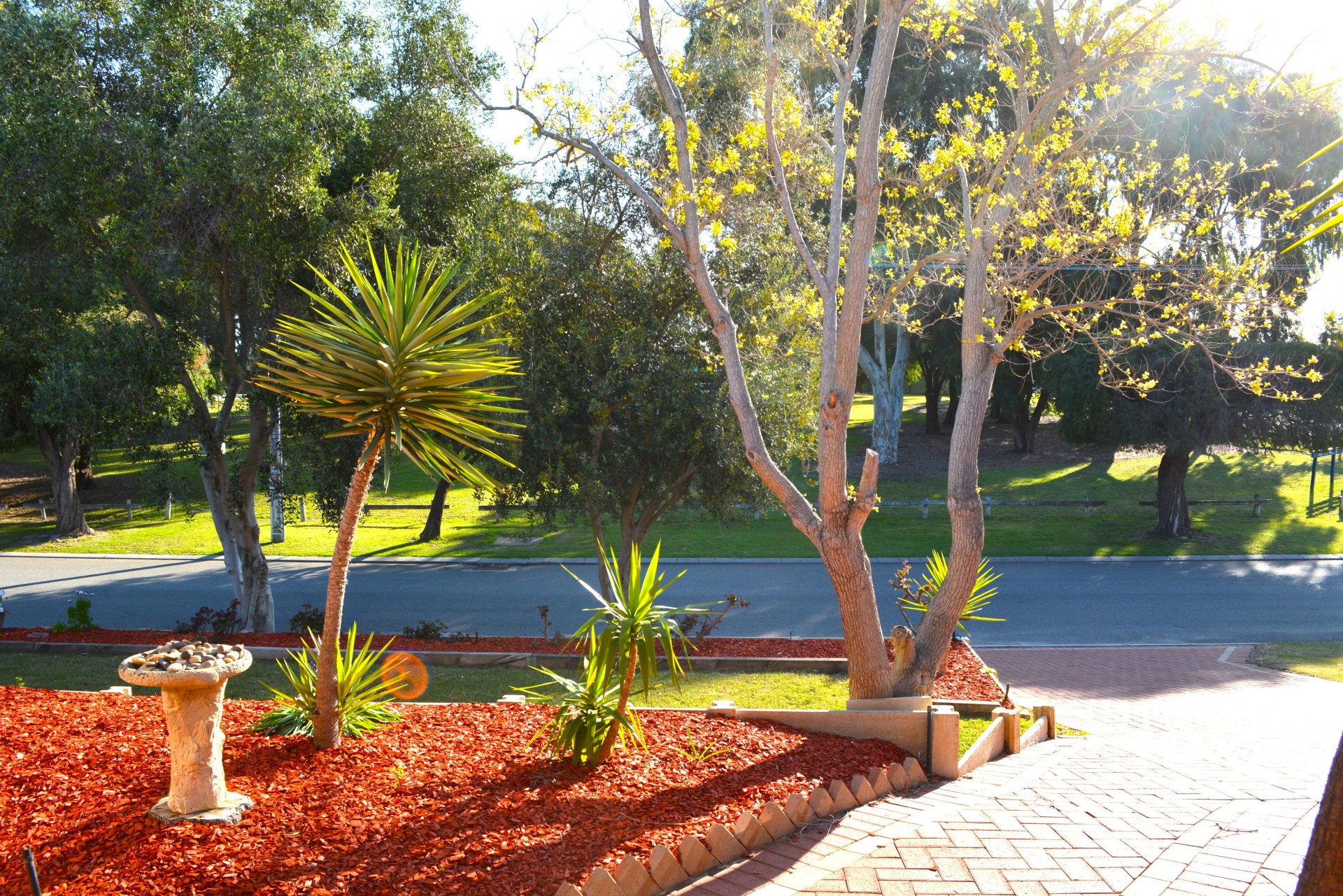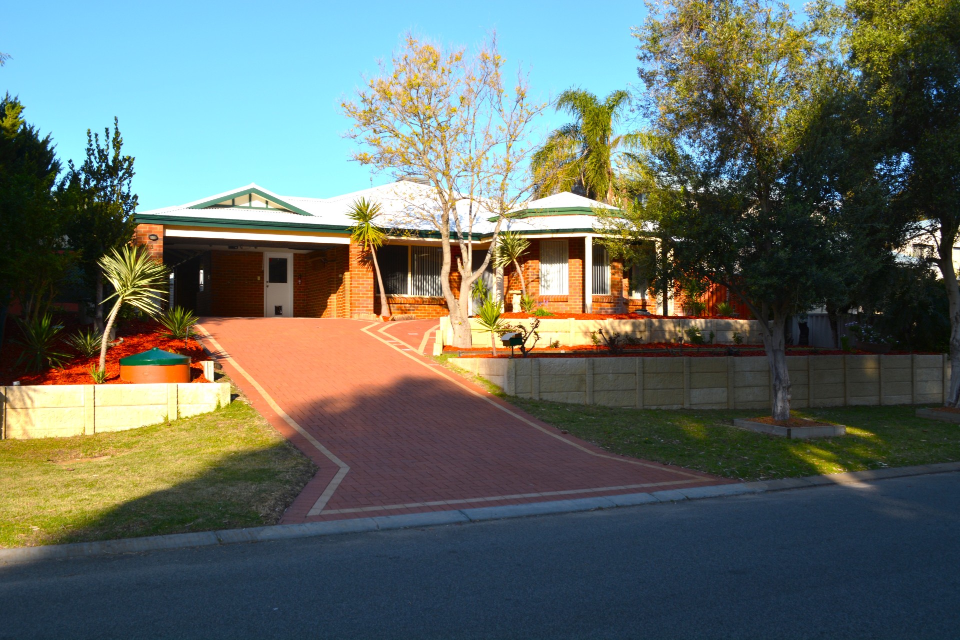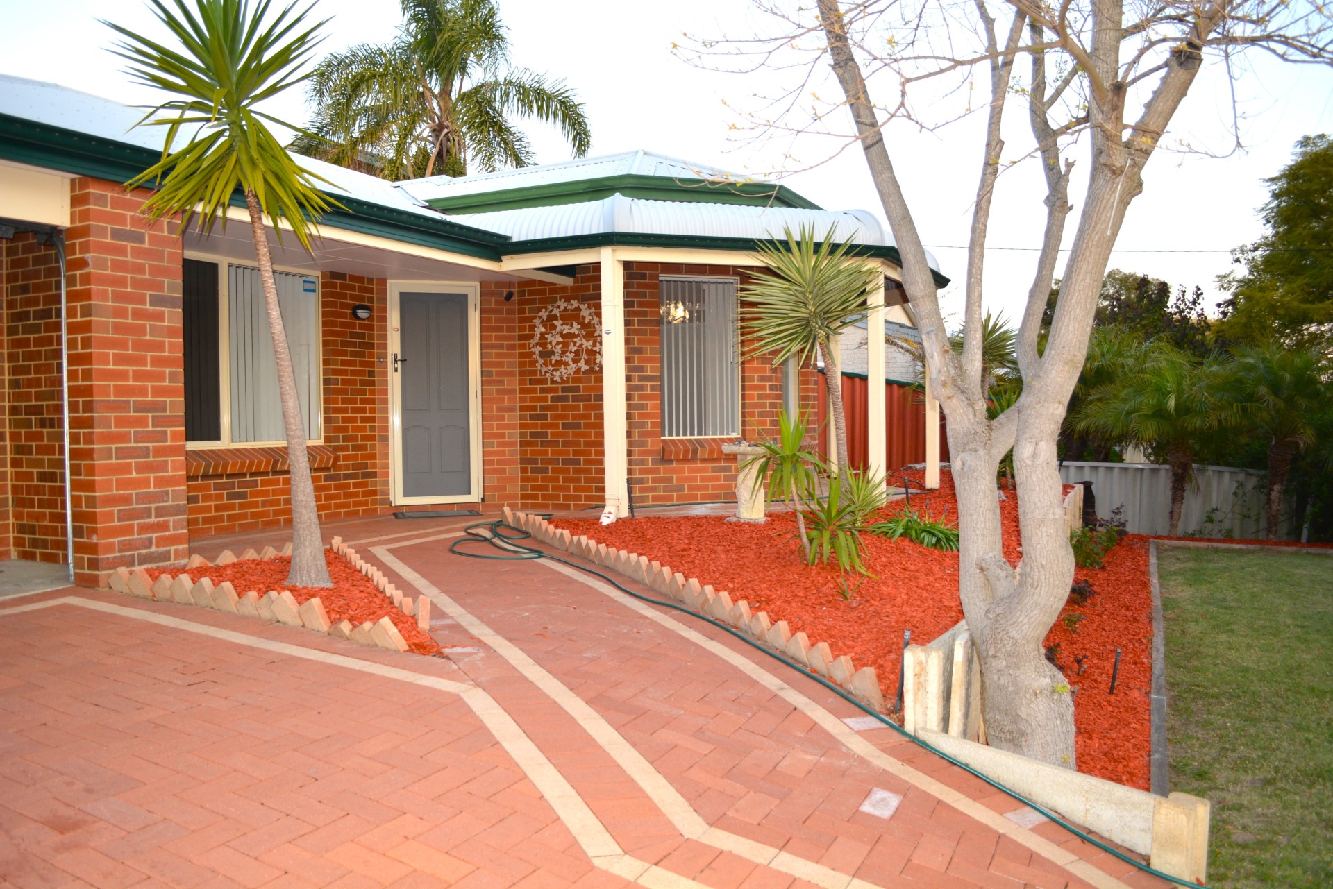 The front gardens are low maintenance with lots of rose bushes, palms and yukkas. There is plenty of room for a large bench on the pebbled area (right side of garages) where you can watch the sunset.