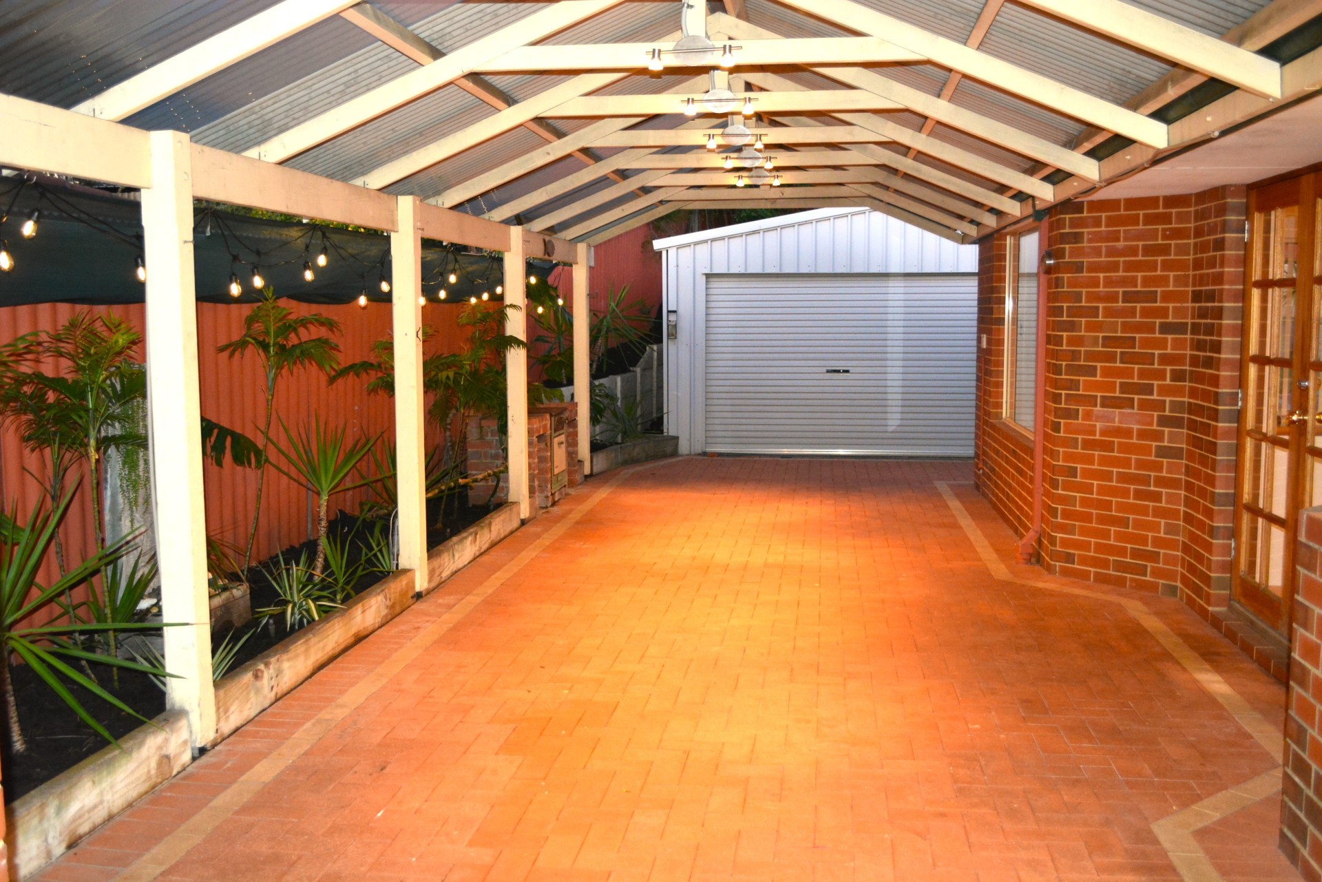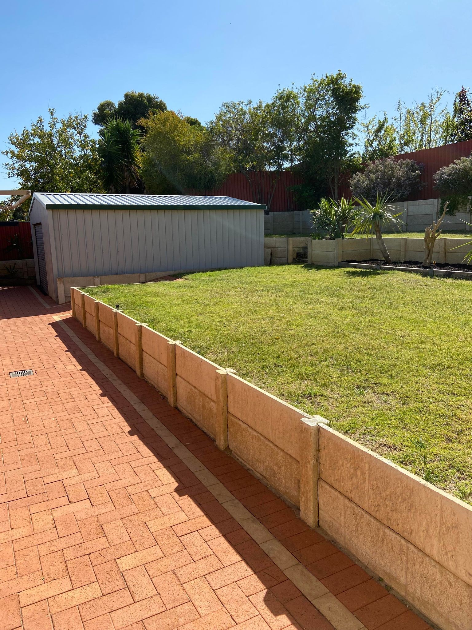 Large, shaded patio with garden beds.