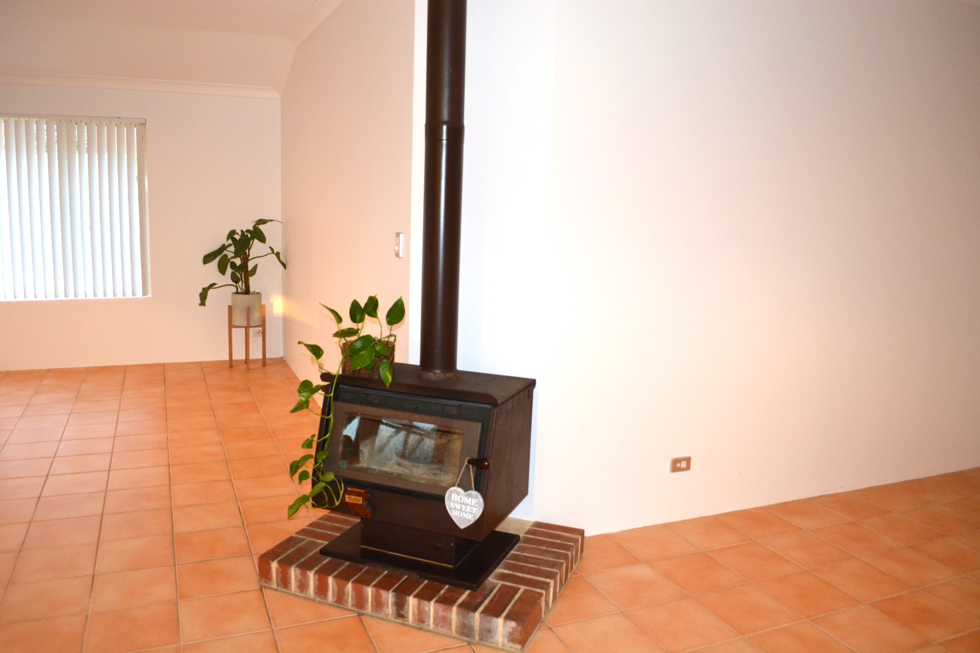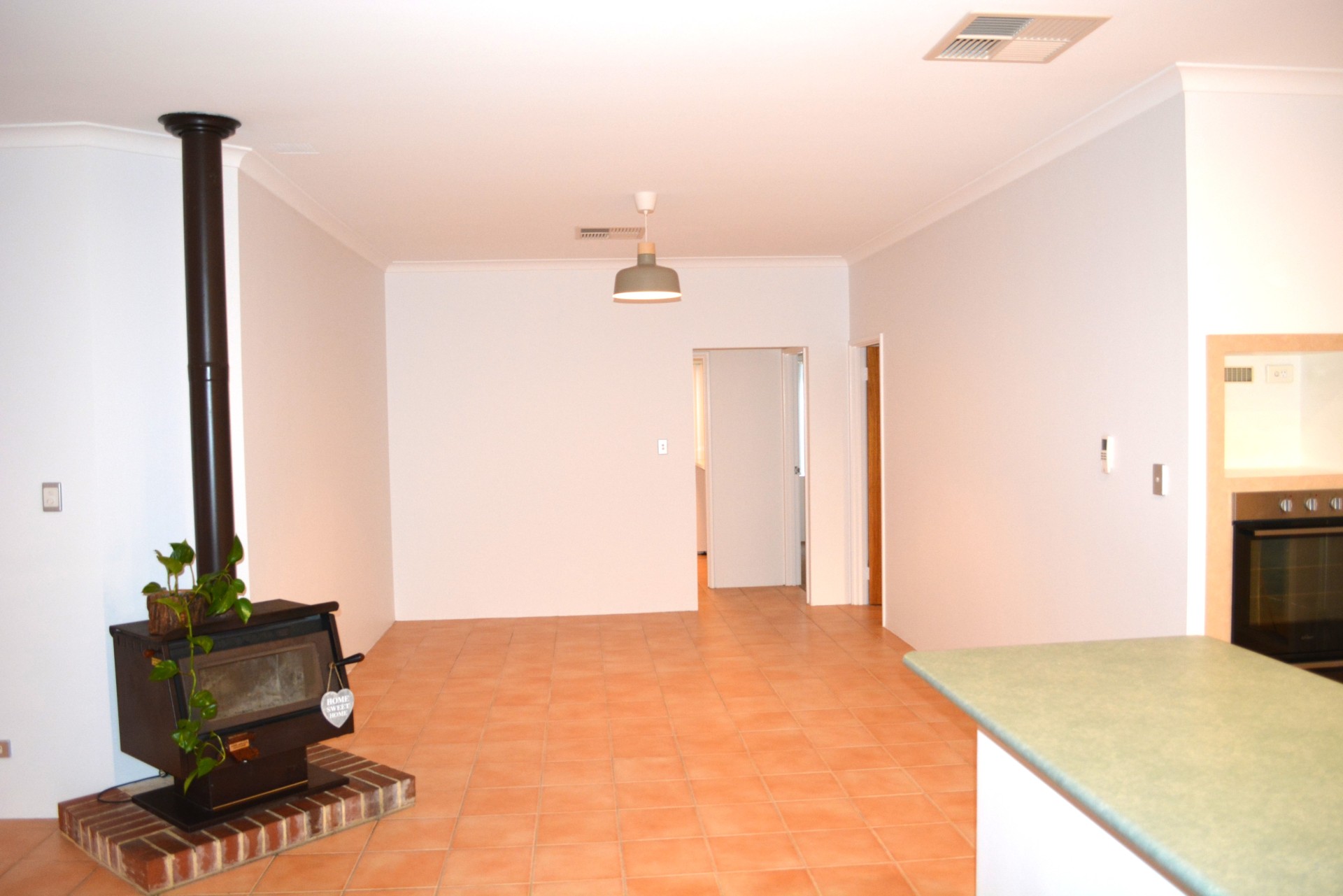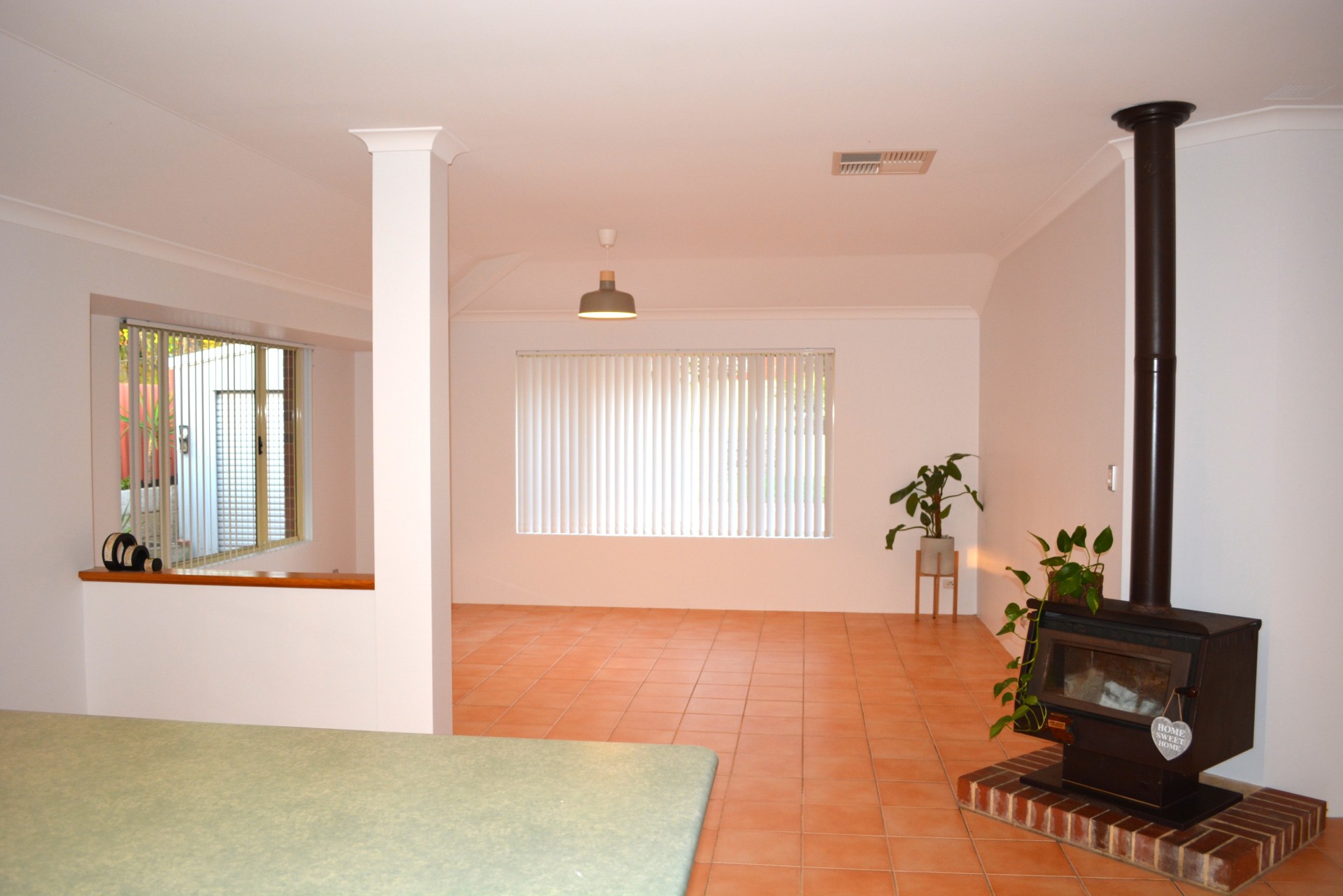 Large kitchen/lounge/dining area with raised ceilings, with a large Jarrahdale wood burner positioned centrally plus a gas bayonet.