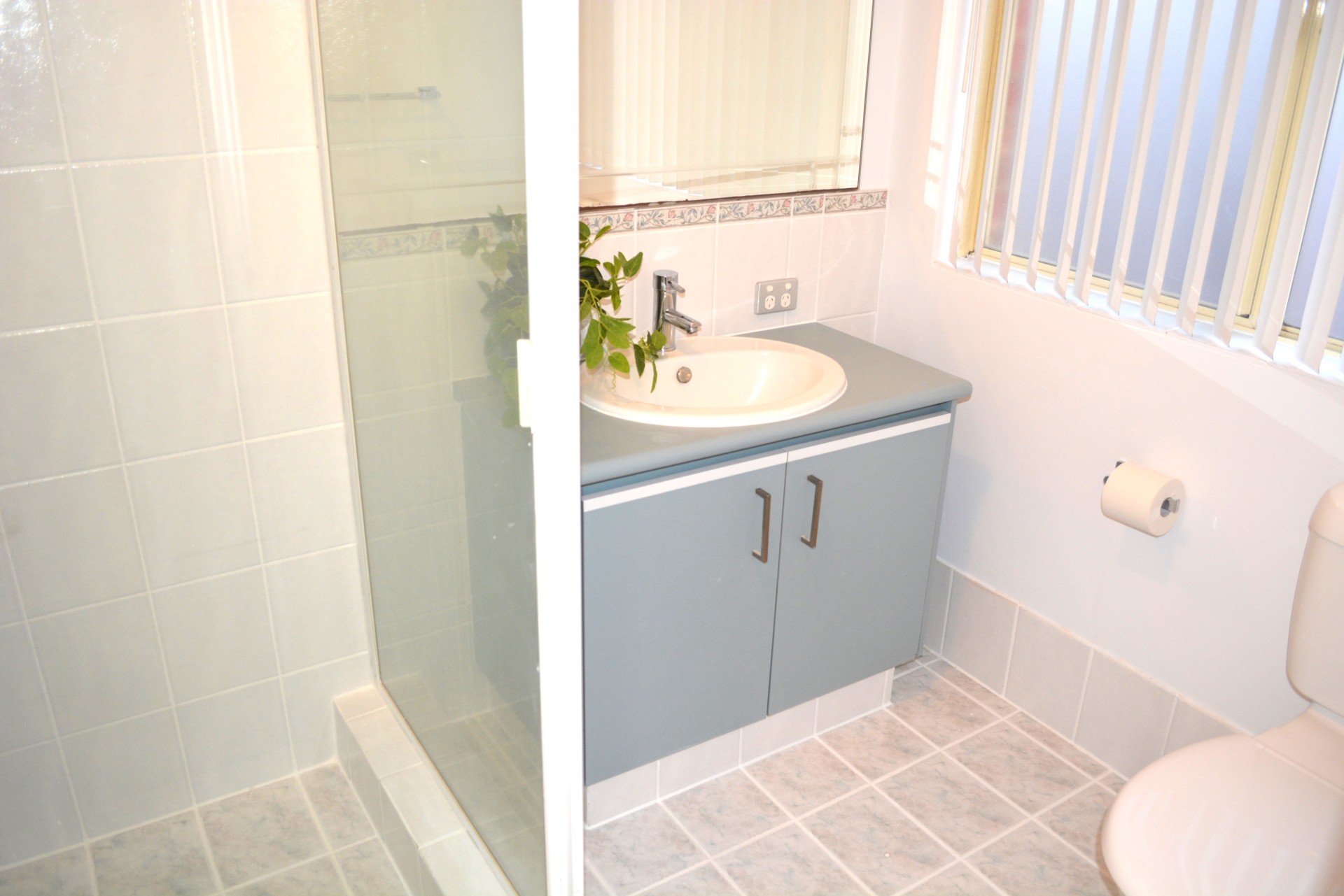 The house bathroom has been renovated and consists of a bath, shower, and vanity unit.