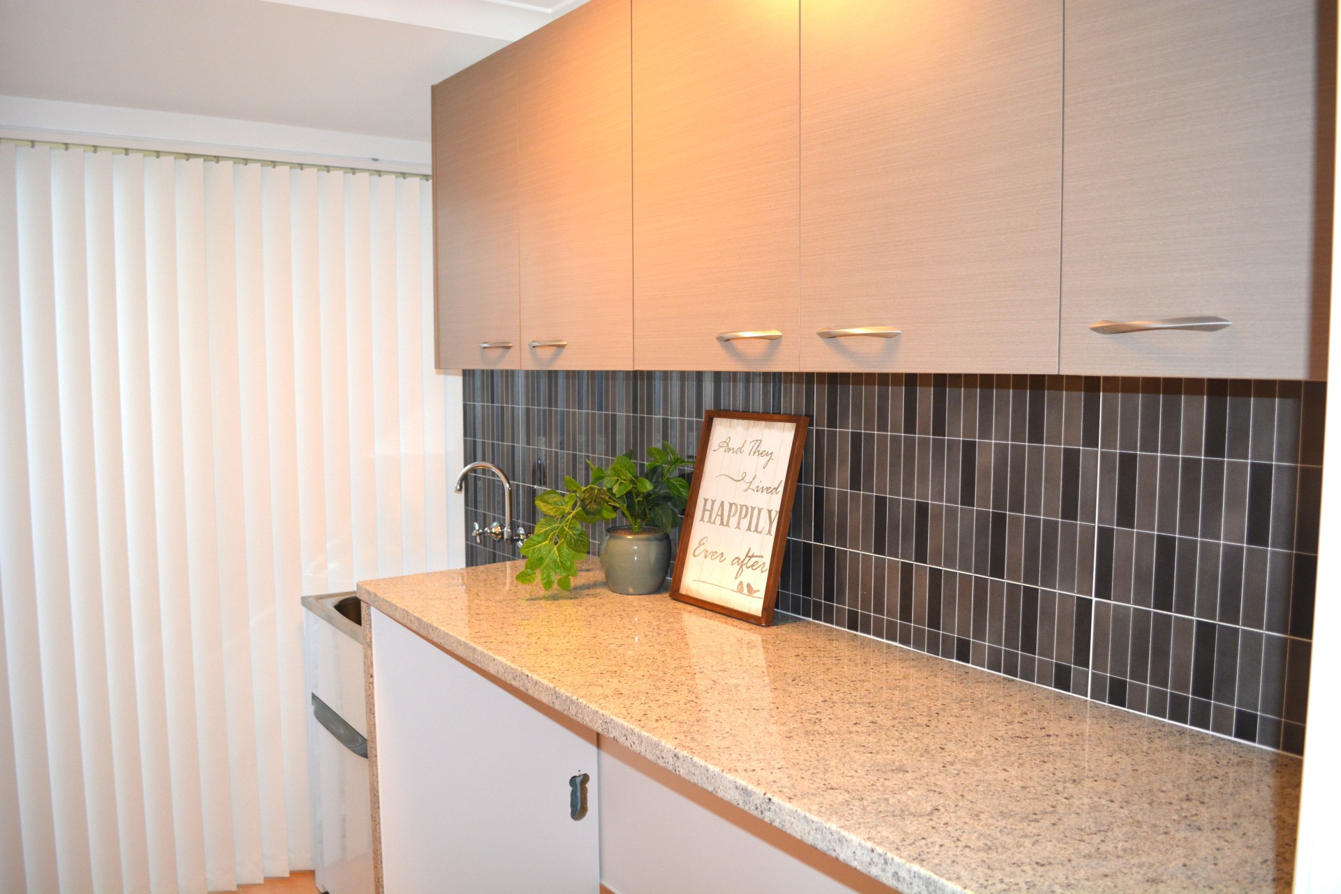 The laundry has been renovated and tiled and has wall cabinets as well as a large walk-in linen cupboard.