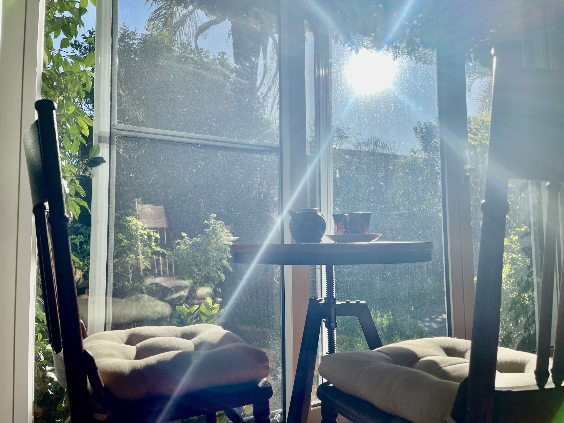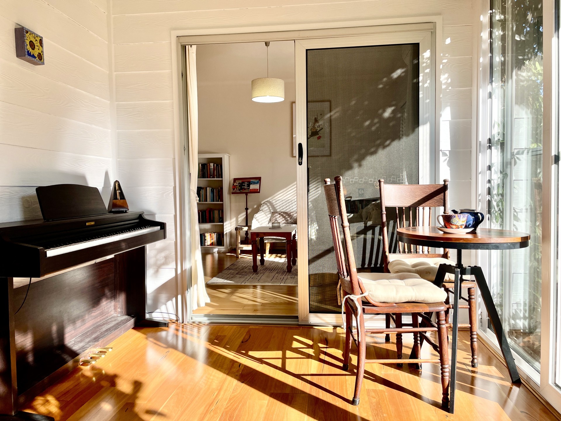 The sunroom and living room are bathed in sun from early morning to early afternoon, then the kitchen is filled with warm afternoon sun until sunset.