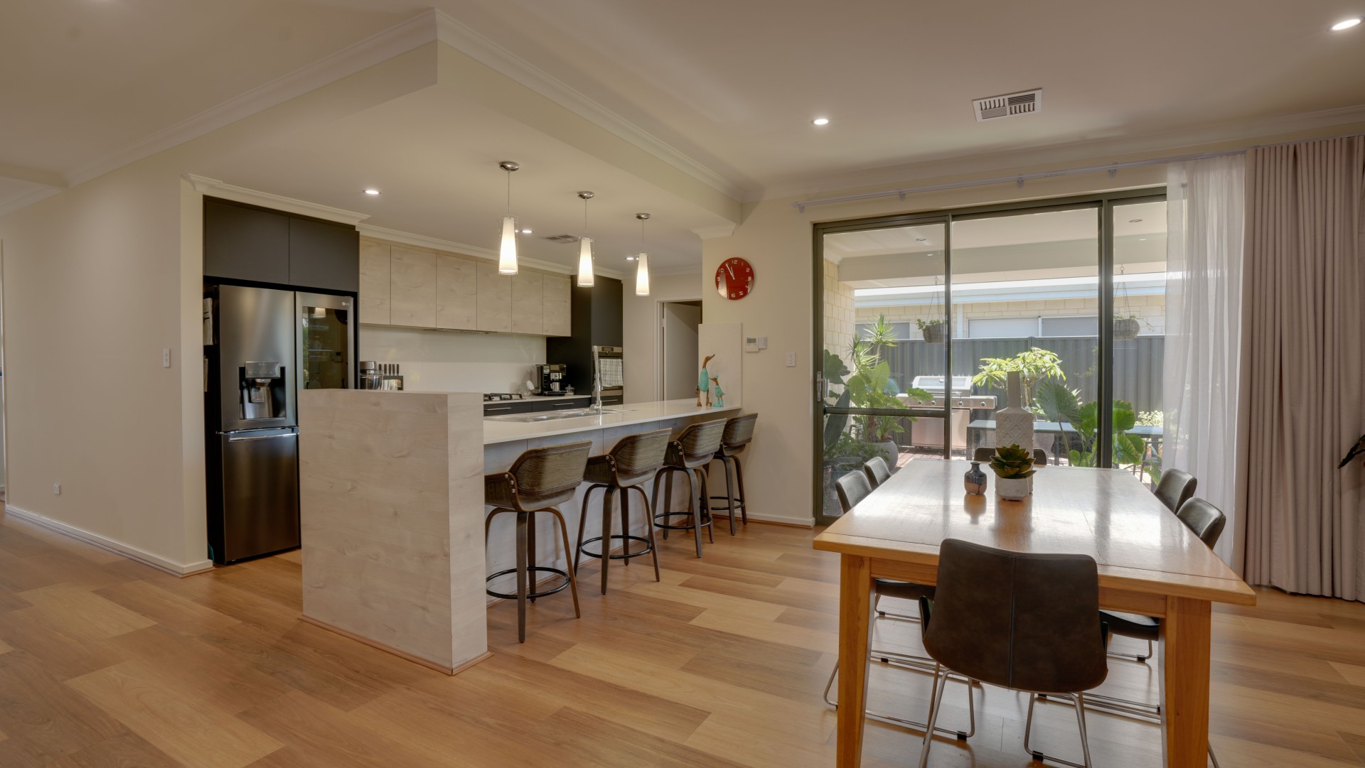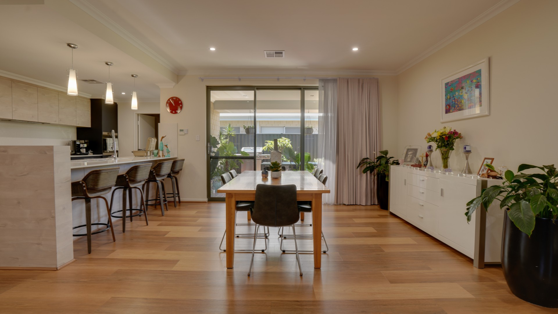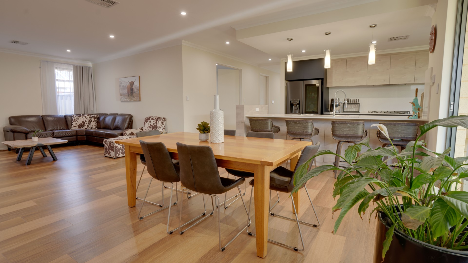 The Spacious Open-plan Living and Dining Room has double glass sliding doors that open to the Alfresco featuring solid wood decking, a perfect space for outdoor entertaining.