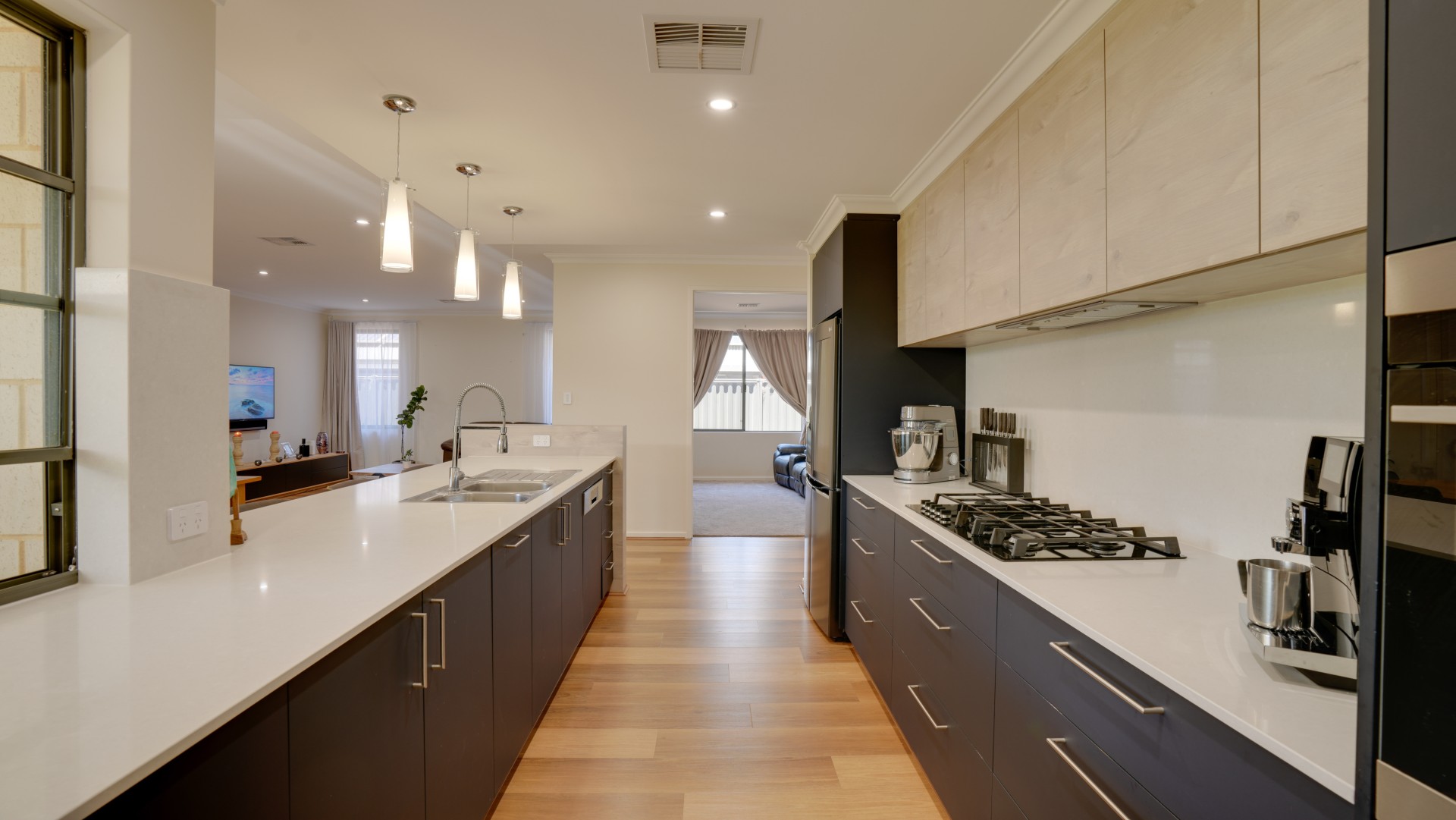 The beautiful Spotted Gum Timber Hybrid Planking flooring throughout gives a touch of style and warmth, luxury top-of-the-range desired elegance carpets to the Grand Master Bedroom and 3 Queen Sized Bedrooms and Theatre Room.