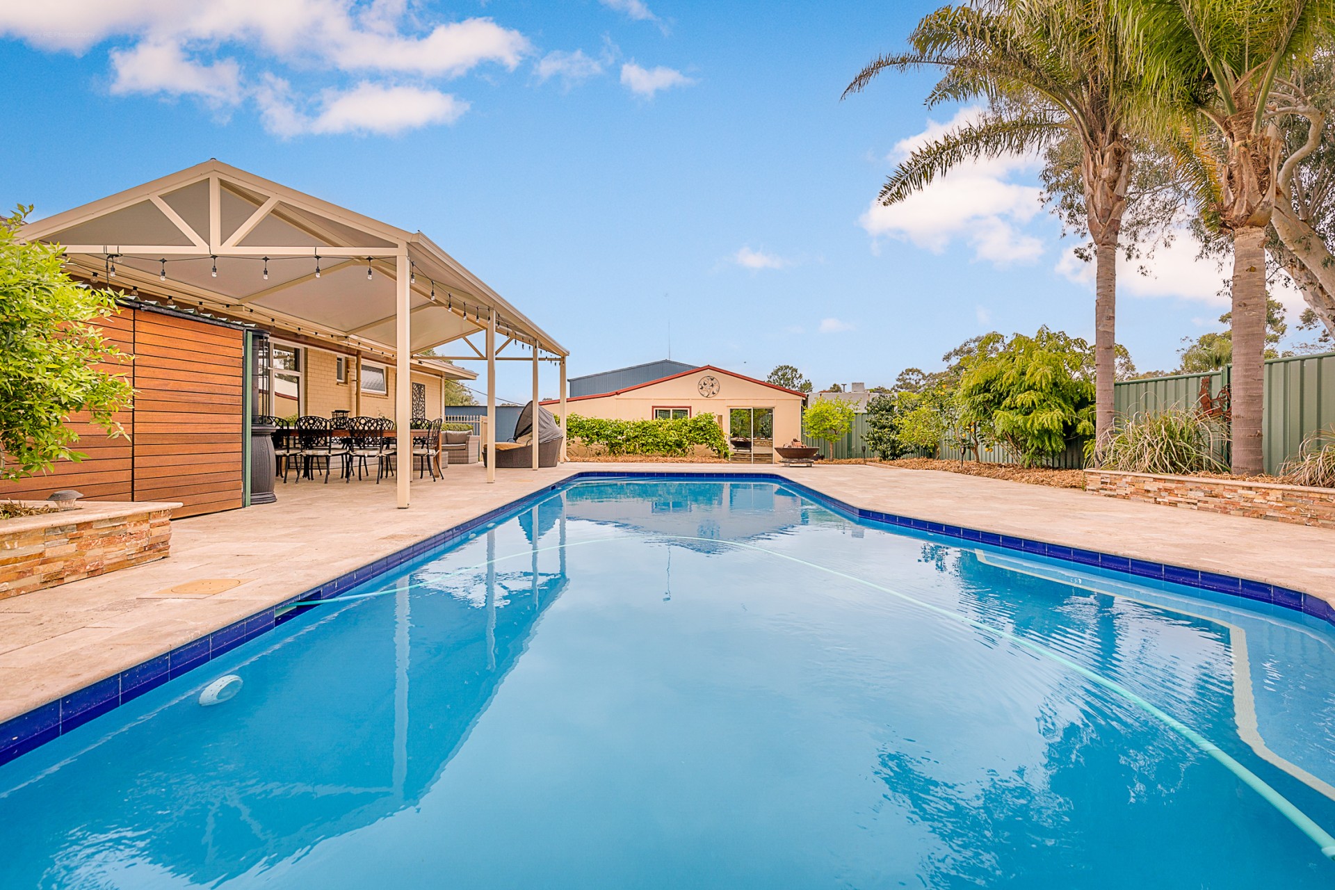 • Concrete pool with travertine paving and alfresco