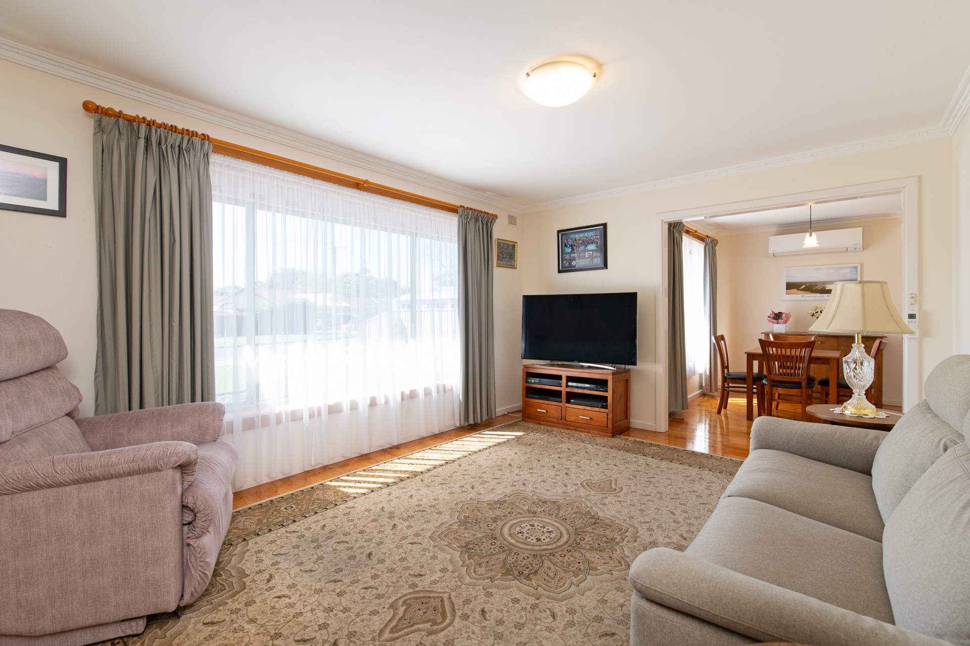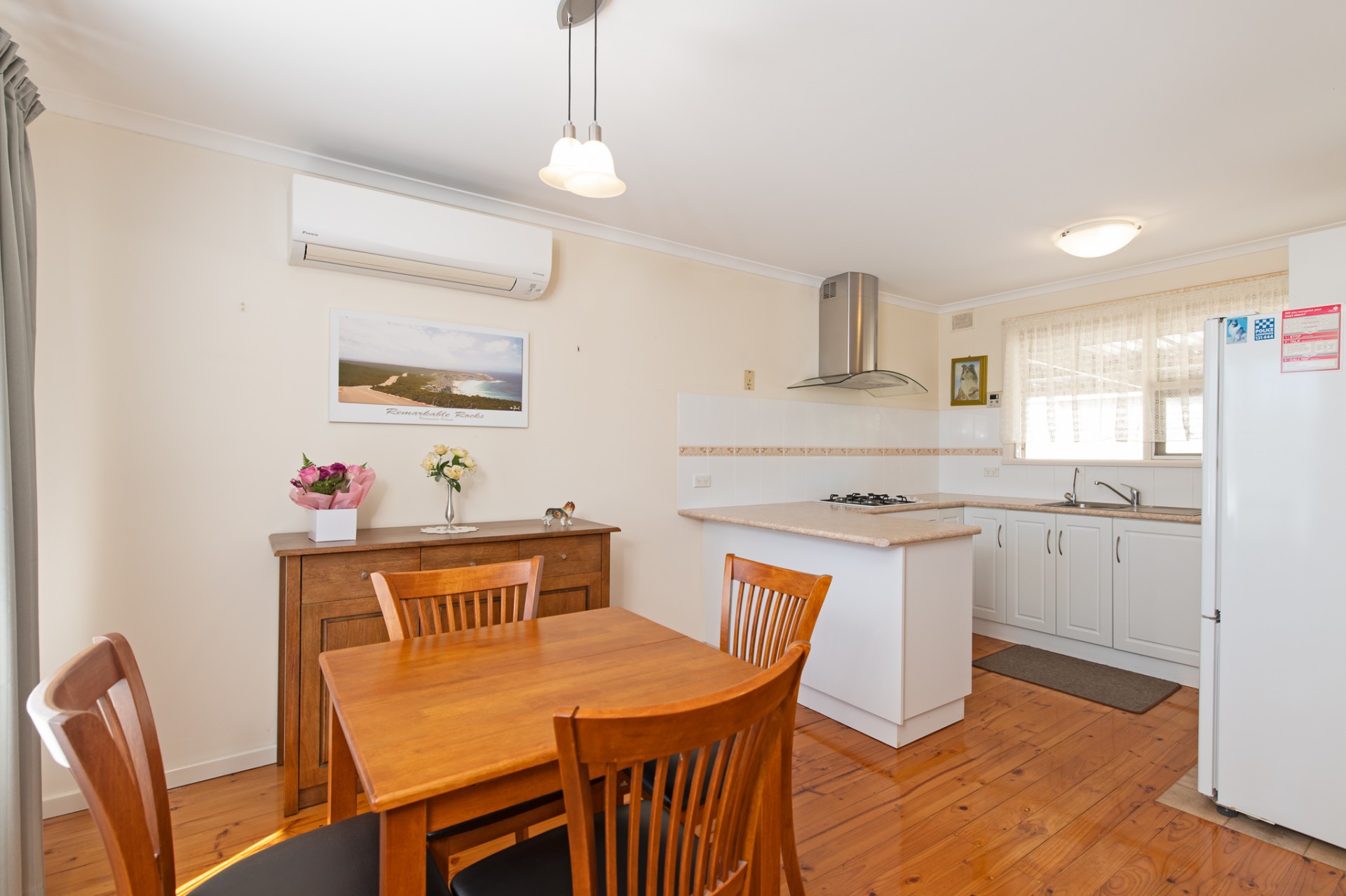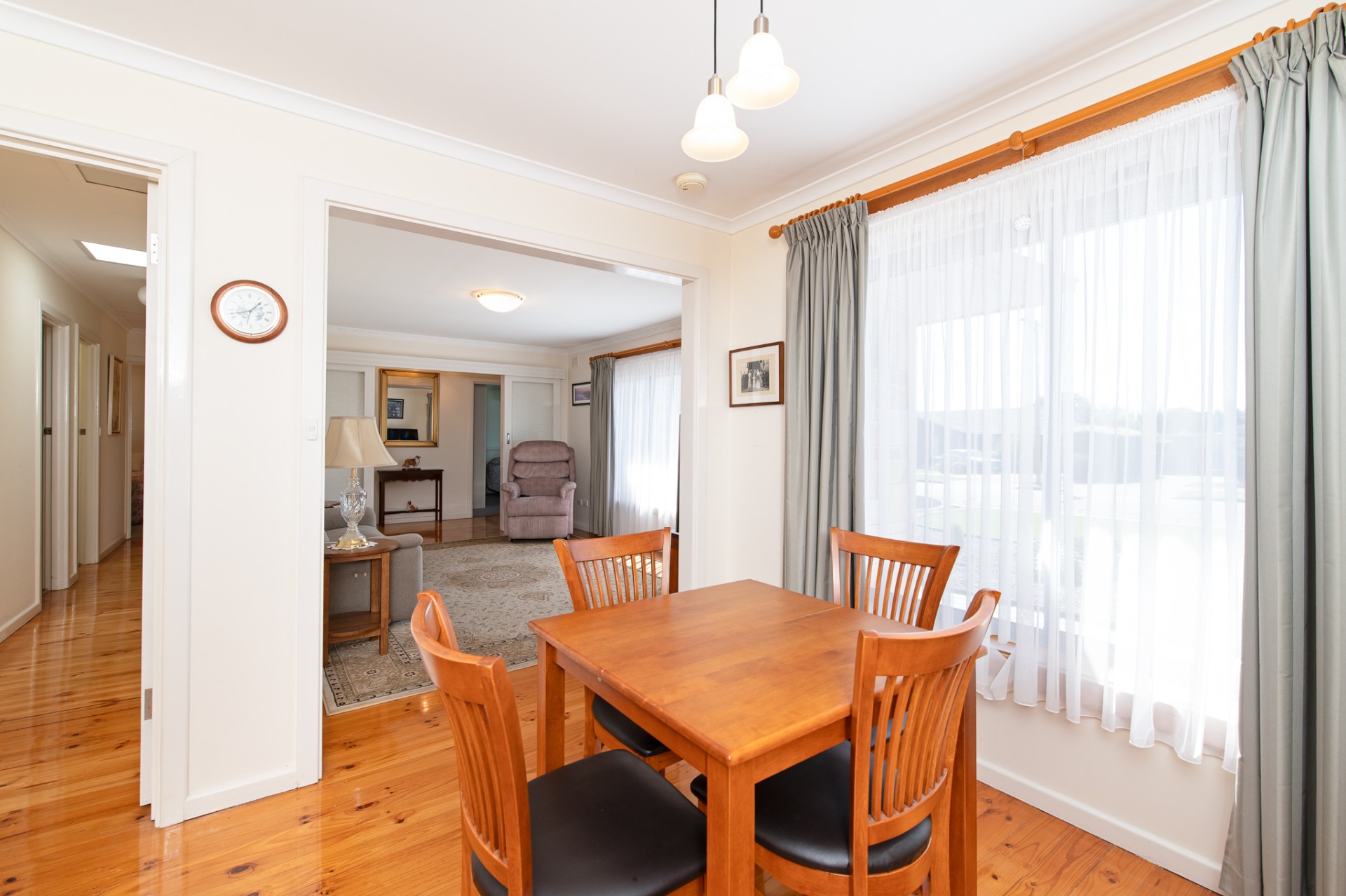 Upon entering, you're greeted by a living room that flows smoothly into the dining area, setting up an interconnecting environment for family meals and catch-ups with friends. Adjacent to the dining room is an open-plan kitchen, made more functional by a breakfast bar that effectively delineates the space, making meal preparation and conversation easy. The three spacious bedrooms share a recently updated bathroom with floor-to-ceiling tiles and a four-lamp heat/fan combo.