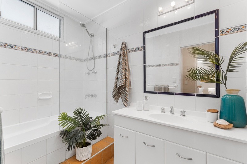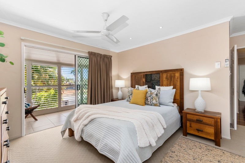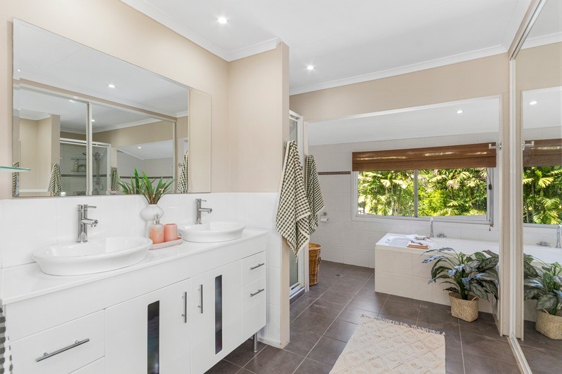 The master bedroom is abundant with natural light and an impressive elevated outlook over the rear of the property from the spa plunge bath, and to the front from the private plantation shuttered balcony. Of the other four bedrooms, two are double sized with built-in robes, and another is currently being used as a home office but could be a nursery or playroom to suit a growing family. All are air-conditioned and have ceiling fans.