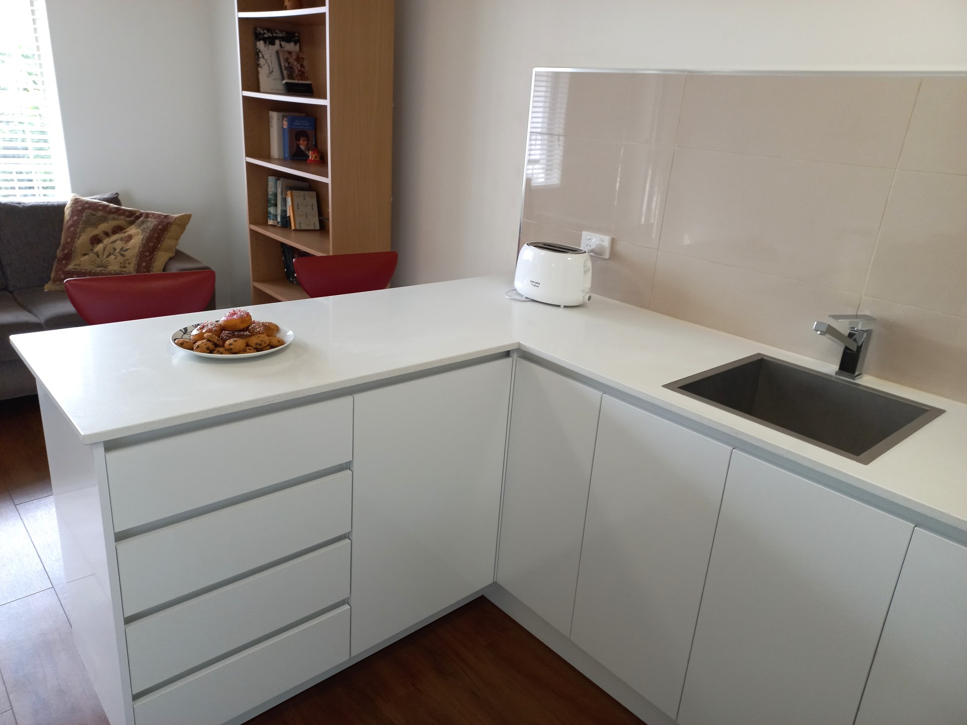 - white gloss melamine kitchen cabinets with "intense white" Caesarstone benchtop;