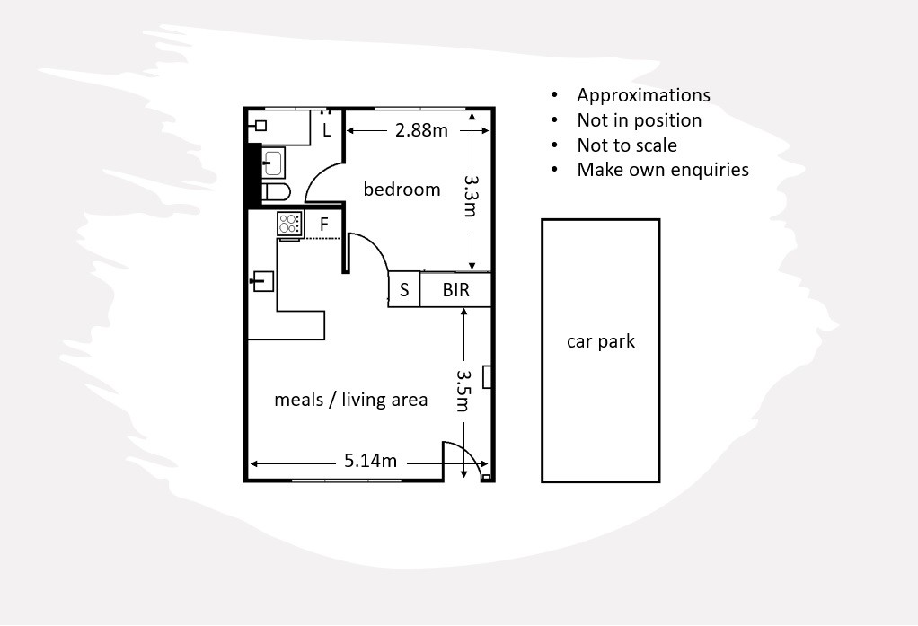 The apartment comes with a car park (visible from the city-facing bedroom window), and features: