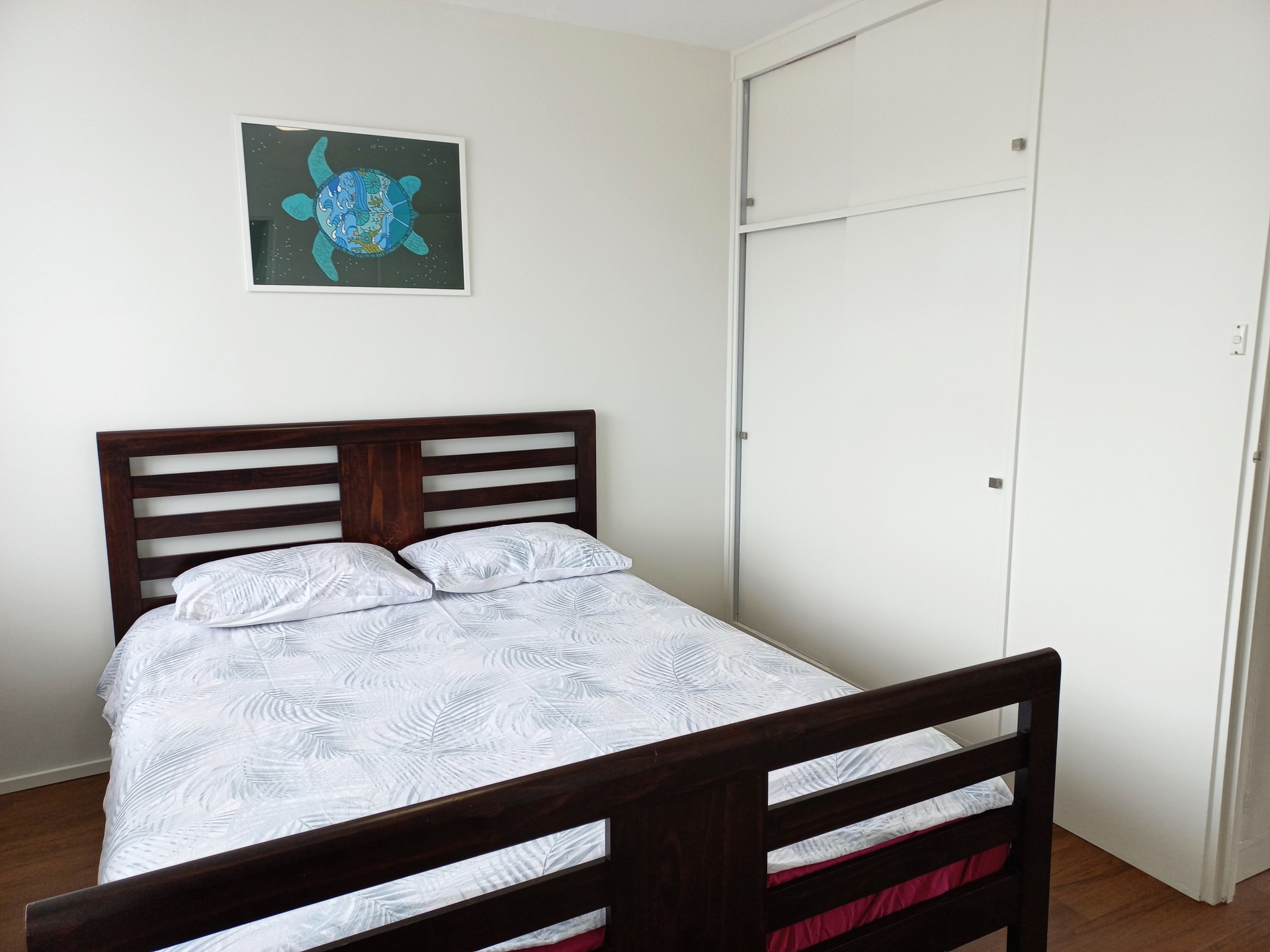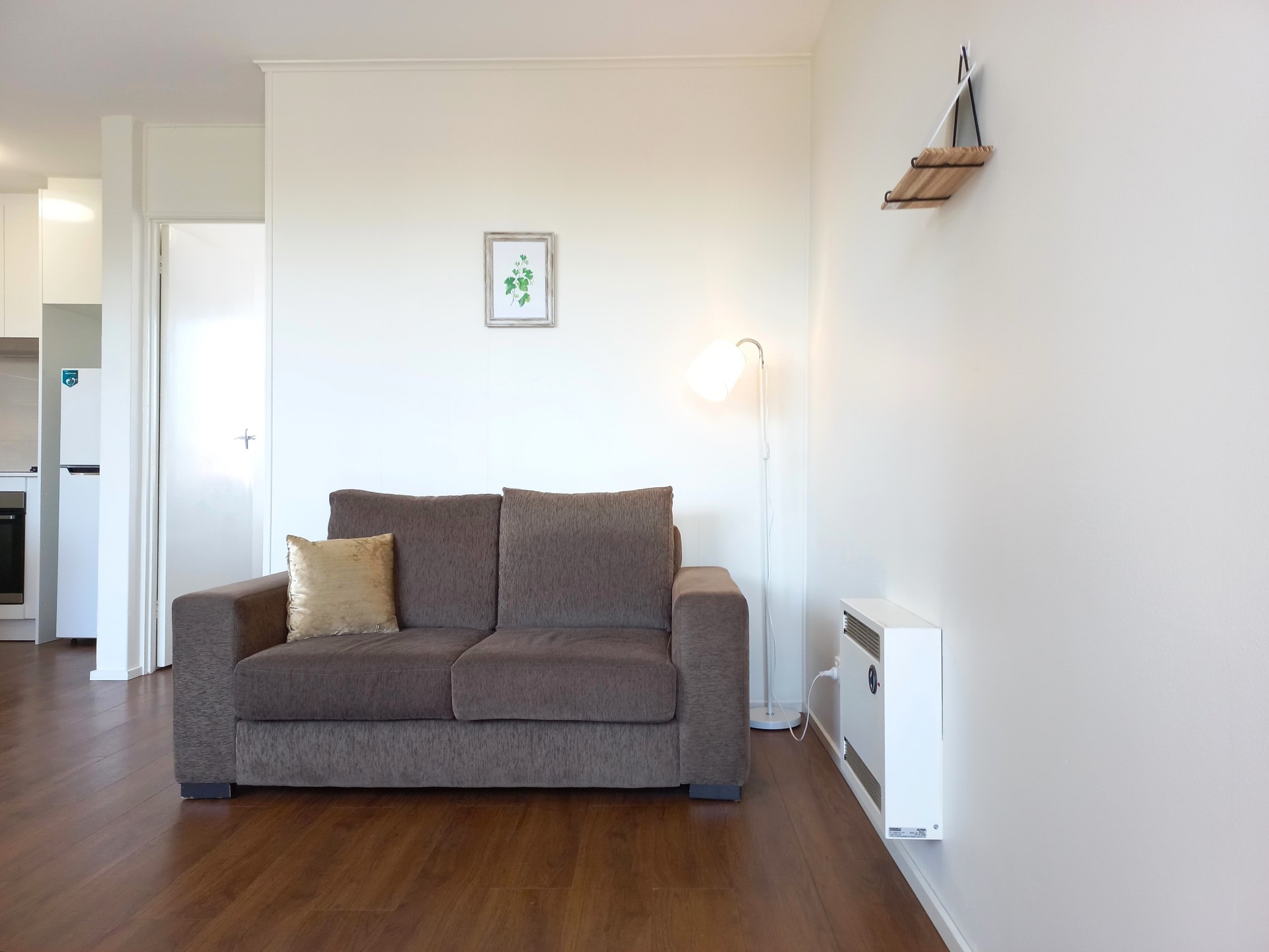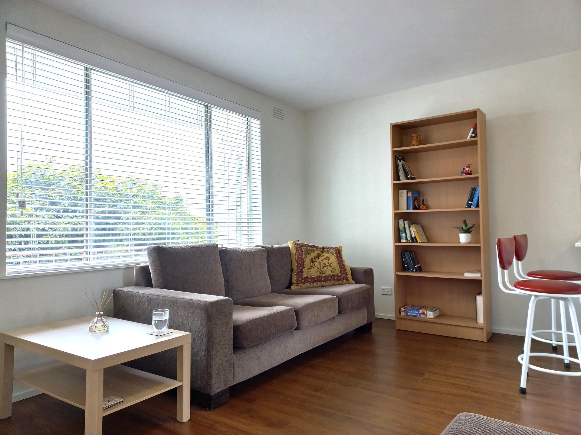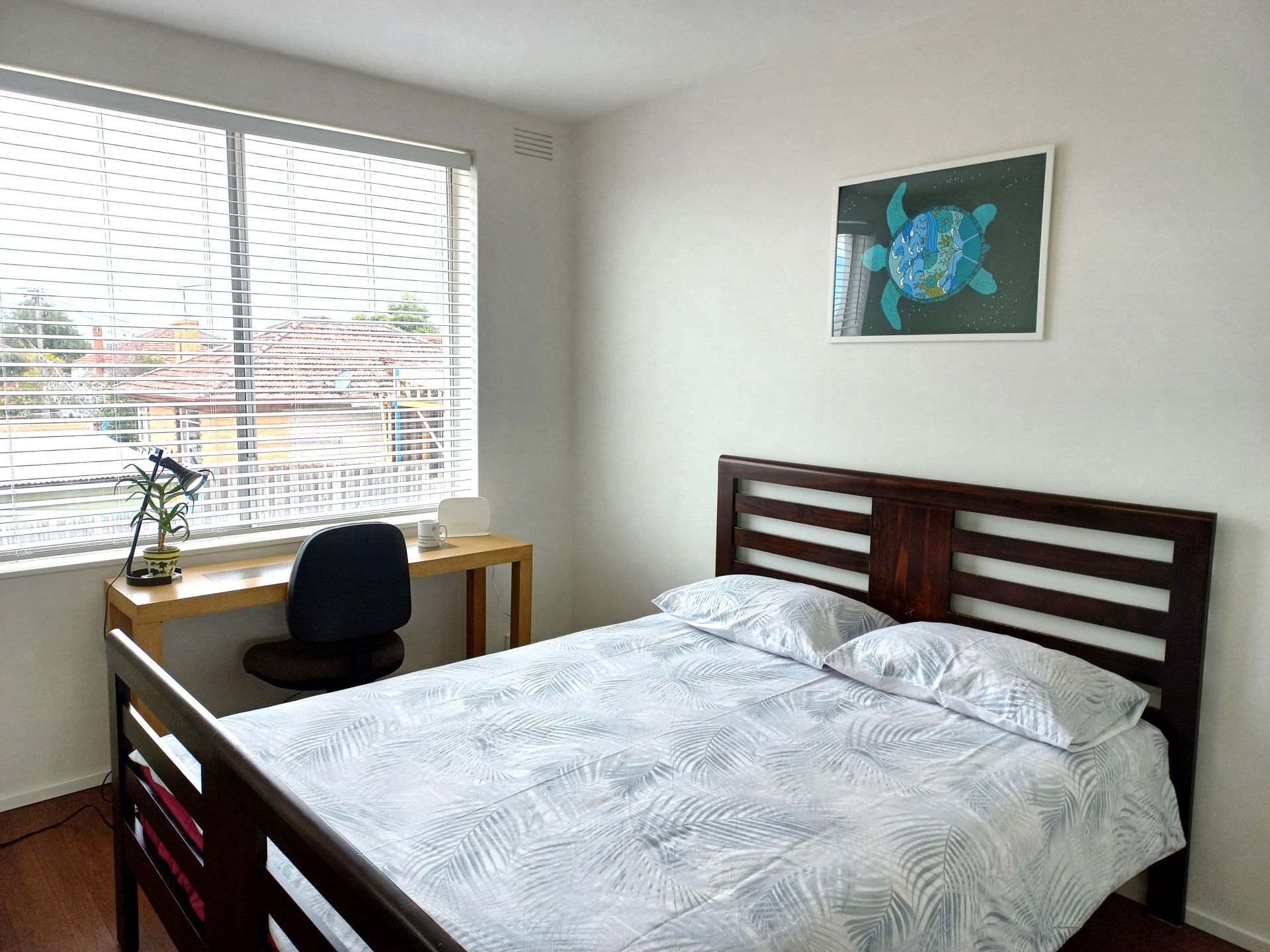 - white 50mm-slat venetian blinds in the bedroom and the living area;