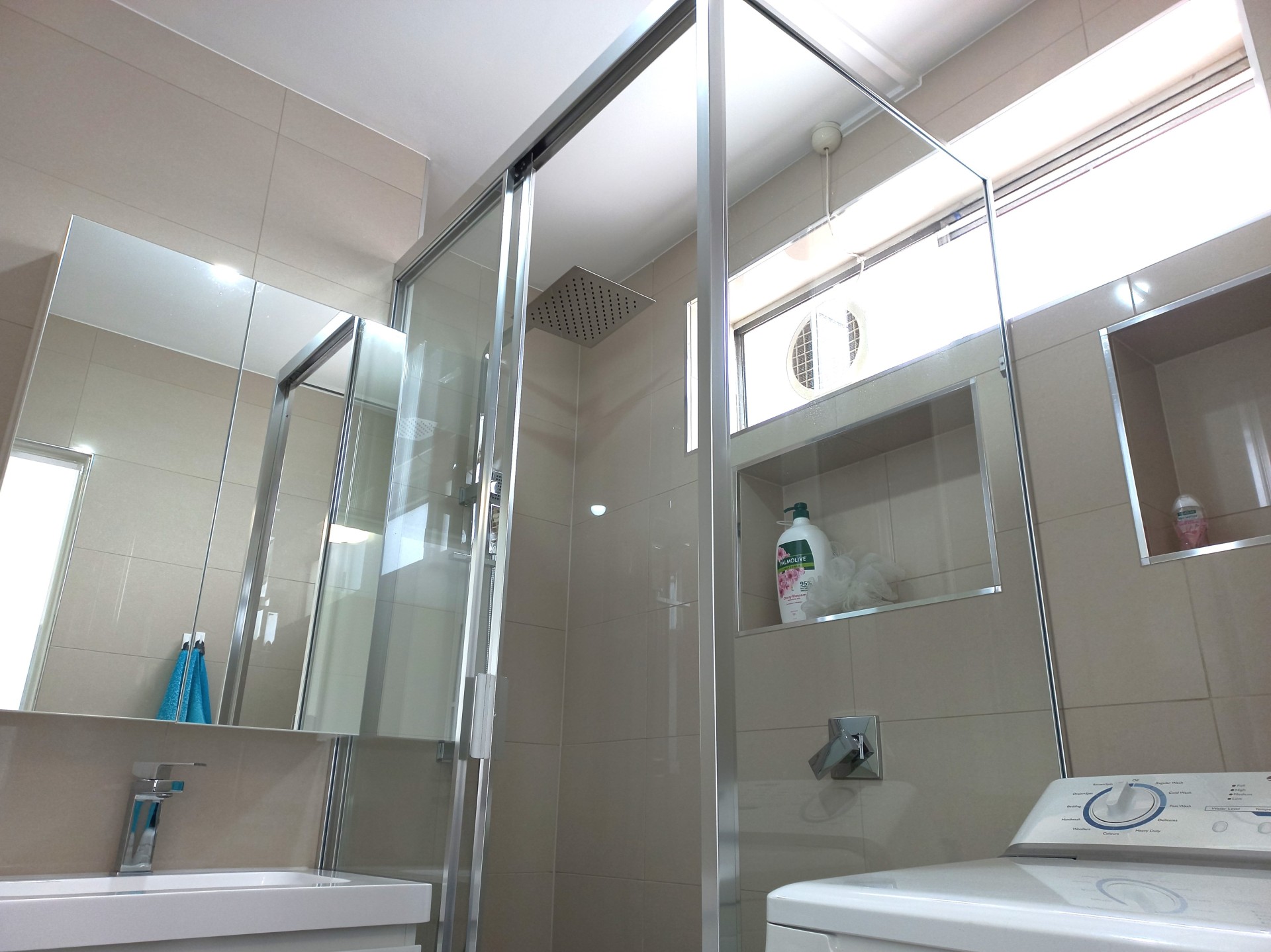 - a fully framed shower with a sliding door and a square shower head; and
