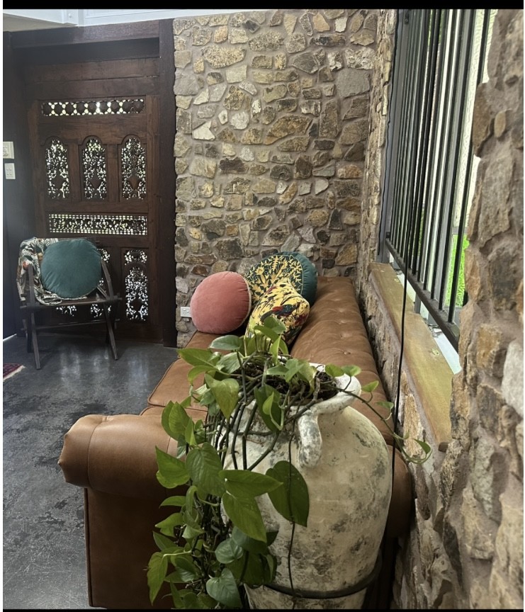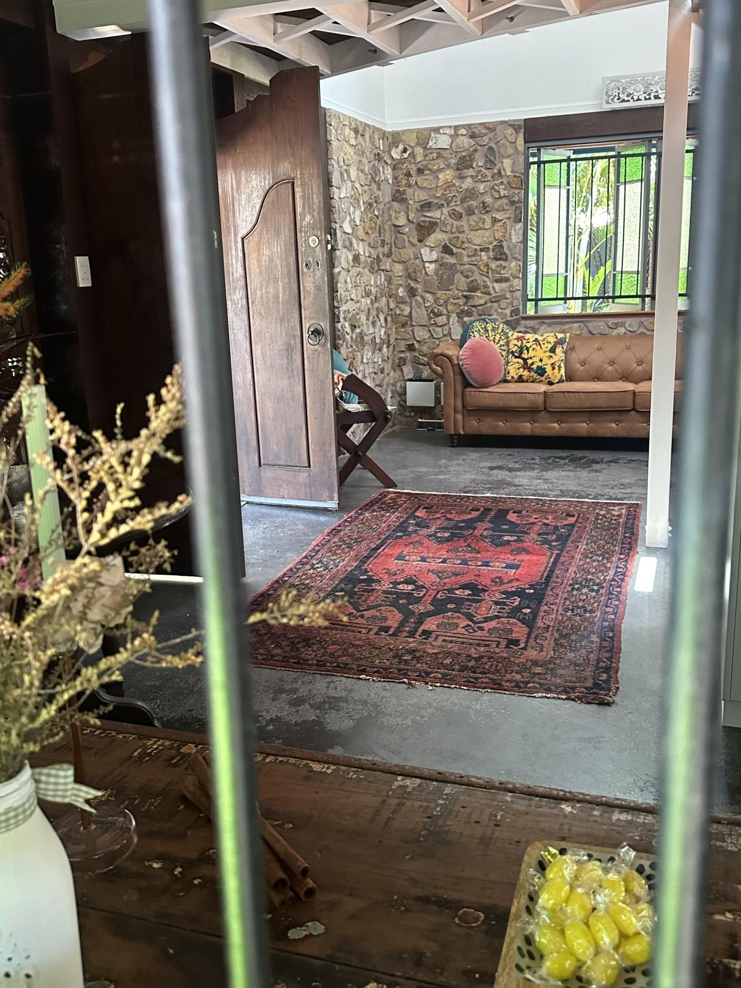 The magnificent Balinese styled timber double doors embellish the entrance while opening in to the open plan dining/living space adorned with easy care polished concrete floor and exposed stone walls.