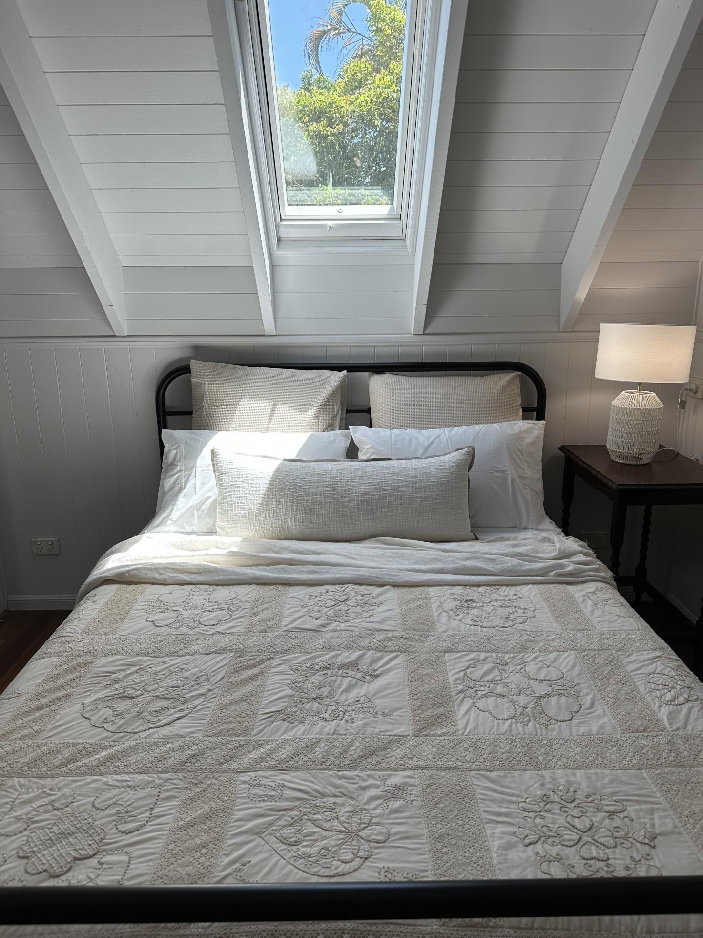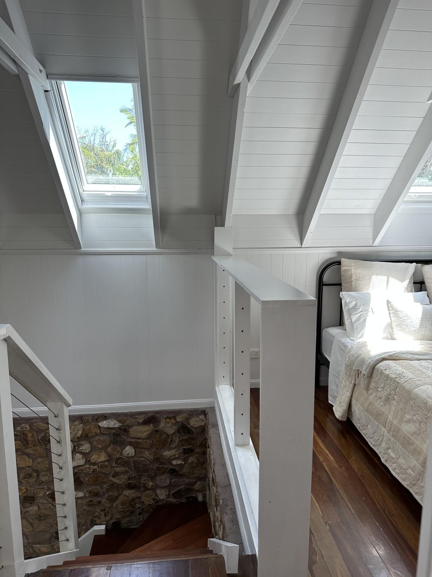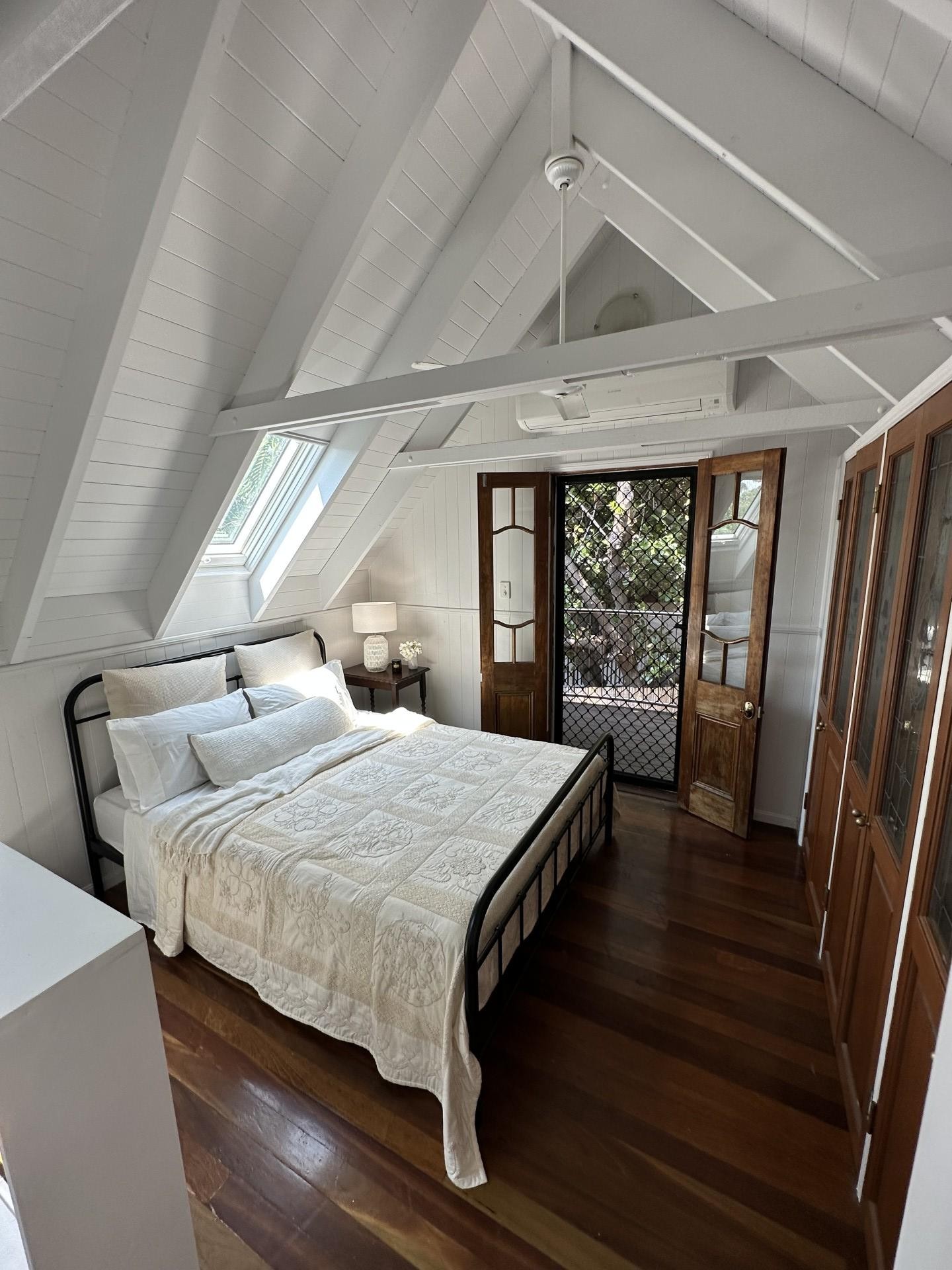 The main bedroom is very light and airy and occupies the second level, it features a sky light window above the bed, polished timber floors, a wall to wall built in wardrobe and charming French doors which open onto its own private treetop balcony. All kept cool in the summer months with a split system air-conditioner and ceiling fan.