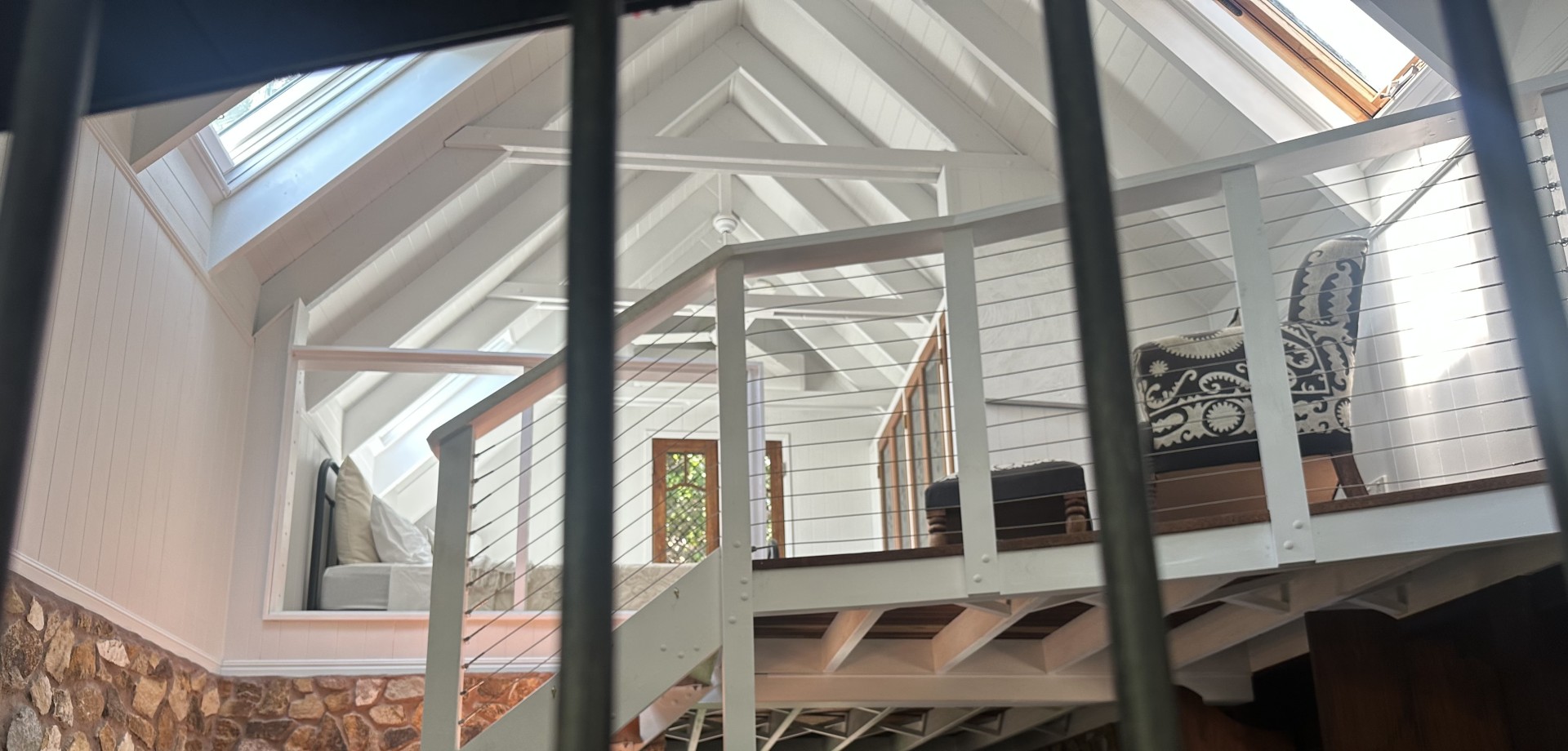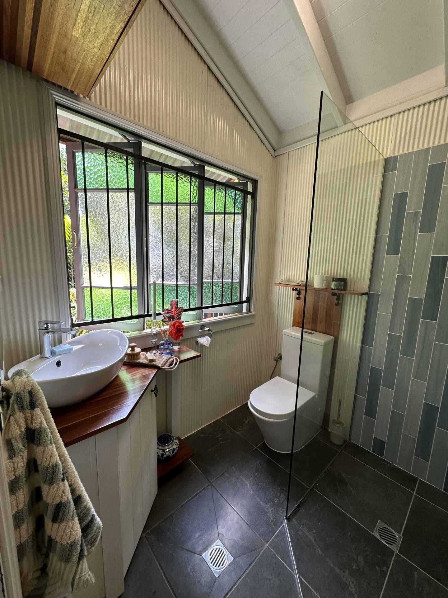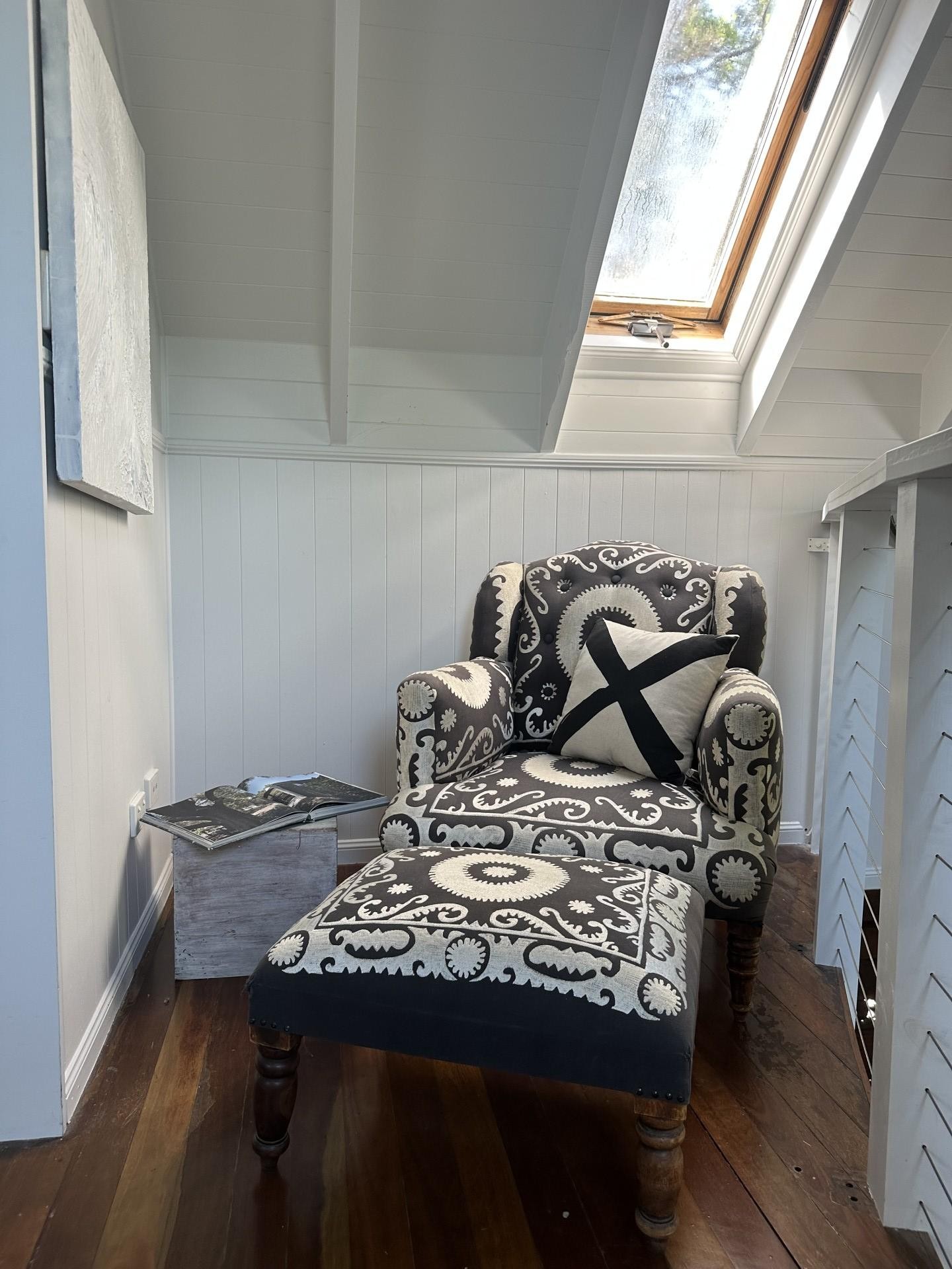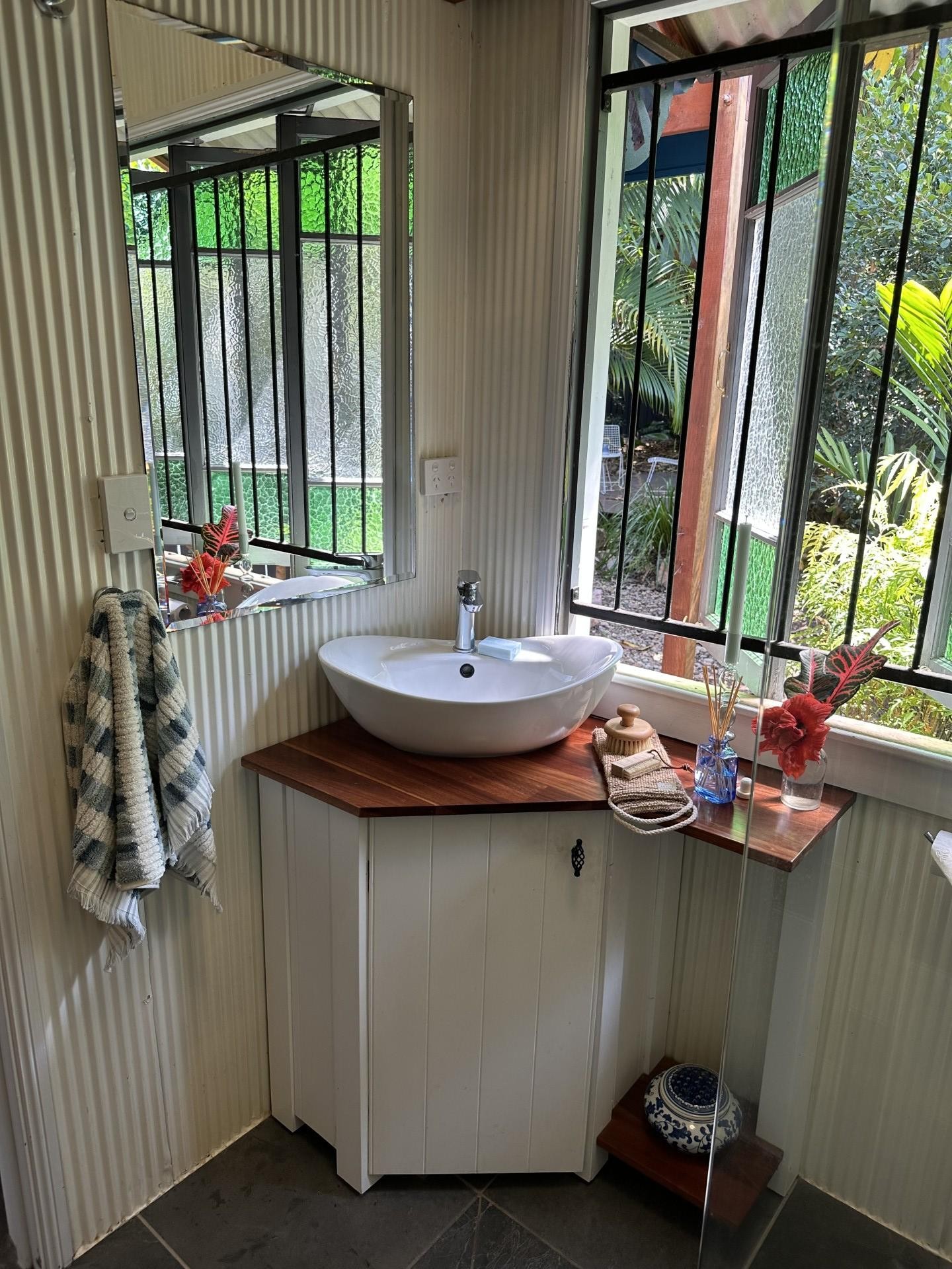 The main bedroom is very light and airy and occupies the second level, it features a sky light window above the bed, polished timber floors, a wall to wall built in wardrobe and charming French doors which open onto its own private treetop balcony. All kept cool in the summer months with a split system air-conditioner and ceiling fan.